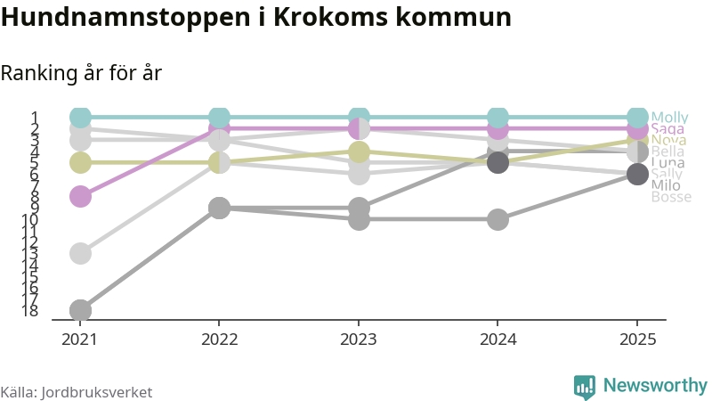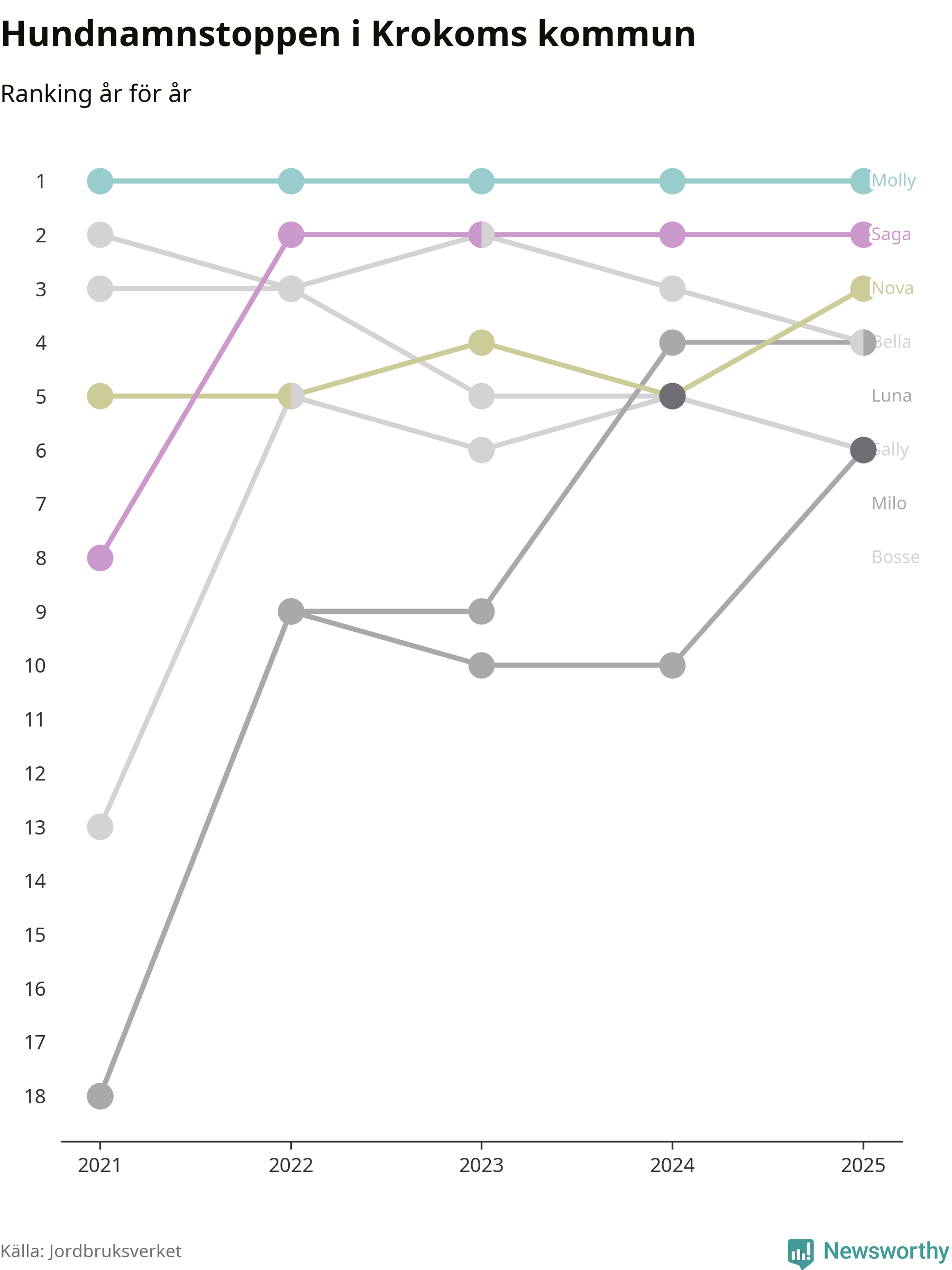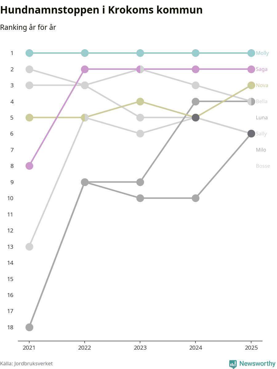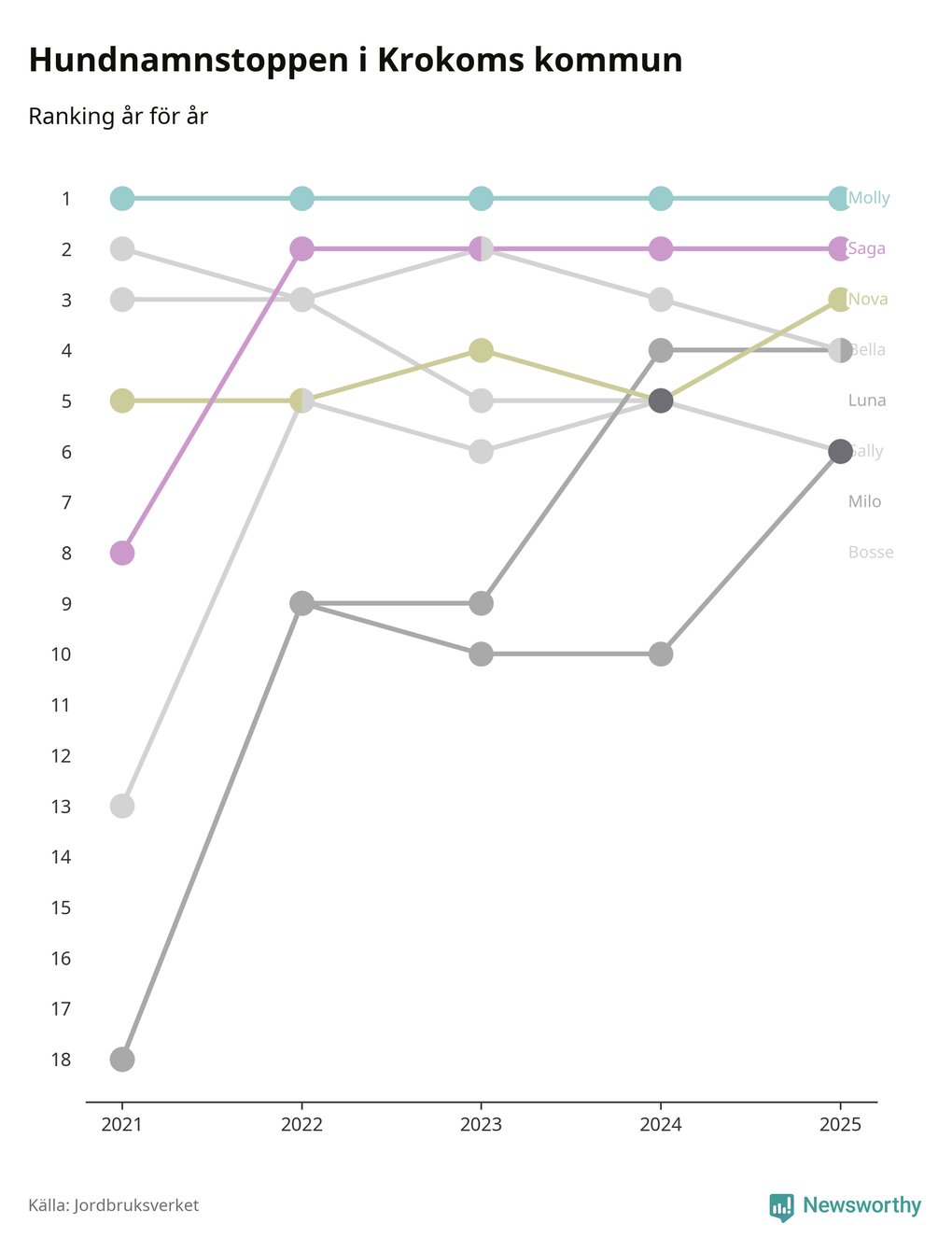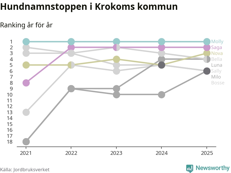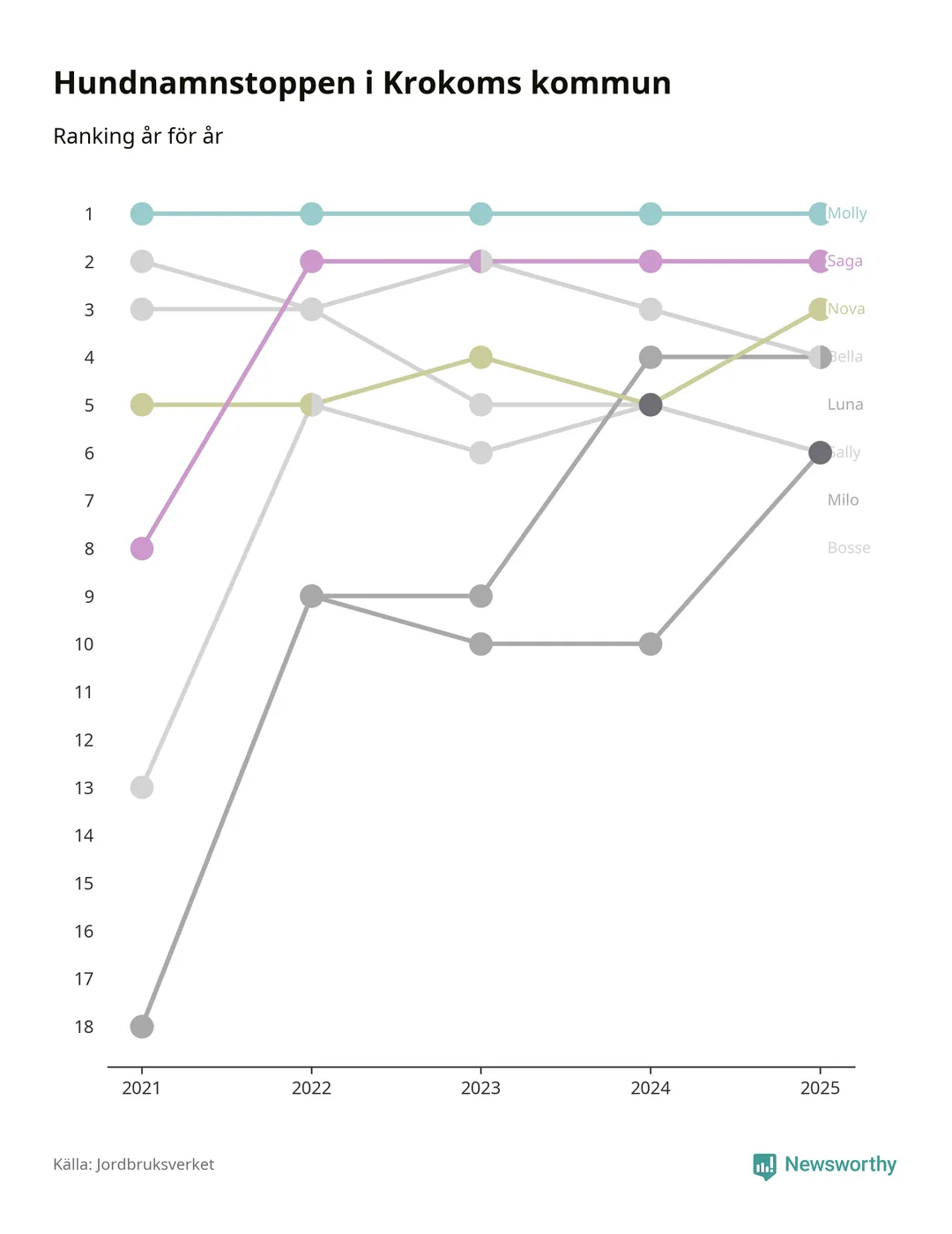 Molly toppar hundnamnsligan i Krokoms kommun, precis som i landet som helhet. Det visar färsk statistik från Jordbruksverket. Här finns hela topplistan för kommunen.