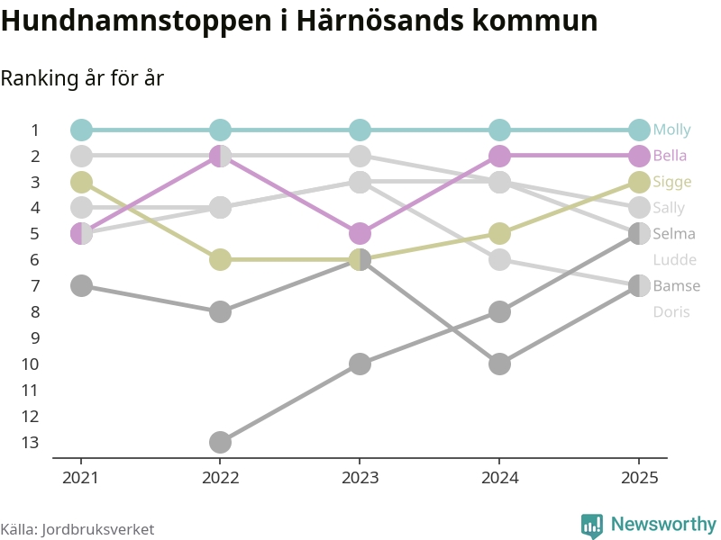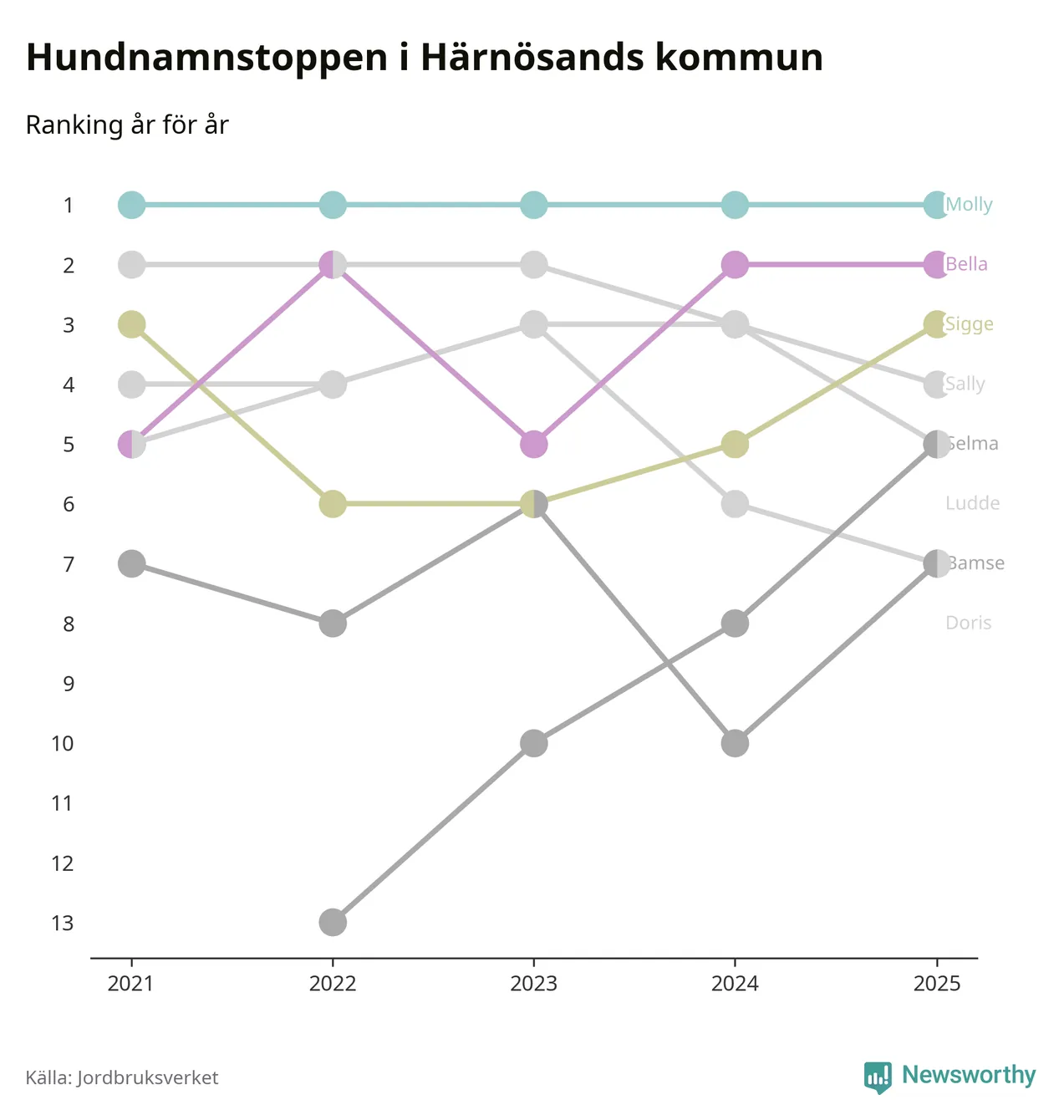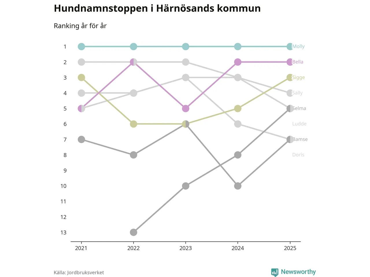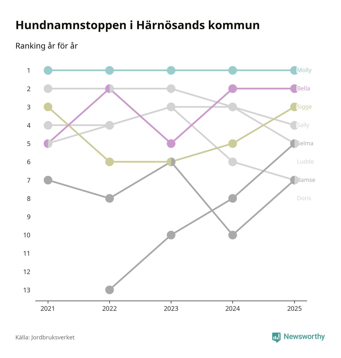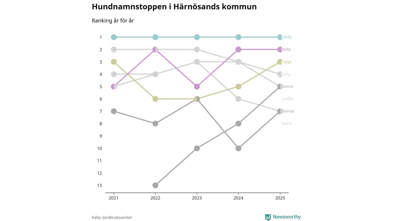 Molly toppar hundnamnsligan i Härnösands kommun, precis som i landet som helhet. Det visar färsk statistik från Jordbruksverket. Här finns hela topplistan för kommunen.