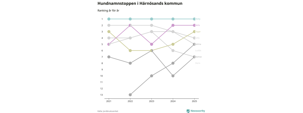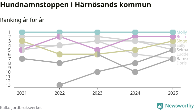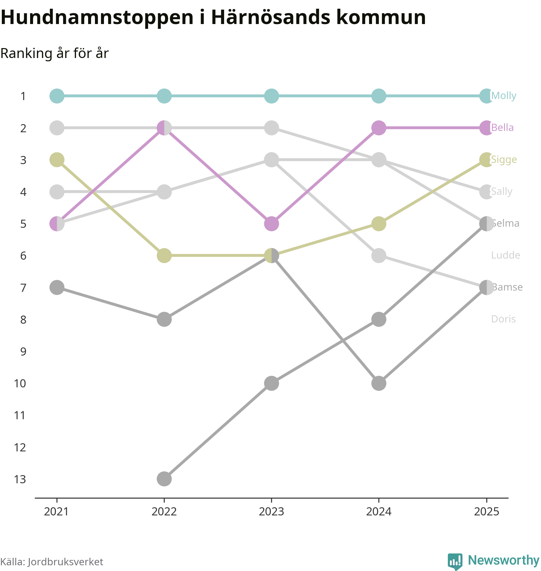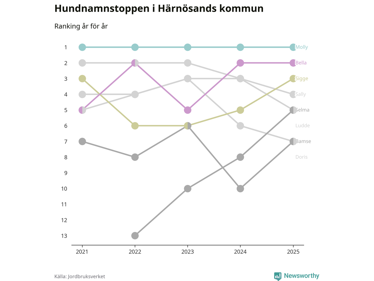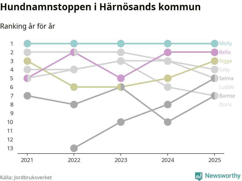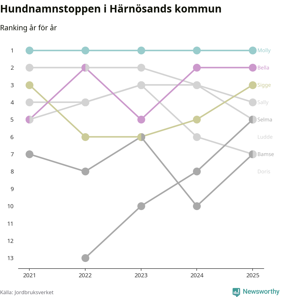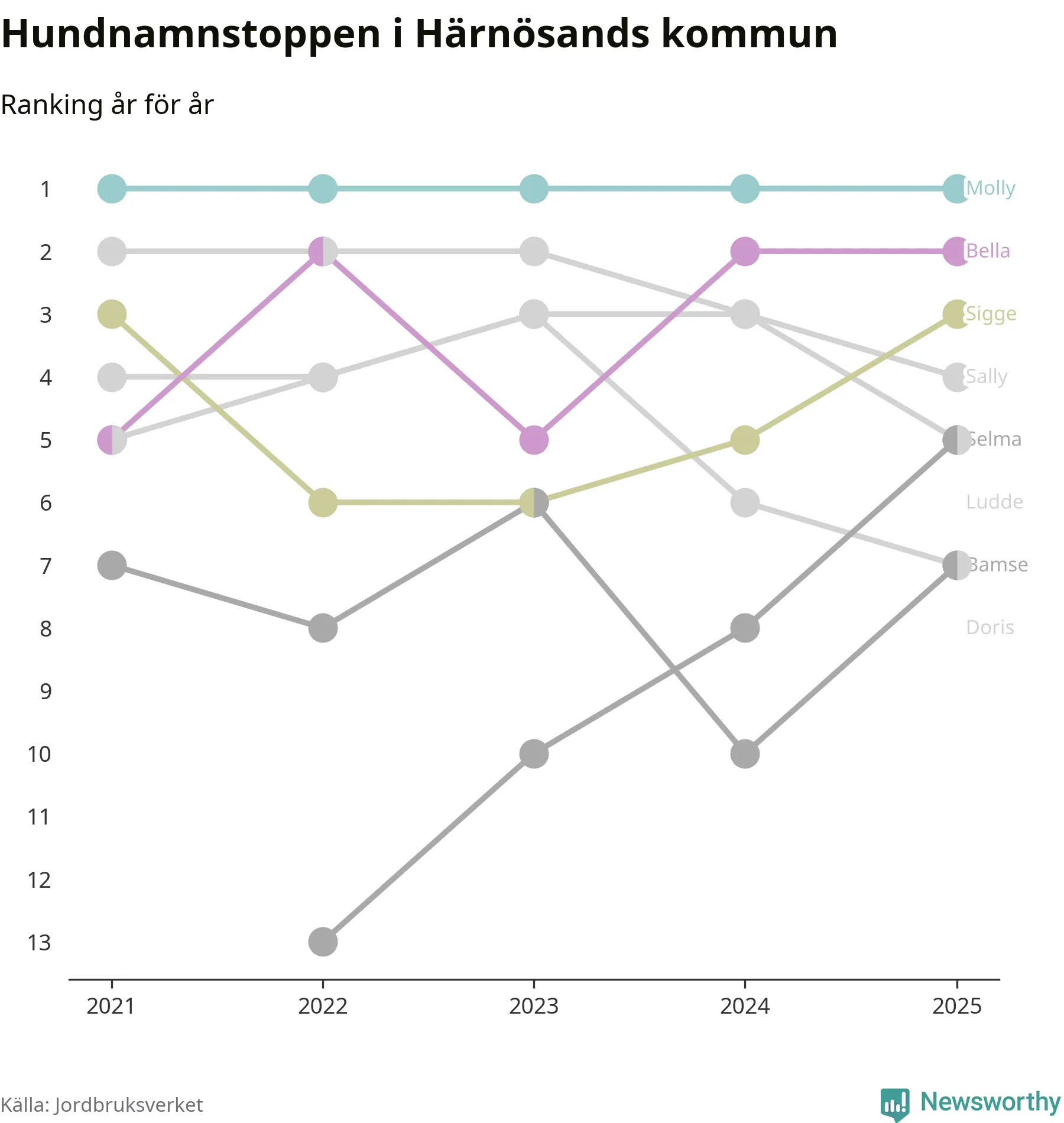 Molly toppar hundnamnsligan i Härnösands kommun, precis som i landet som helhet. Det visar färsk statistik från Jordbruksverket. Här finns hela topplistan för kommunen.