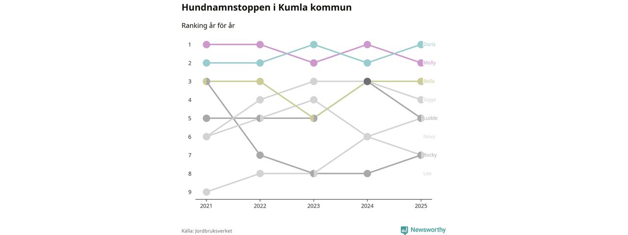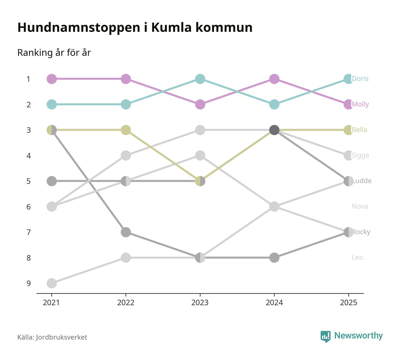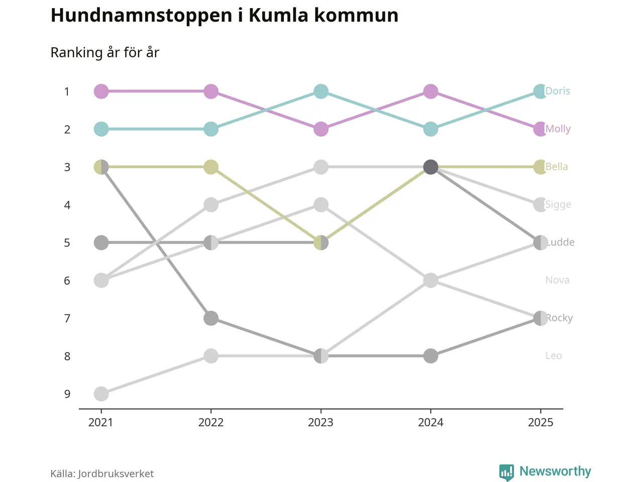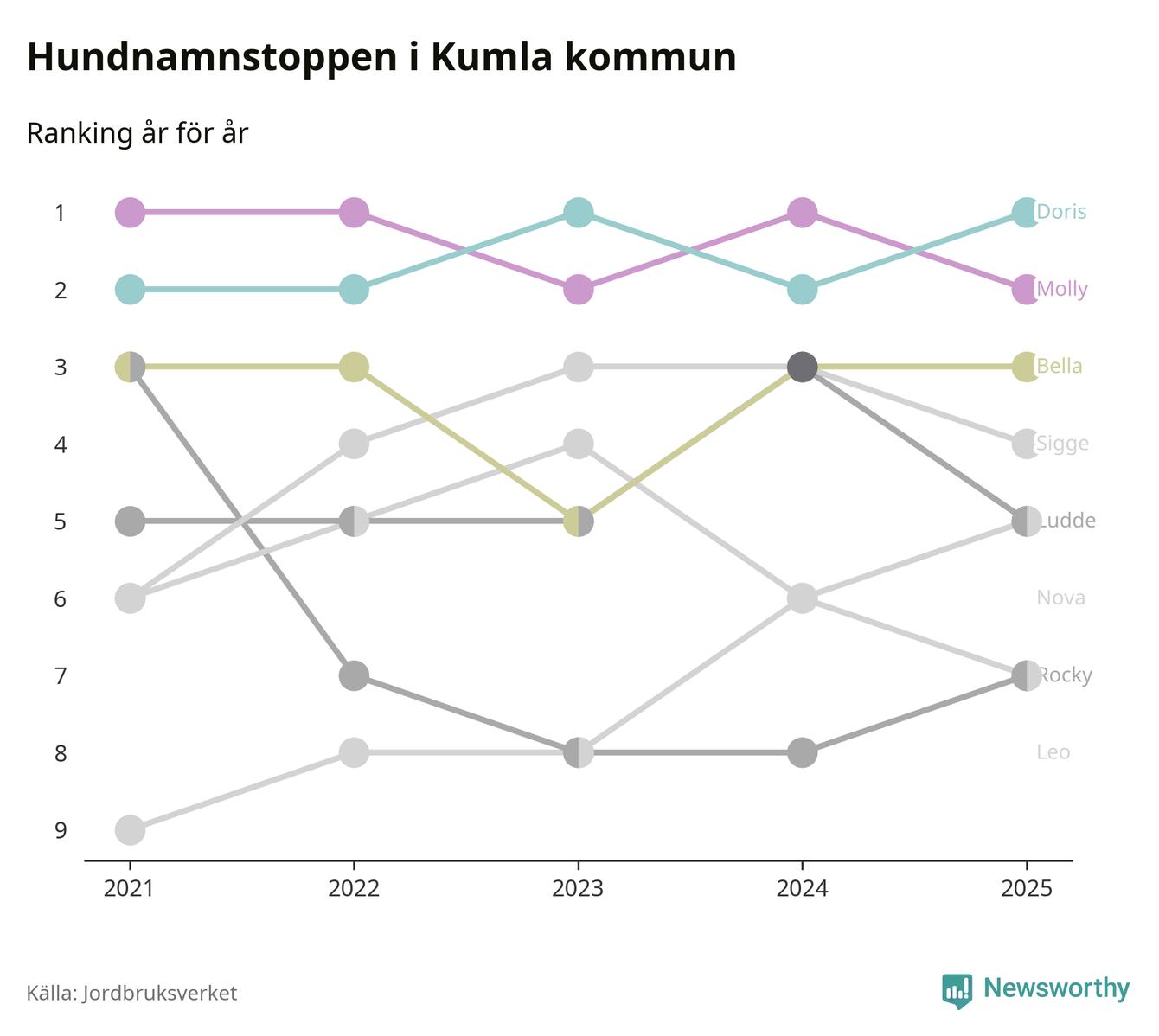 Molly är fortsatt ohotad etta bland hundnamnen i Sverige, följt av Bella och Charlie. Så har det sett ut flera år i rad, men bland Kumlahundarna är Doris populärast. Det gör Kumla till en av få kommuner i landet där toppnamnet inte hör till de tre vanligaste (Molly, Bella eller Charlie).