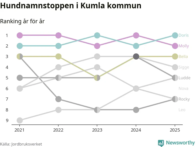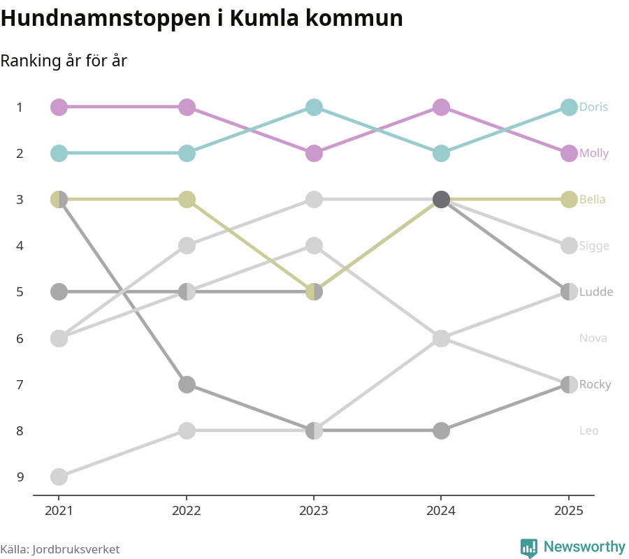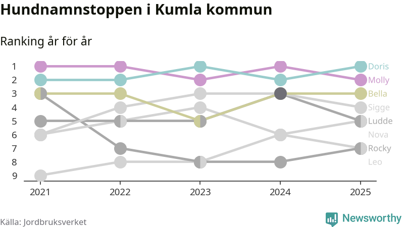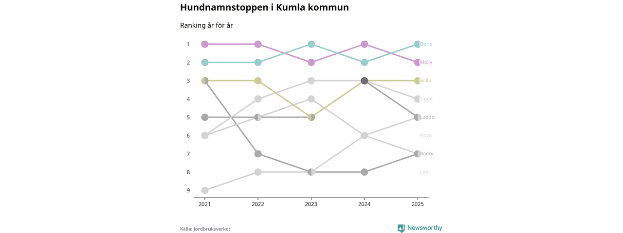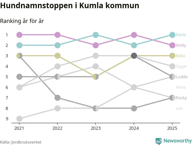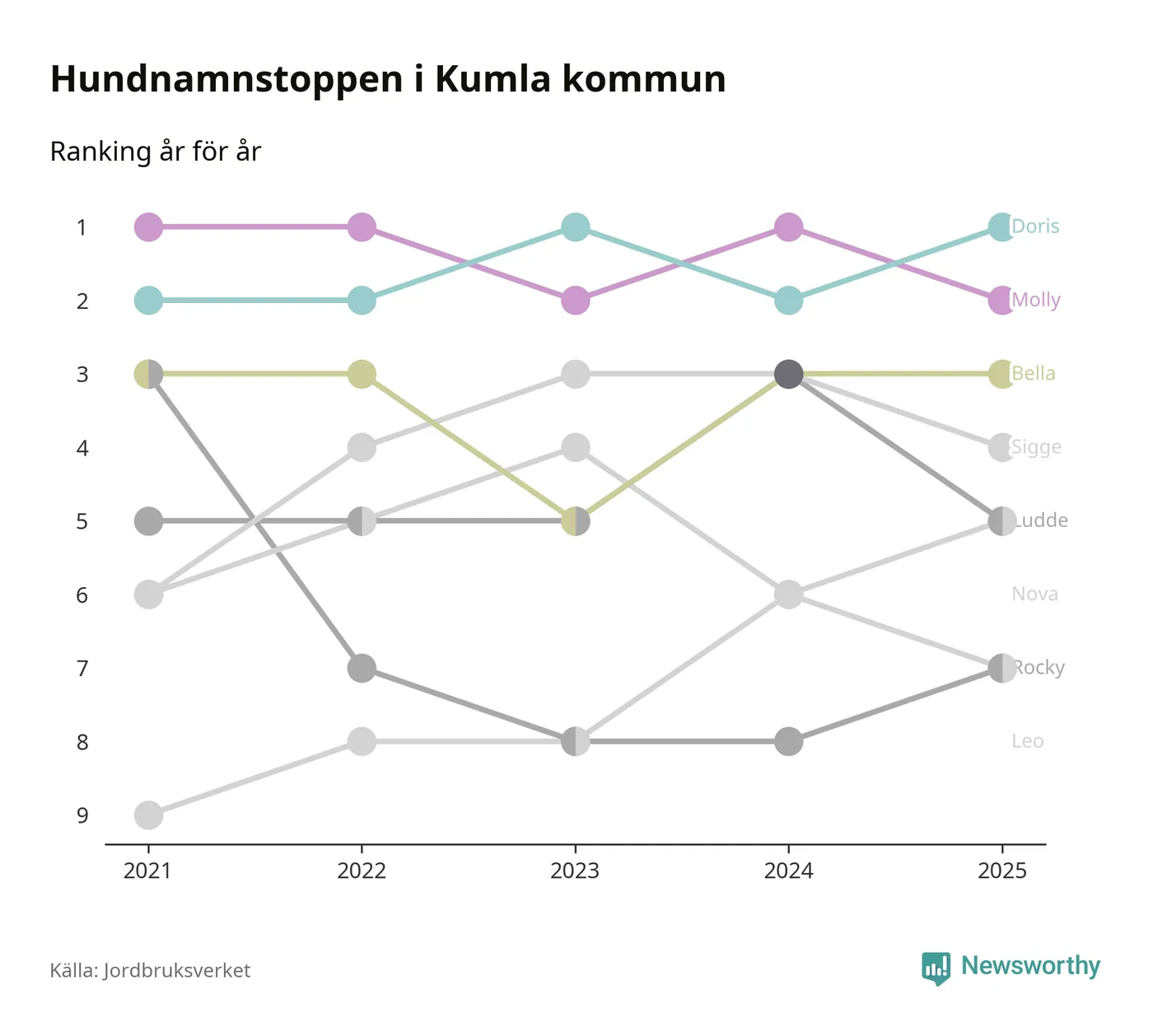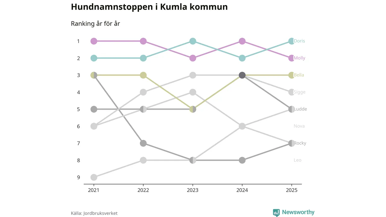 Molly är fortsatt ohotad etta bland hundnamnen i Sverige, följt av Bella och Charlie. Så har det sett ut flera år i rad, men bland Kumlahundarna är Doris populärast. Det gör Kumla till en av få kommuner i landet där toppnamnet inte hör till de tre vanligaste (Molly, Bella eller Charlie).