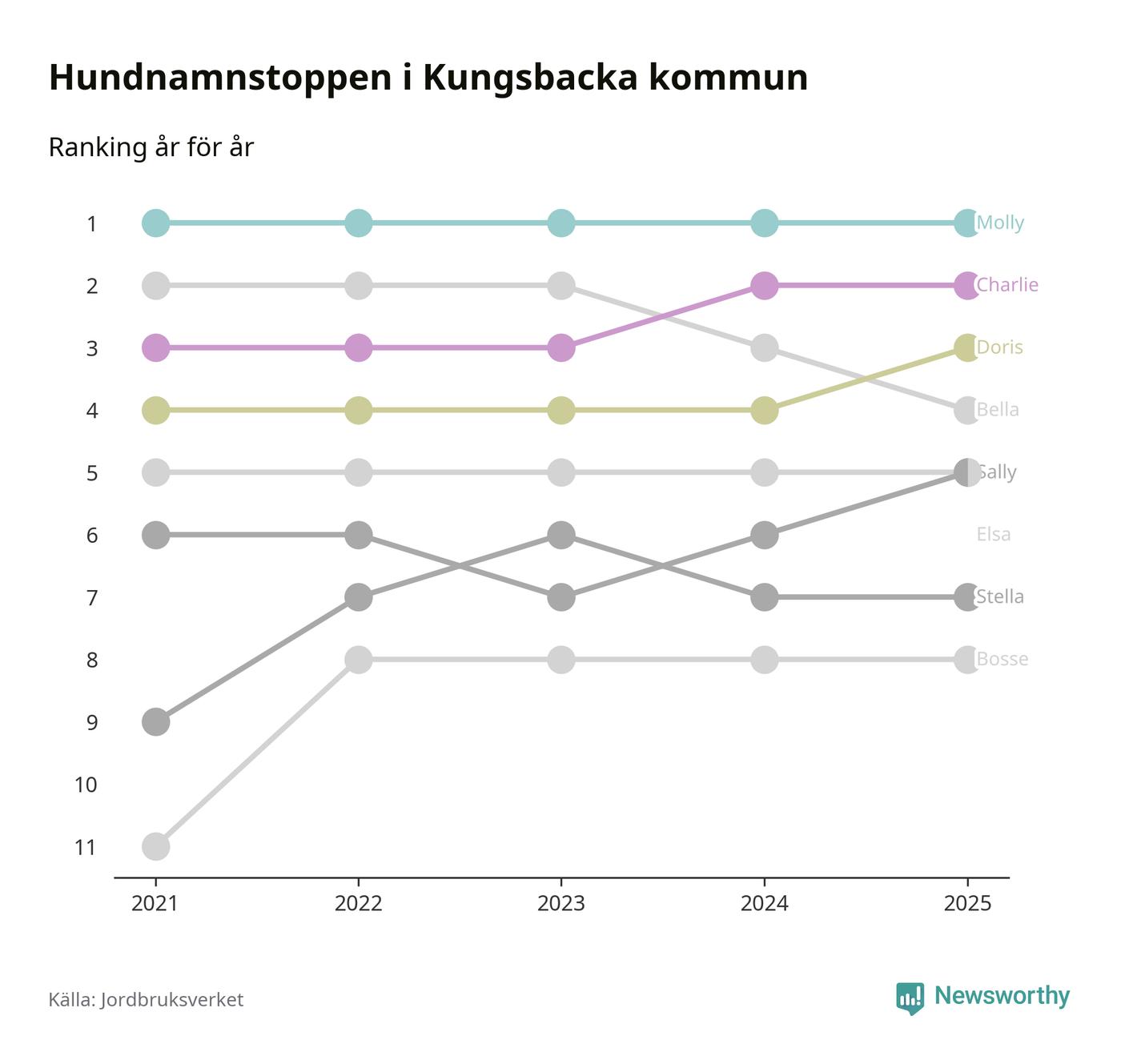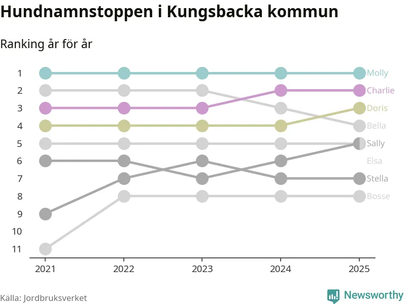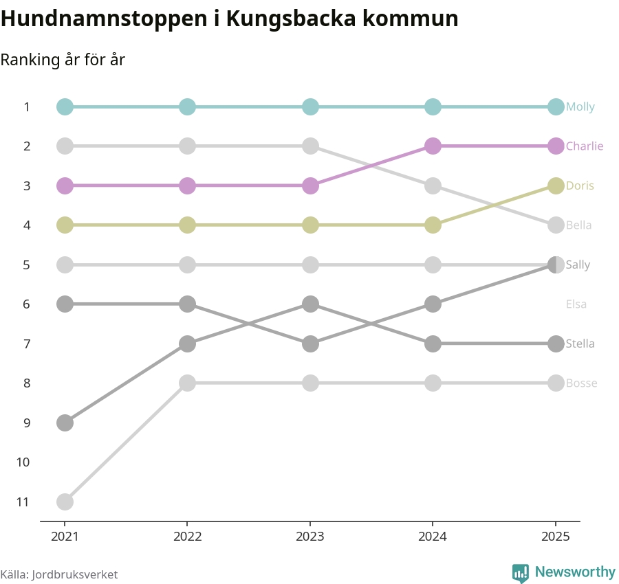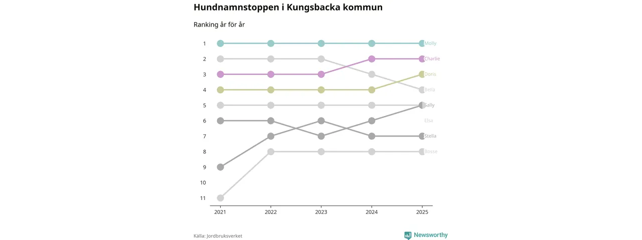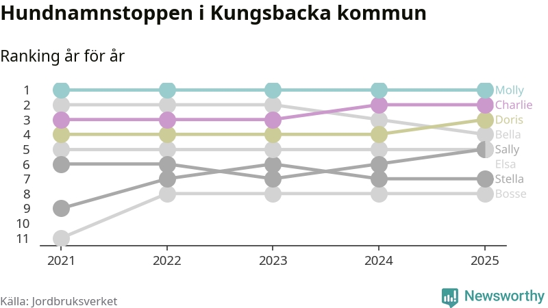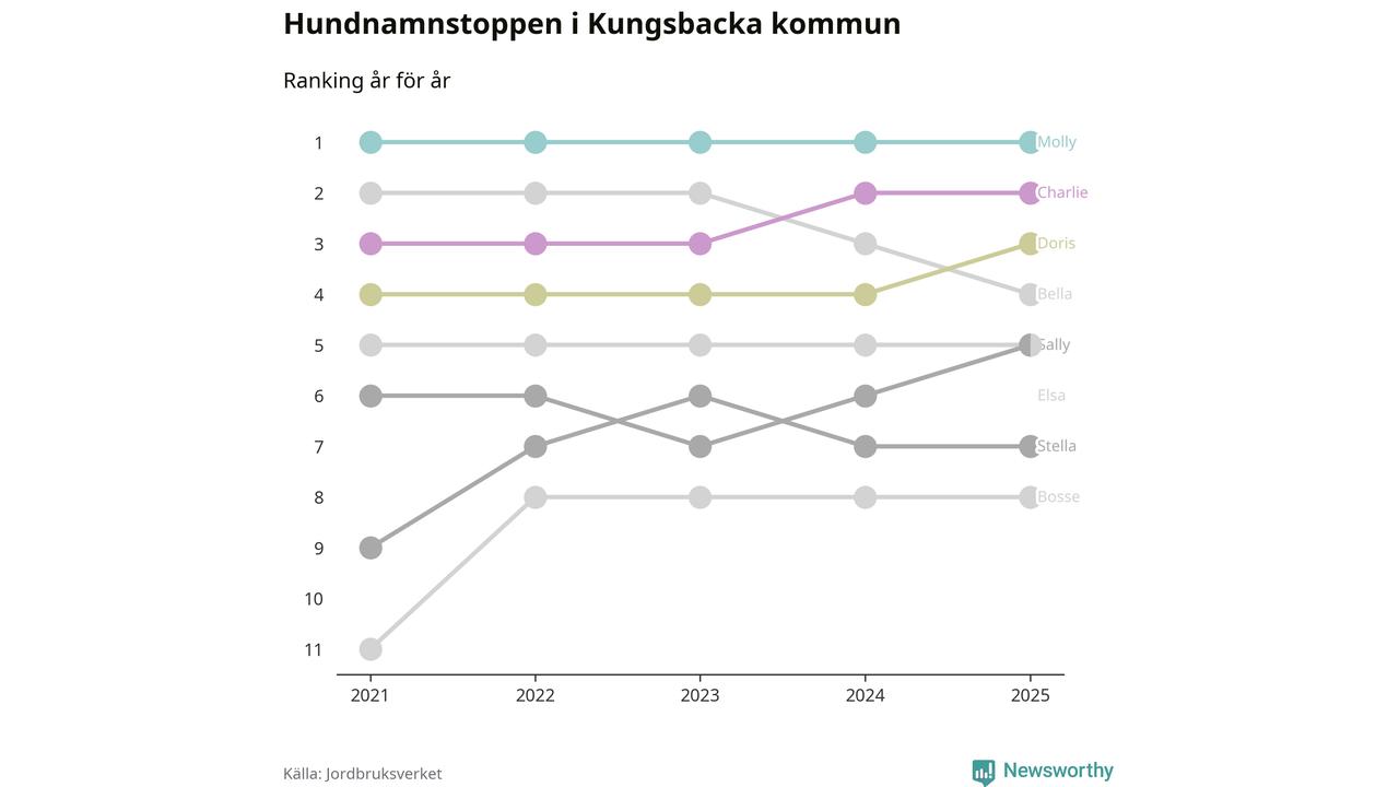 Molly toppar hundnamnsligan i Kungsbacka kommun, precis som i landet som helhet. Det visar färsk statistik från Jordbruksverket. Här finns hela topplistan för kommunen.