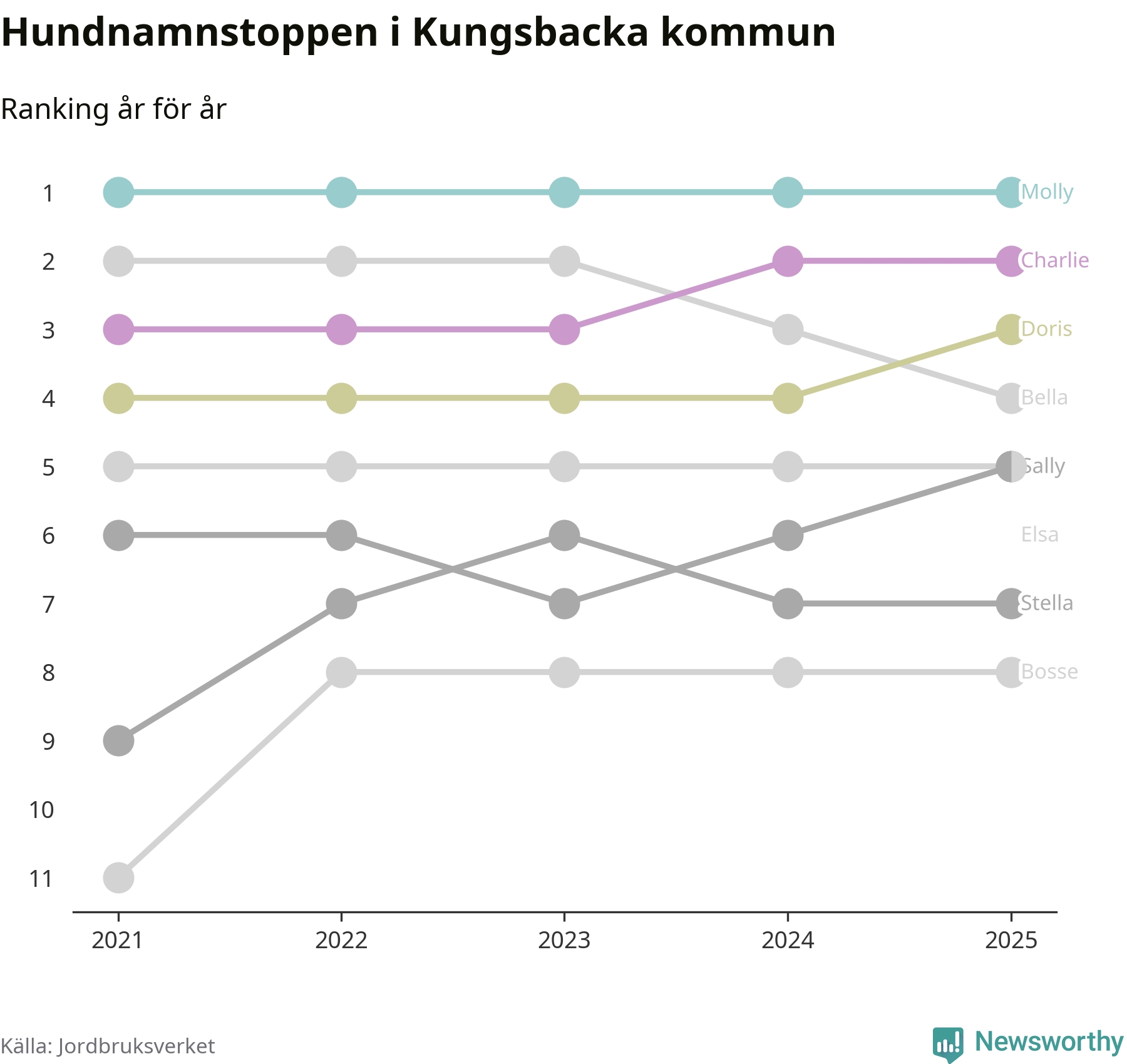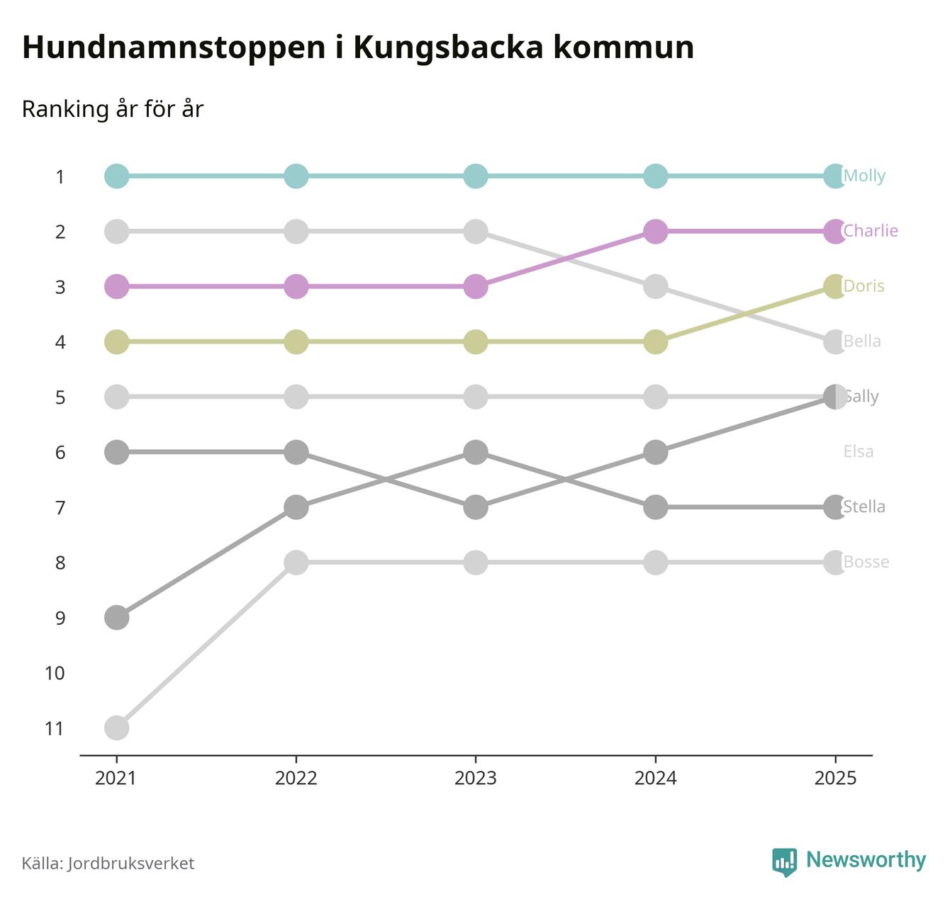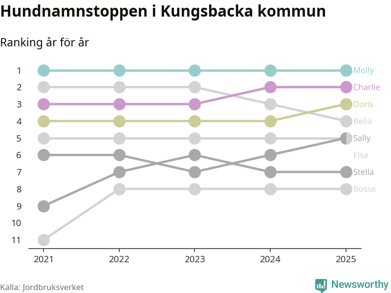 I hela landet är Molly det ohotat populäraste tilltalsnamnet för hundar sedan flera år, följt av Bella och Charlie. Något av de tre namnen toppar listan i 243 av 290 kommuner, och de har varit de vanligaste namnen sedan åtminstone 2018. Men det fjärde populäraste namnet, Doris, knappade in på ledartrion och kommer snart kunna utmana Charlie om tredjeplatsen, om trenden håller i sig.