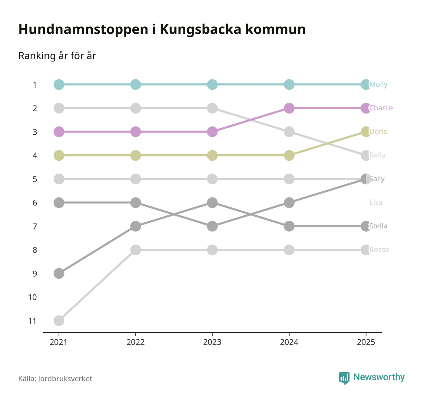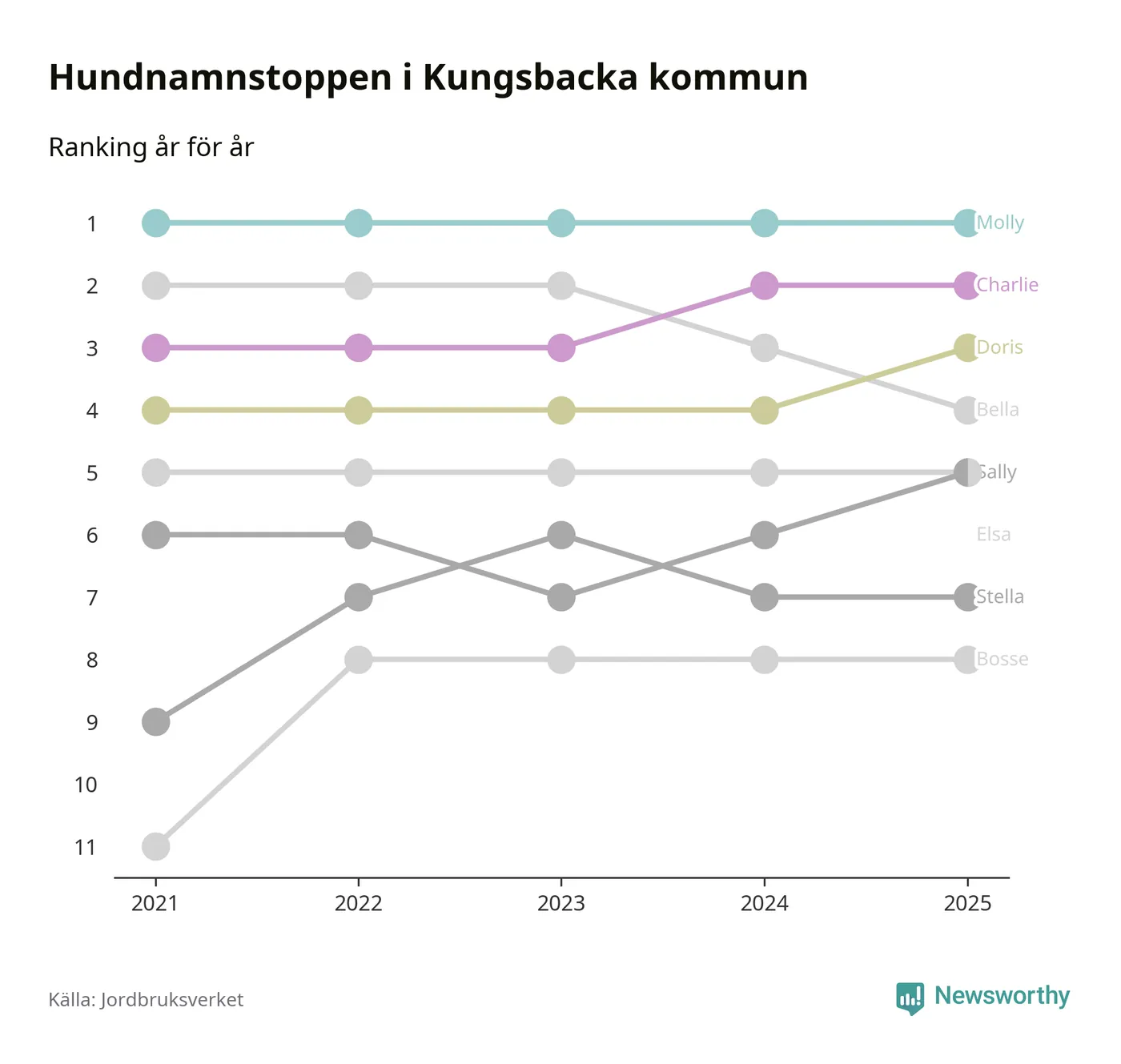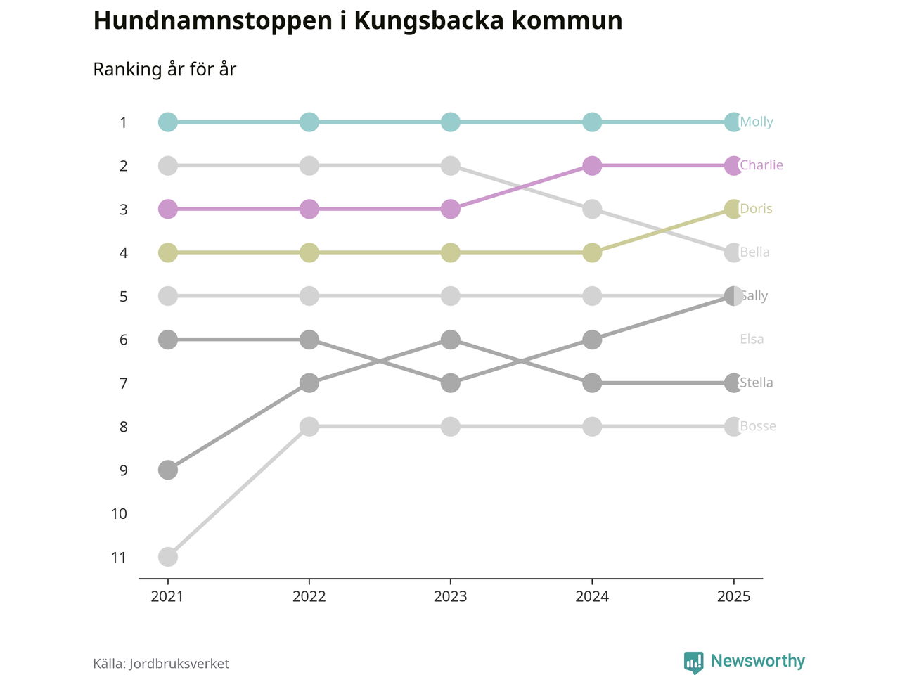 I hela landet är Molly det ohotat populäraste tilltalsnamnet för hundar sedan flera år, följt av Bella och Charlie. Något av de tre namnen toppar listan i 243 av 290 kommuner, och de har varit de vanligaste namnen sedan åtminstone 2018. Men det fjärde populäraste namnet, Doris, knappade in på ledartrion och kommer snart kunna utmana Charlie om tredjeplatsen, om trenden håller i sig.