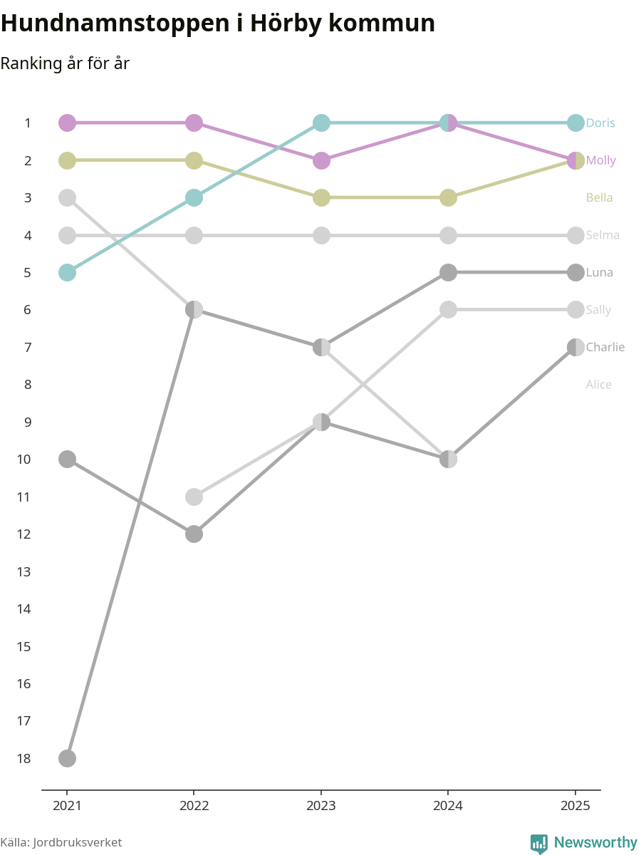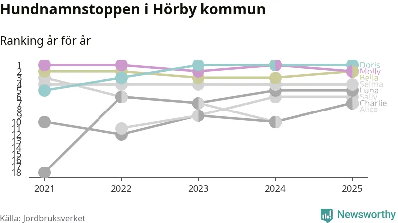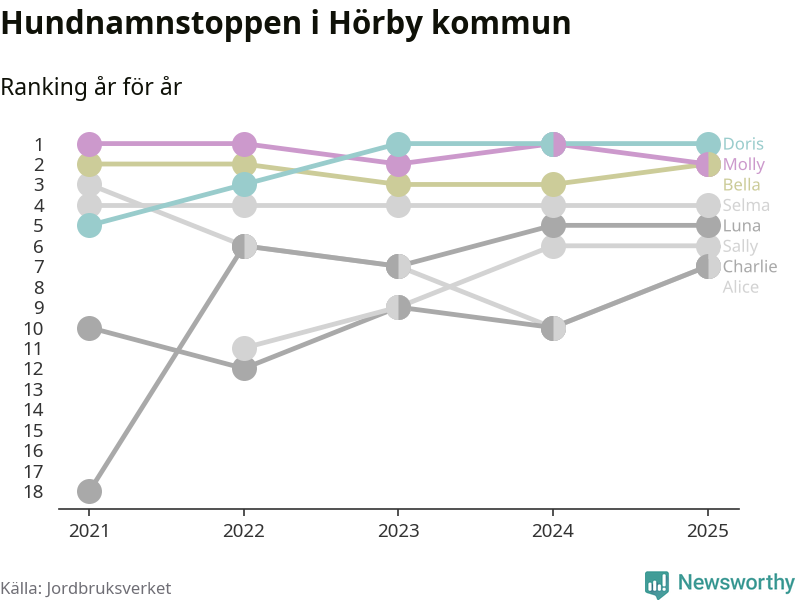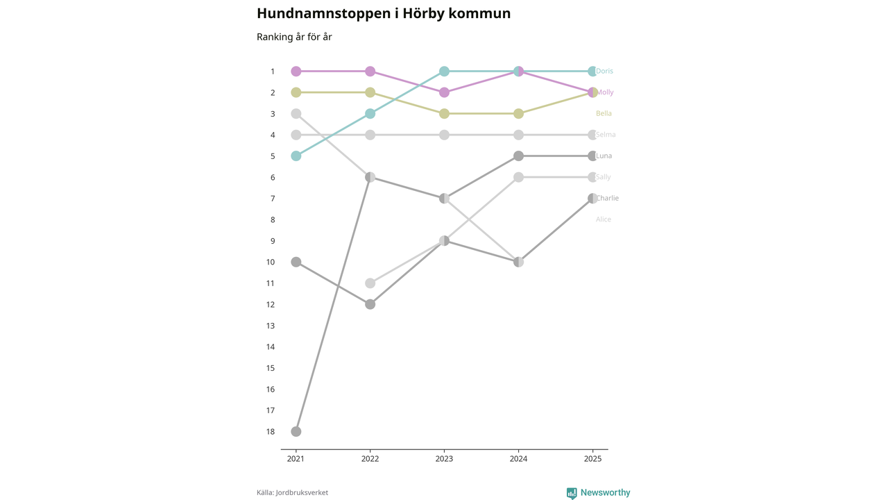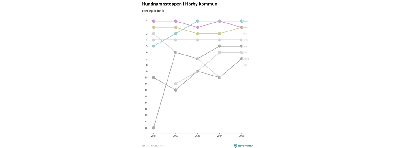 Molly är fortsatt ohotad etta bland hundnamnen i Sverige, följt av Bella och Charlie. Så har det sett ut flera år i rad, men bland Hörbyhundarna är Doris populärast. Det gör Hörby till en av få kommuner i landet där toppnamnet inte hör till de tre vanligaste (Molly, Bella eller Charlie).