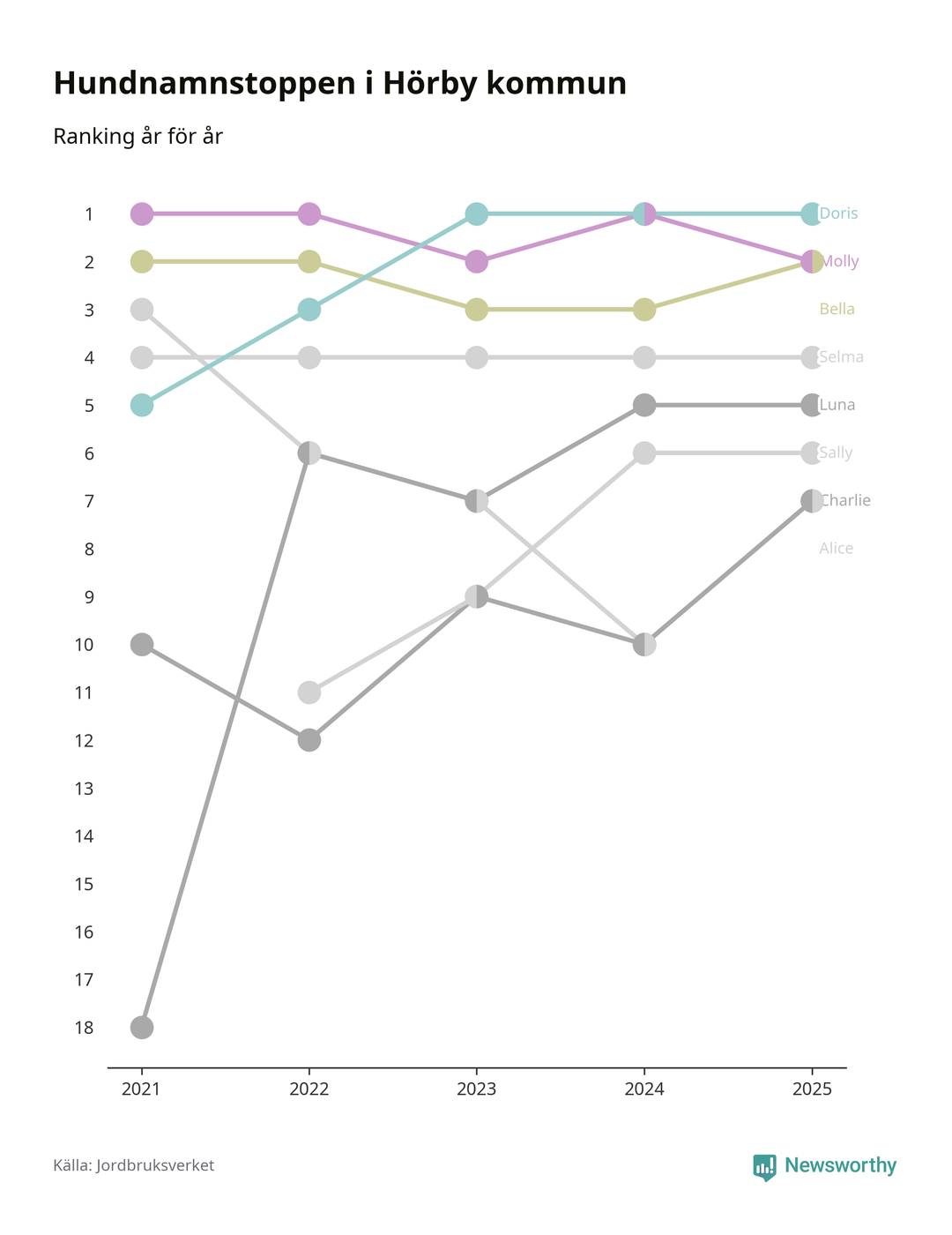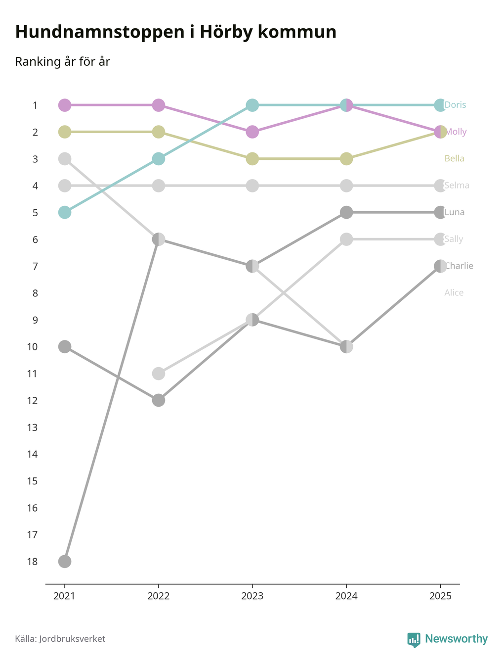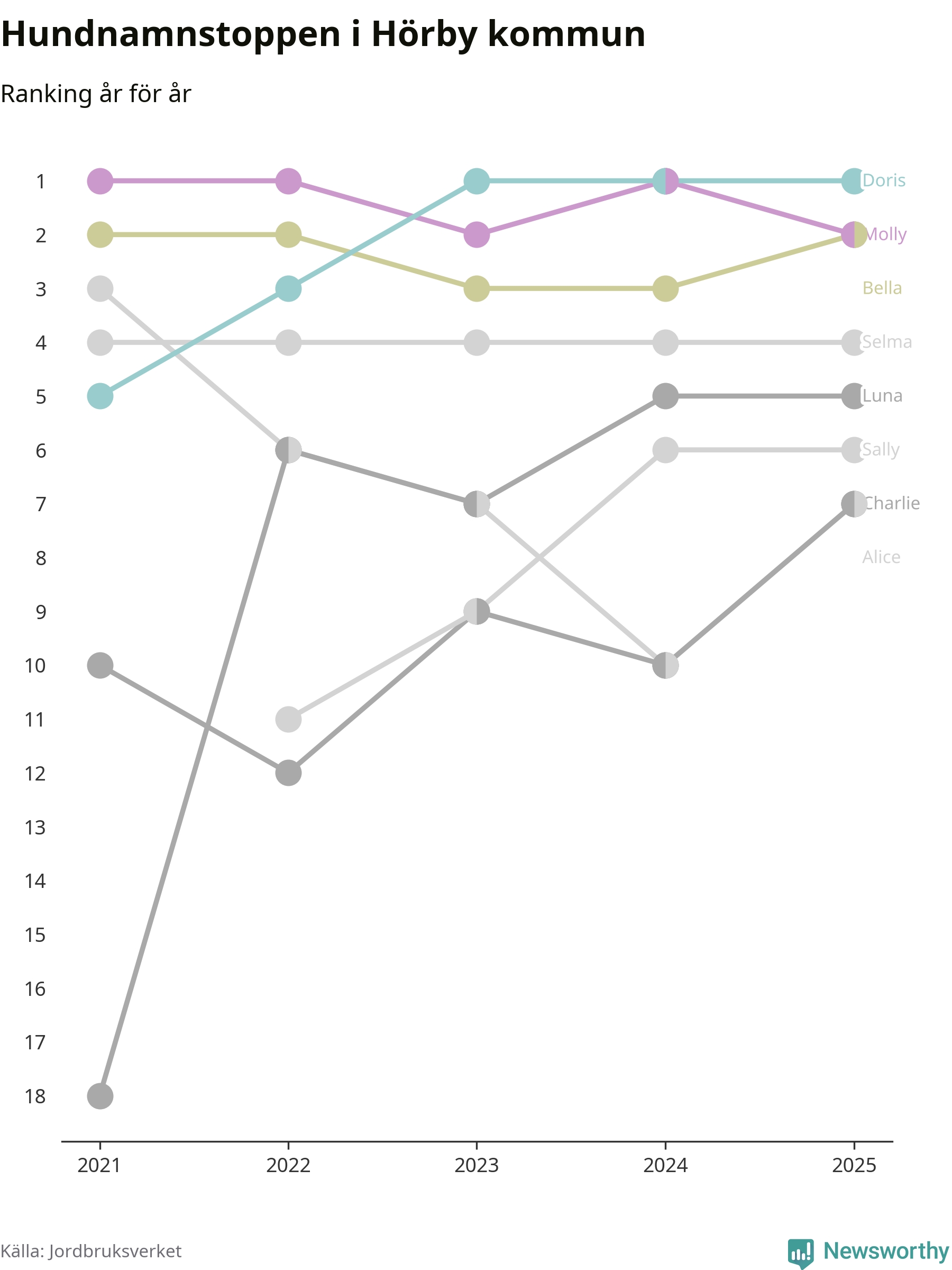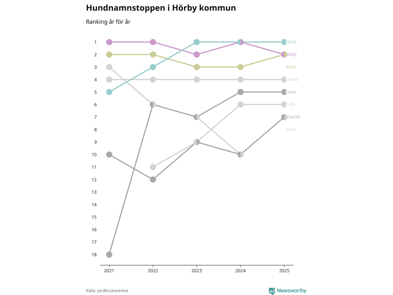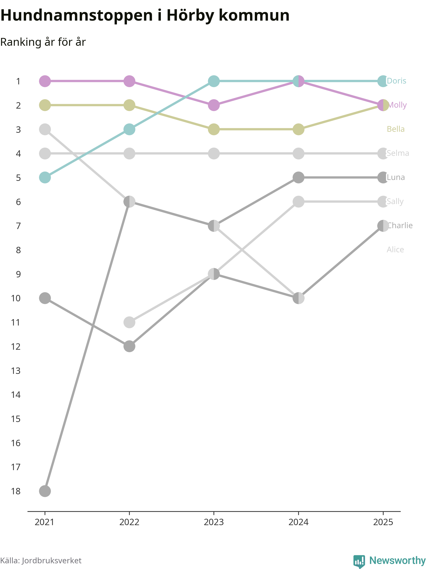 I hela landet är Molly det ohotat populäraste tilltalsnamnet för hundar sedan flera år, följt av Bella och Charlie. Något av de tre namnen toppar listan i 243 av 290 kommuner, och de har varit de vanligaste namnen sedan åtminstone 2018. Men det fjärde populäraste namnet, Doris, knappade in på ledartrion och kommer snart kunna utmana Charlie om tredjeplatsen, om trenden håller i sig.