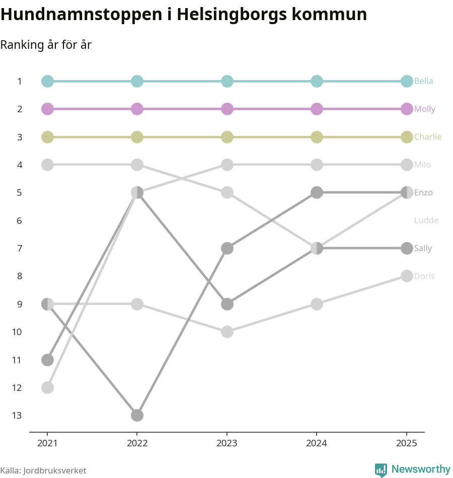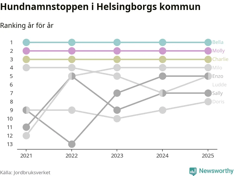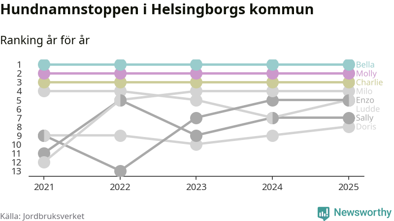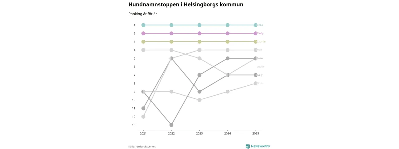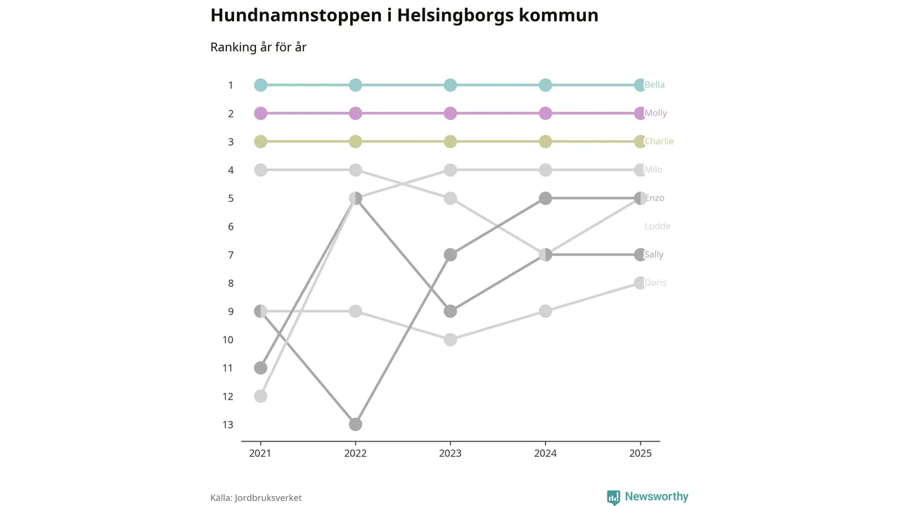 Molly är fortsatt ohotad etta bland hundnamnen i Sverige, följt av Bella och Charlie. Så har det sett ut flera år i rad, men bland Helsingborgshundarna är Bella populärast.