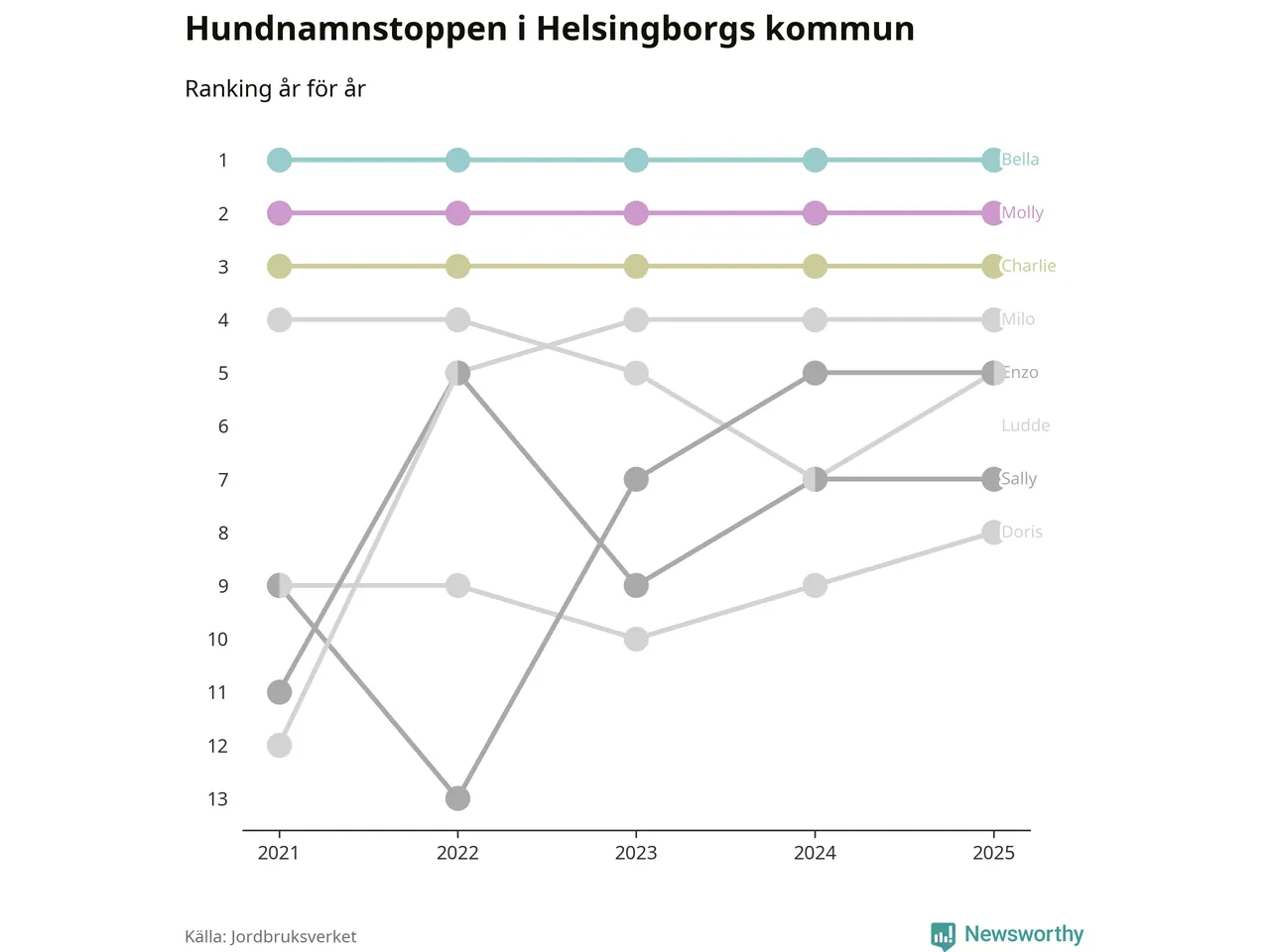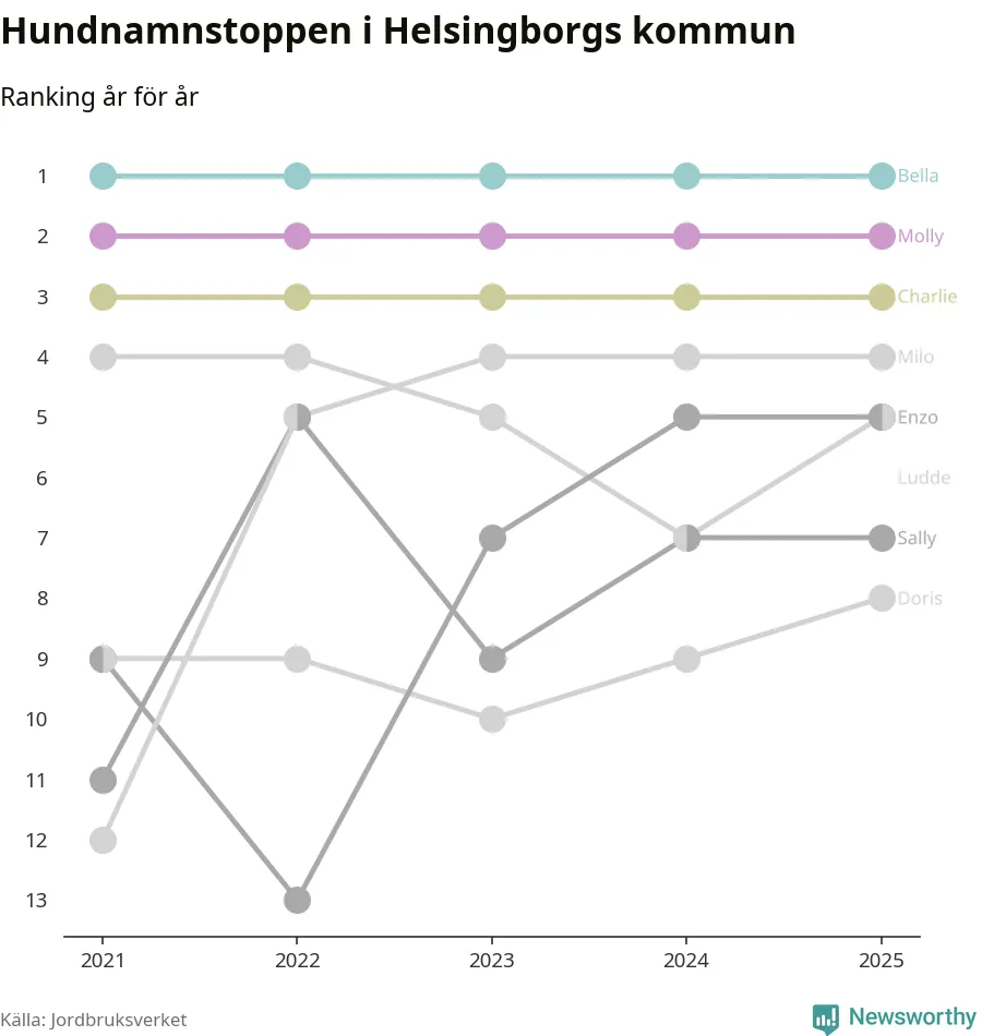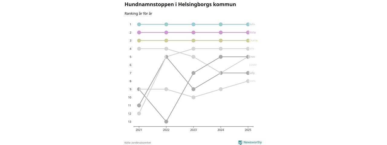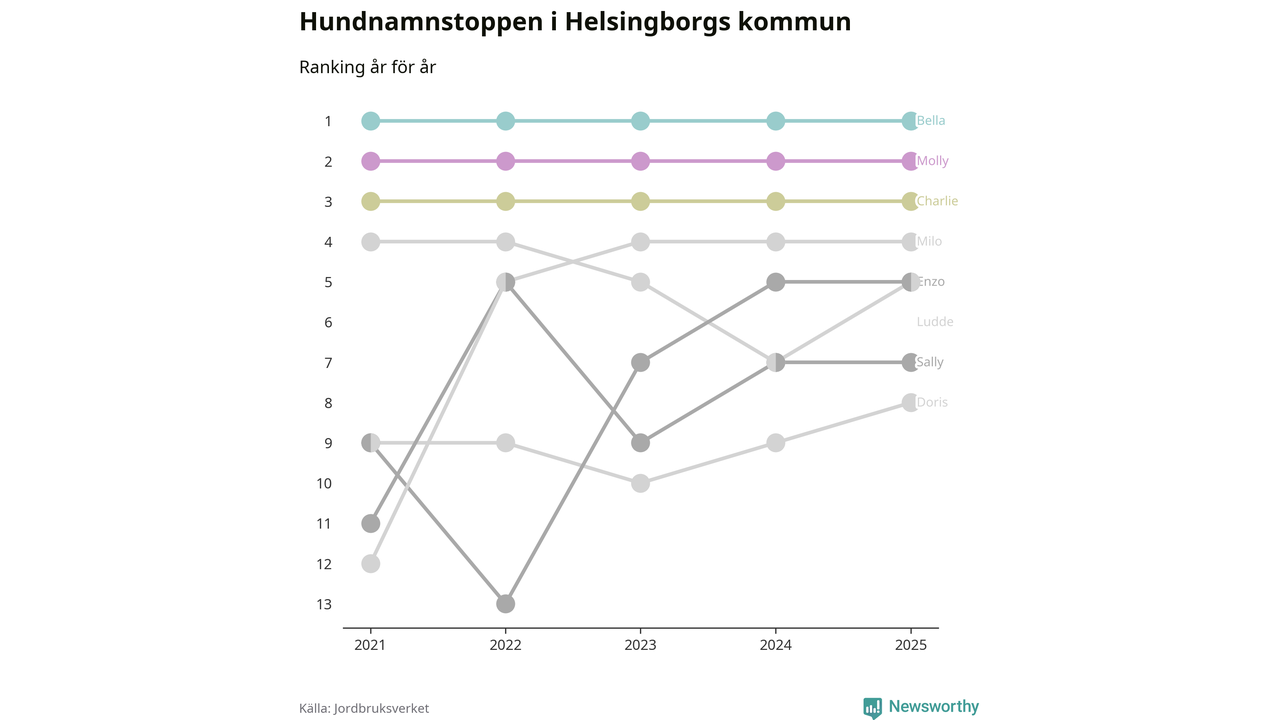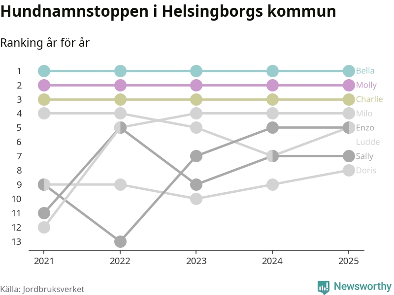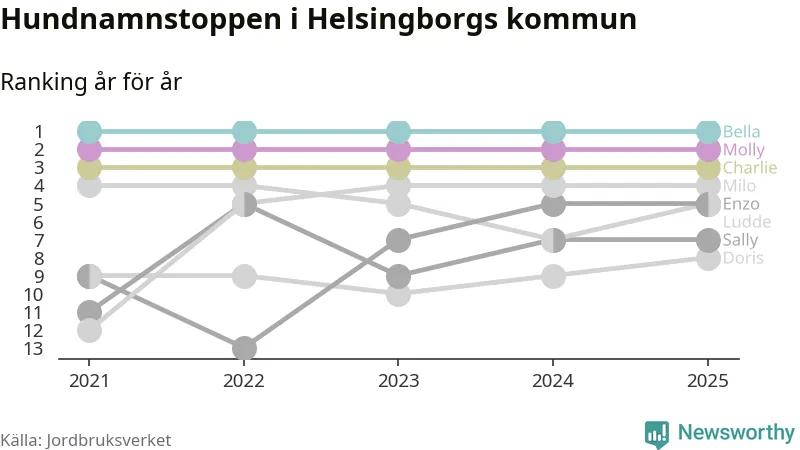 I hela landet är Molly det ohotat populäraste tilltalsnamnet för hundar sedan flera år, följt av Bella och Charlie. Något av de tre namnen toppar listan i 243 av 290 kommuner, och de har varit de vanligaste namnen sedan åtminstone 2018. Men det fjärde populäraste namnet, Doris, knappade in på ledartrion och kommer snart kunna utmana Charlie om tredjeplatsen, om trenden håller i sig.