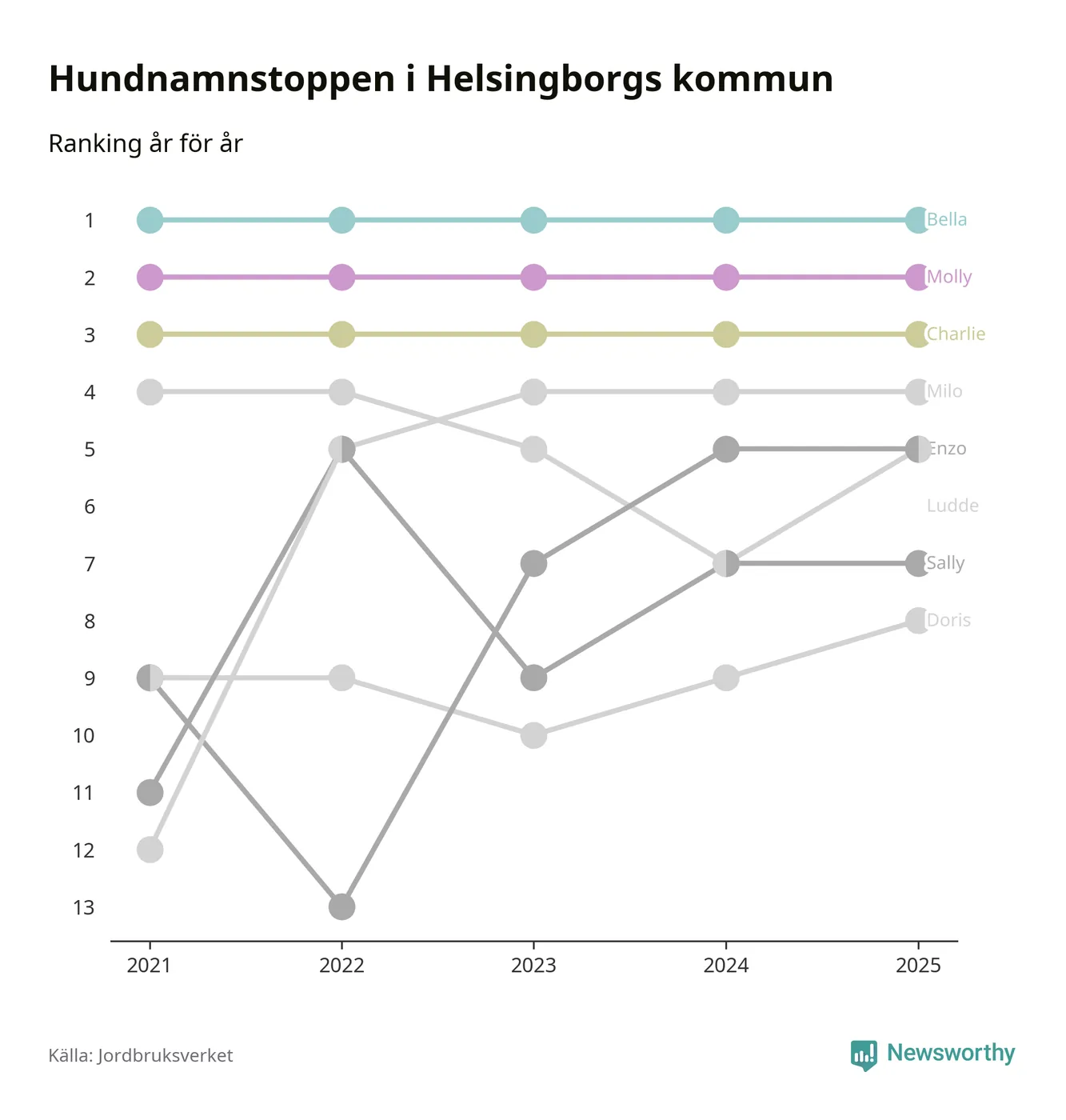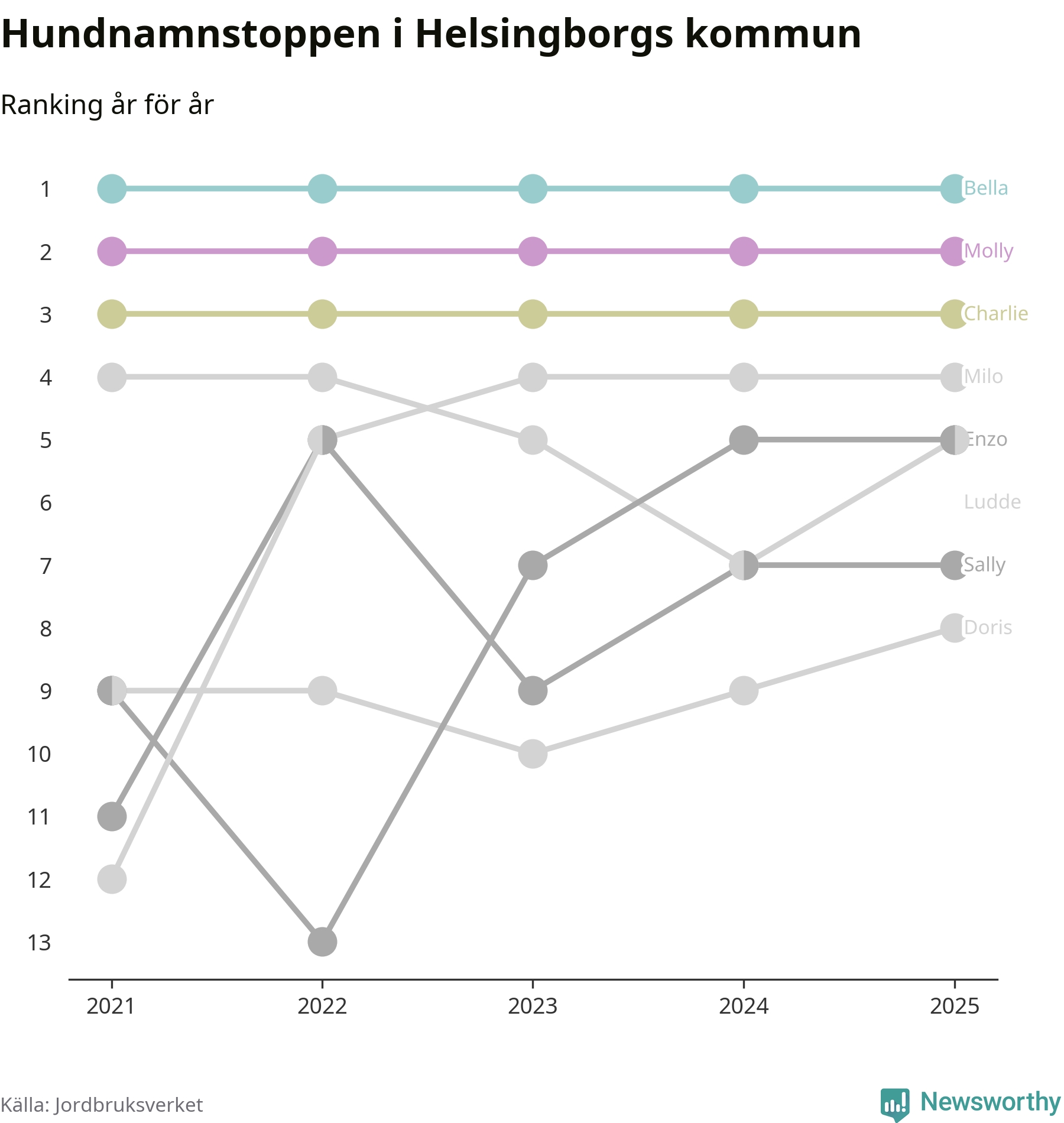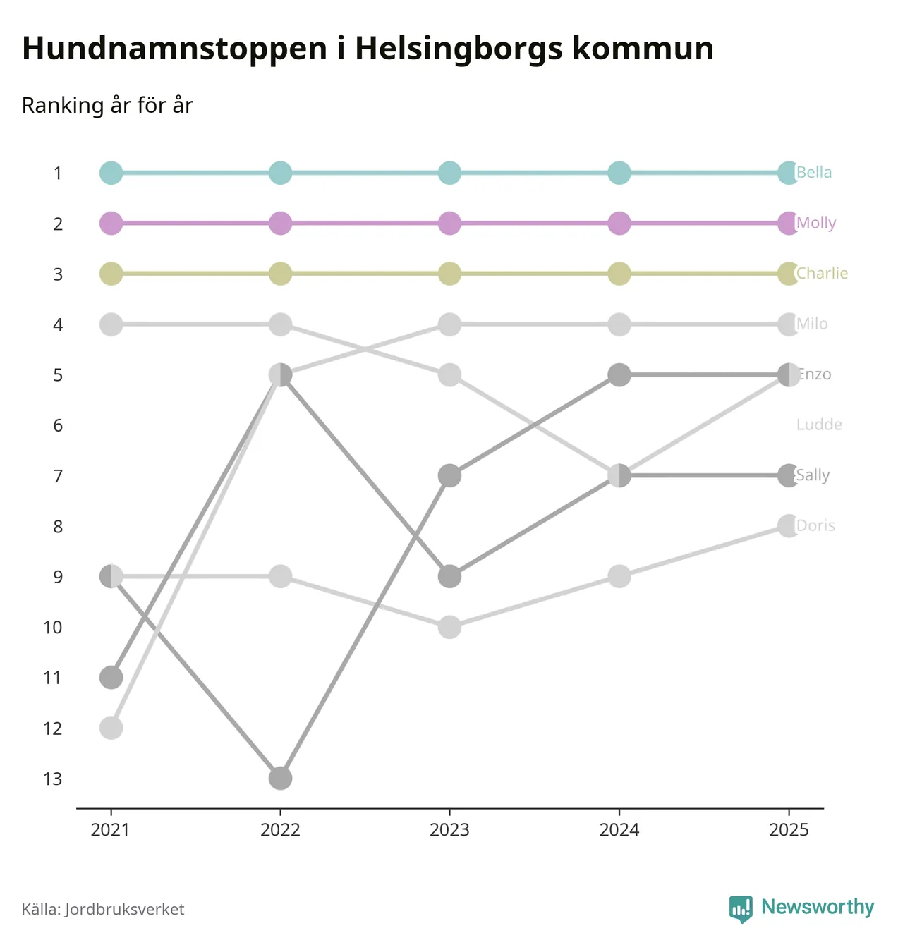 I hela landet är Molly det ohotat populäraste tilltalsnamnet för hundar sedan flera år, följt av Bella och Charlie. Något av de tre namnen toppar listan i 243 av 290 kommuner, och de har varit de vanligaste namnen sedan åtminstone 2018. Men det fjärde populäraste namnet, Doris, knappade in på ledartrion och kommer snart kunna utmana Charlie om tredjeplatsen, om trenden håller i sig.