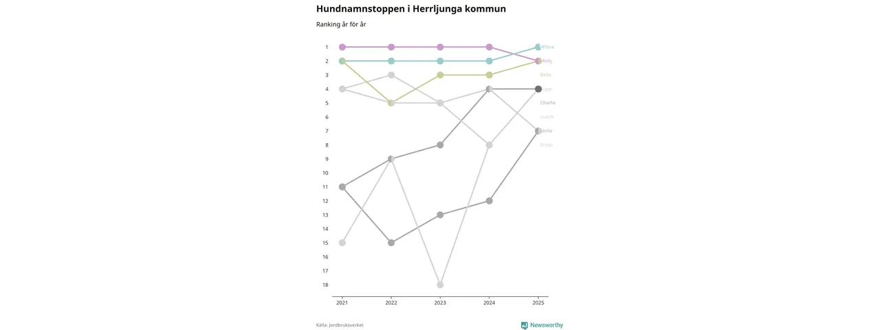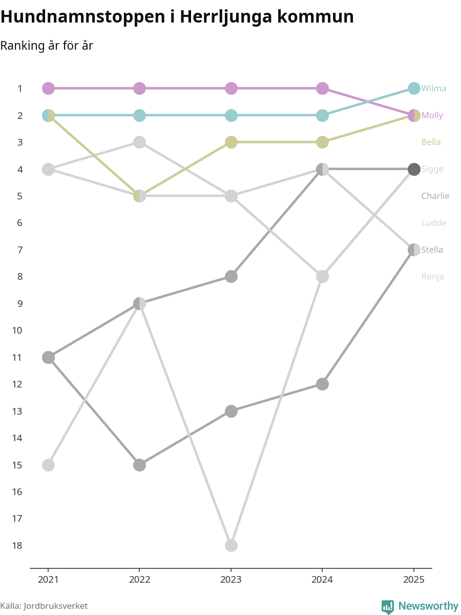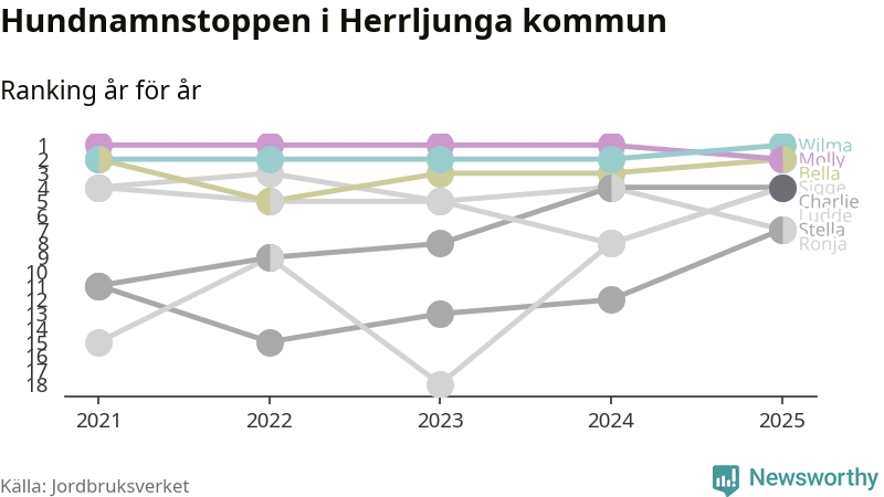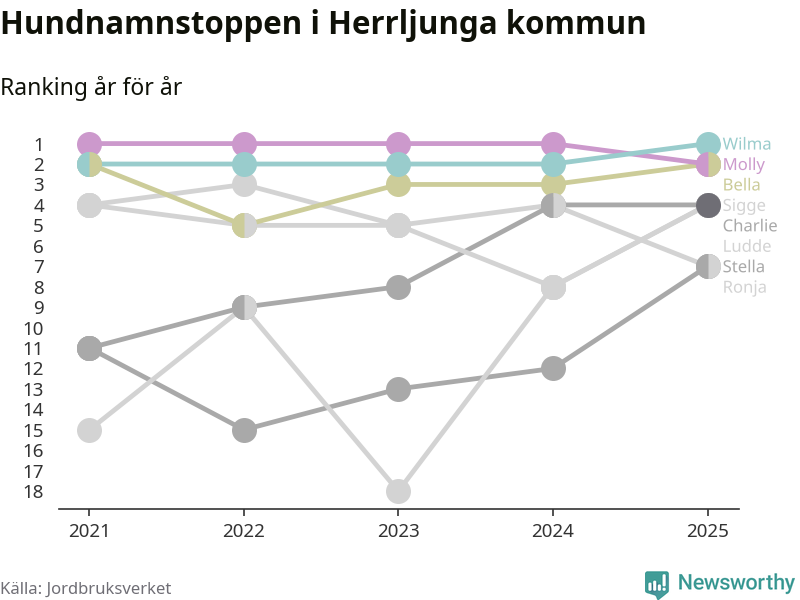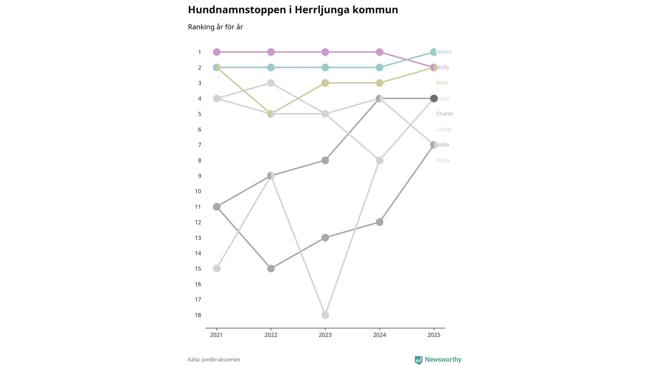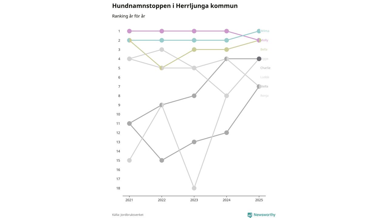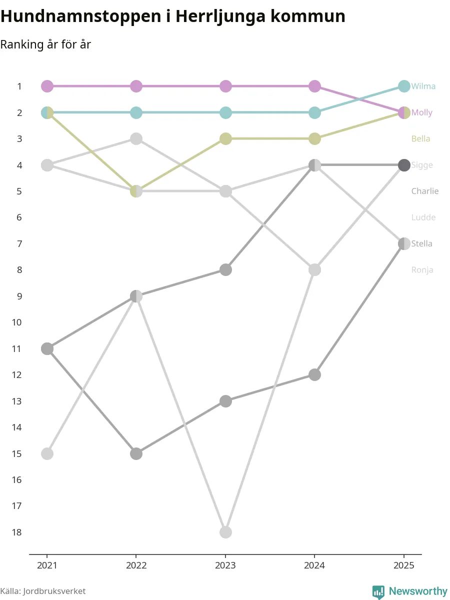 Molly är fortsatt ohotad etta bland hundnamnen i Sverige, följt av Bella och Charlie. Så har det sett ut flera år i rad, men bland Herrljungahundarna är Wilma populärast. Det gör Herrljunga till den enda kommun i landet där Wilma är vanligast.