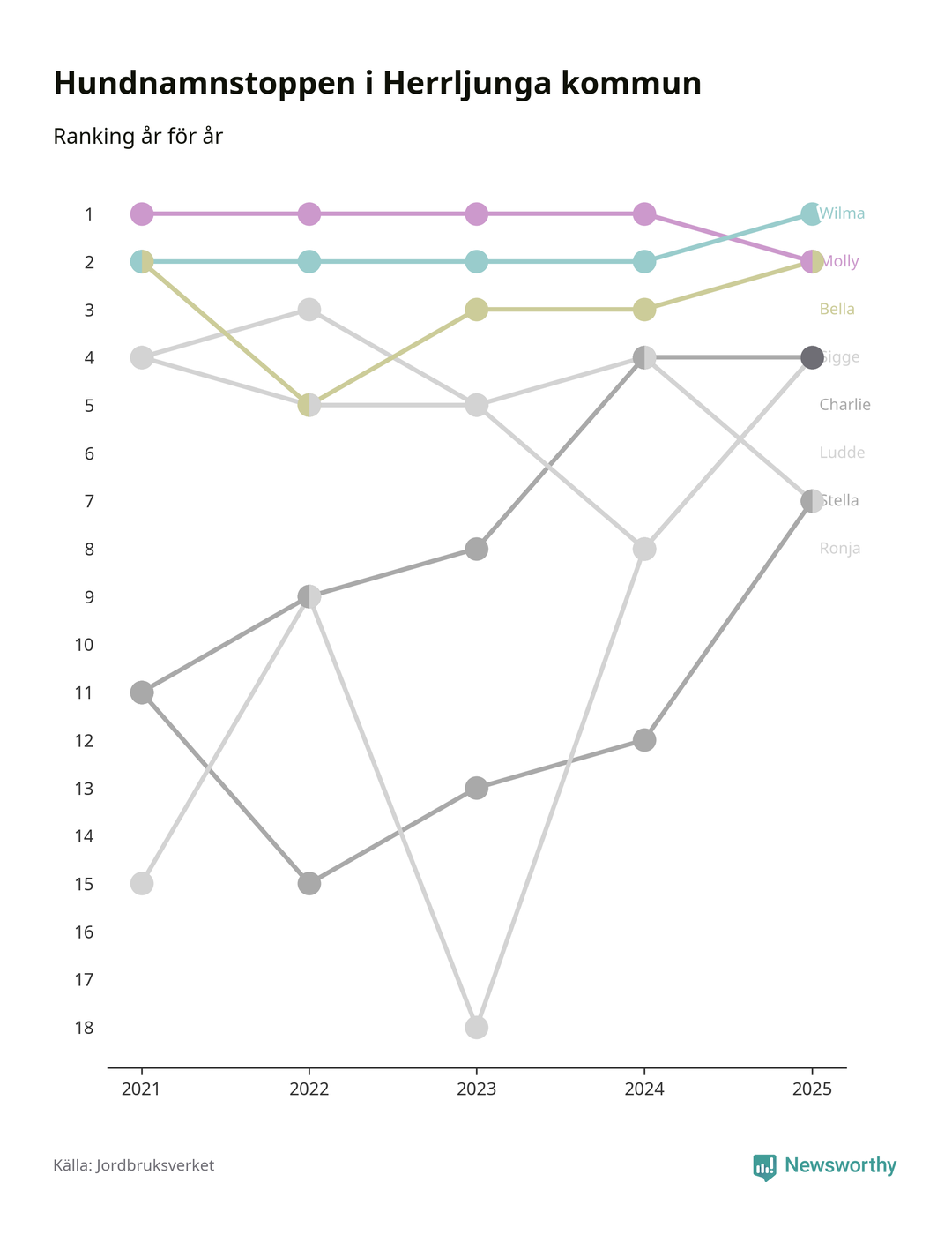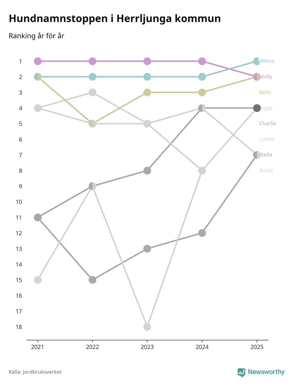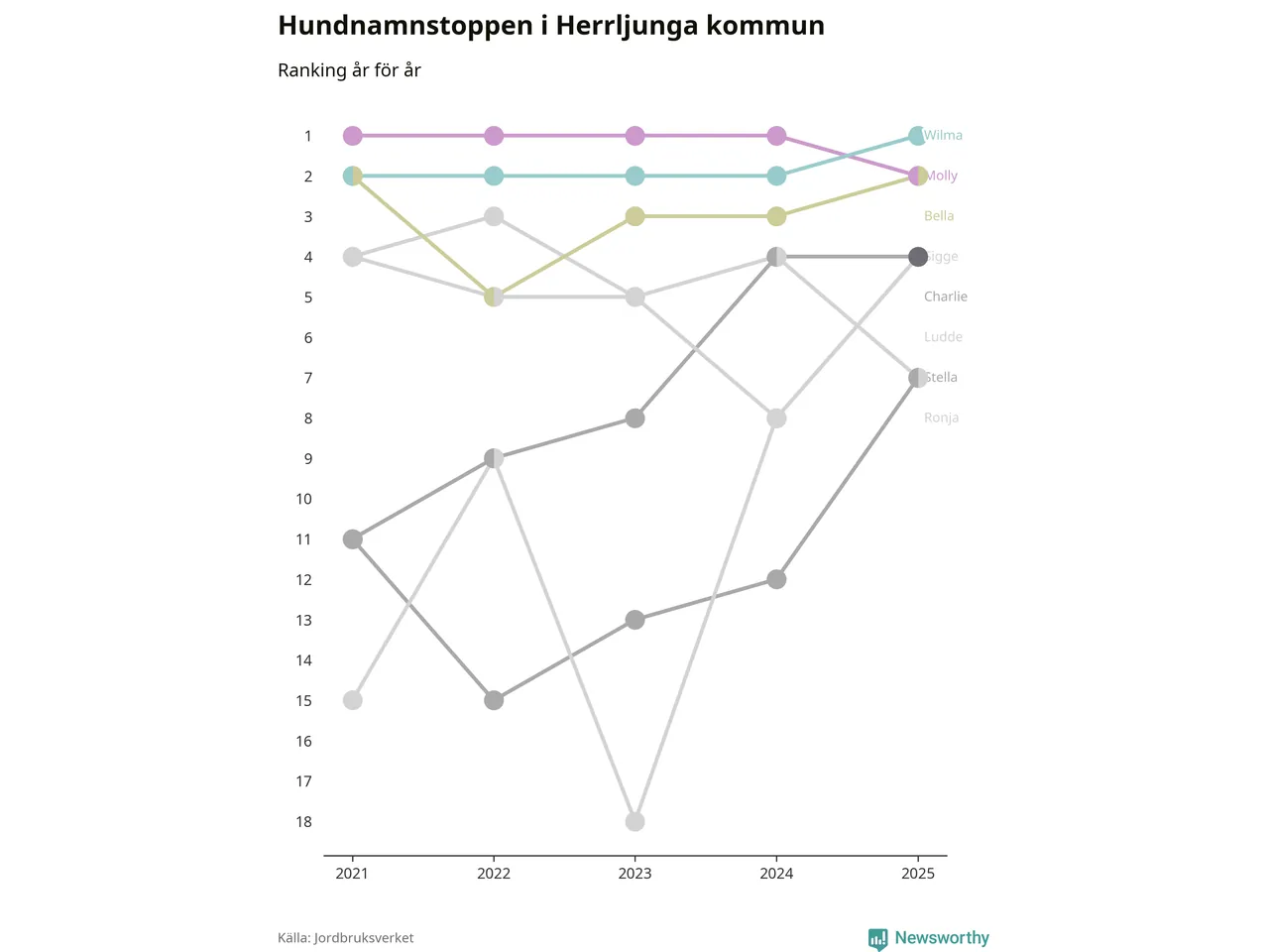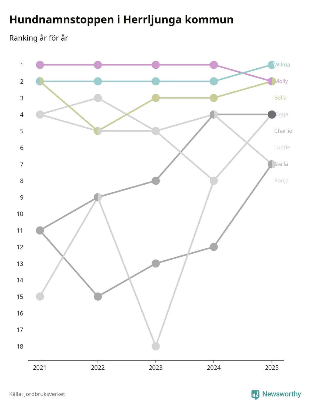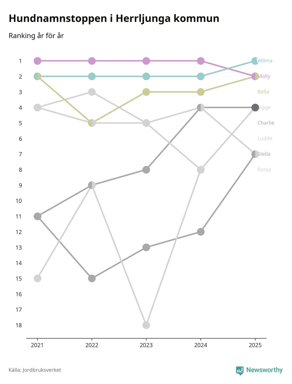 Molly är fortsatt ohotad etta bland hundnamnen i Sverige, följt av Bella och Charlie. Så har det sett ut flera år i rad, men bland Herrljungahundarna är Wilma populärast. Det gör Herrljunga till den enda kommun i landet där Wilma är vanligast.