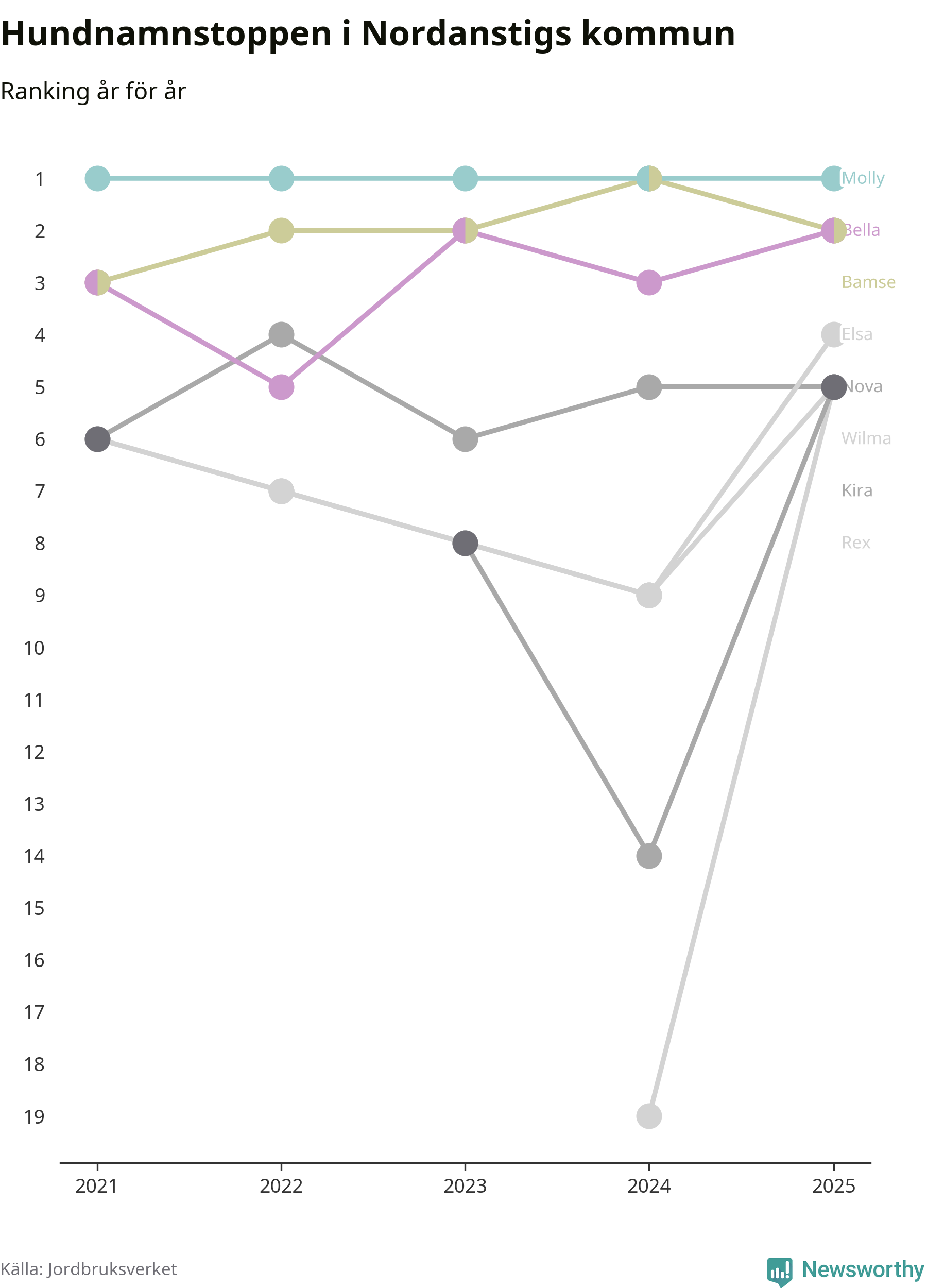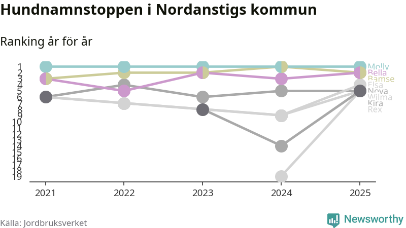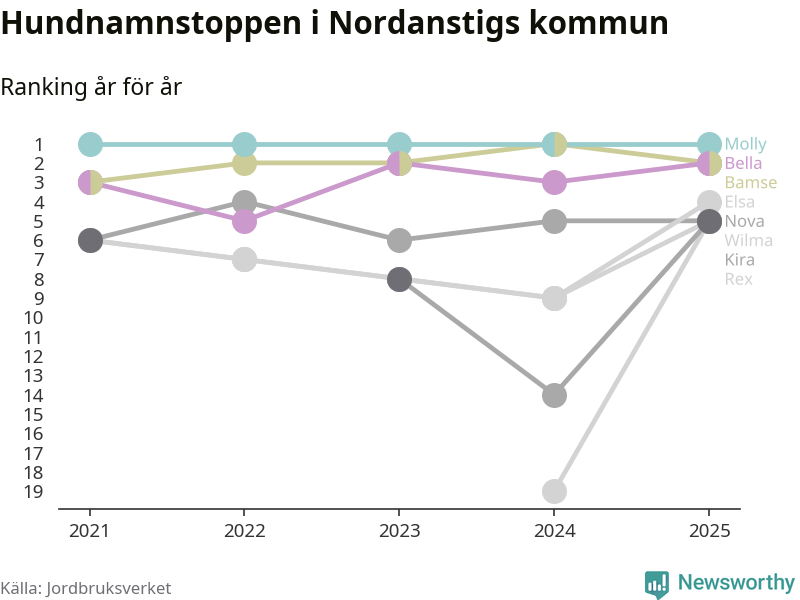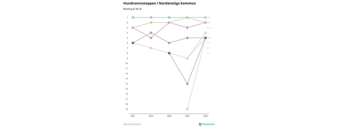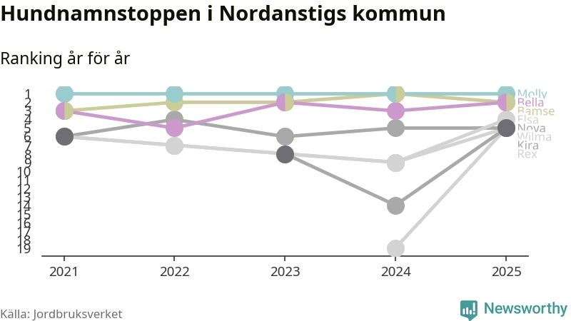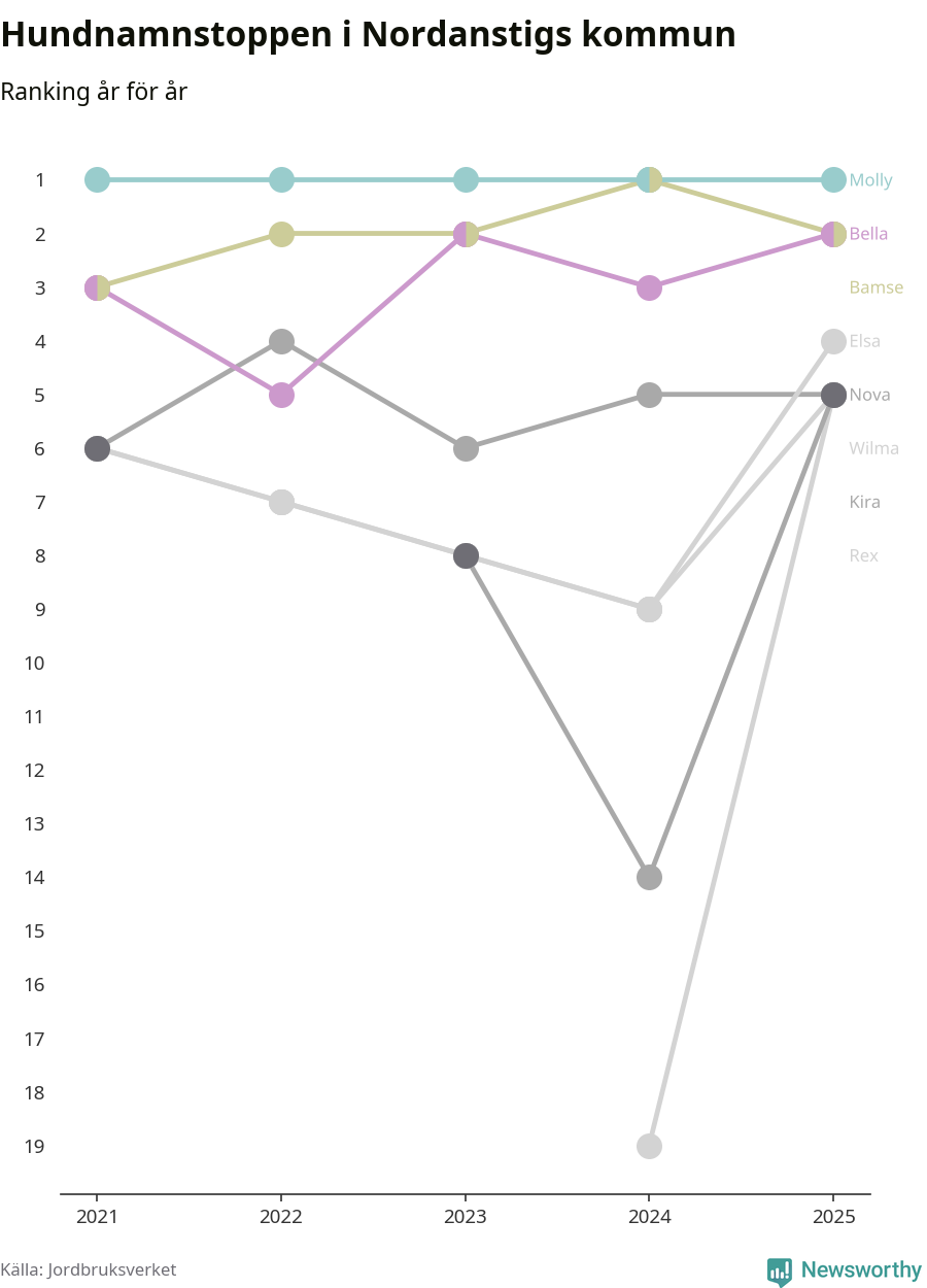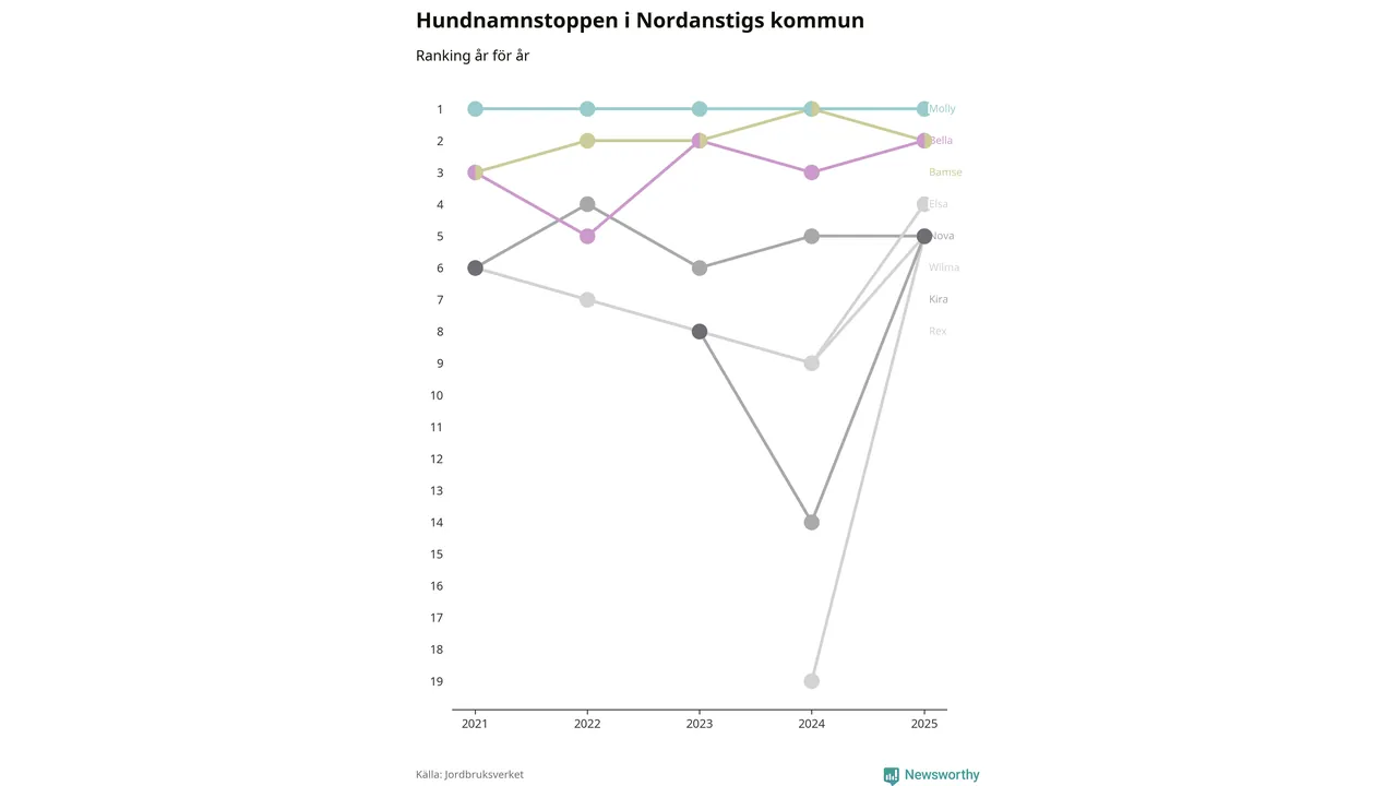 Molly toppar hundnamnsligan i Nordanstigs kommun, precis som i landet som helhet. Det visar färsk statistik från Jordbruksverket. Här finns hela topplistan för kommunen.