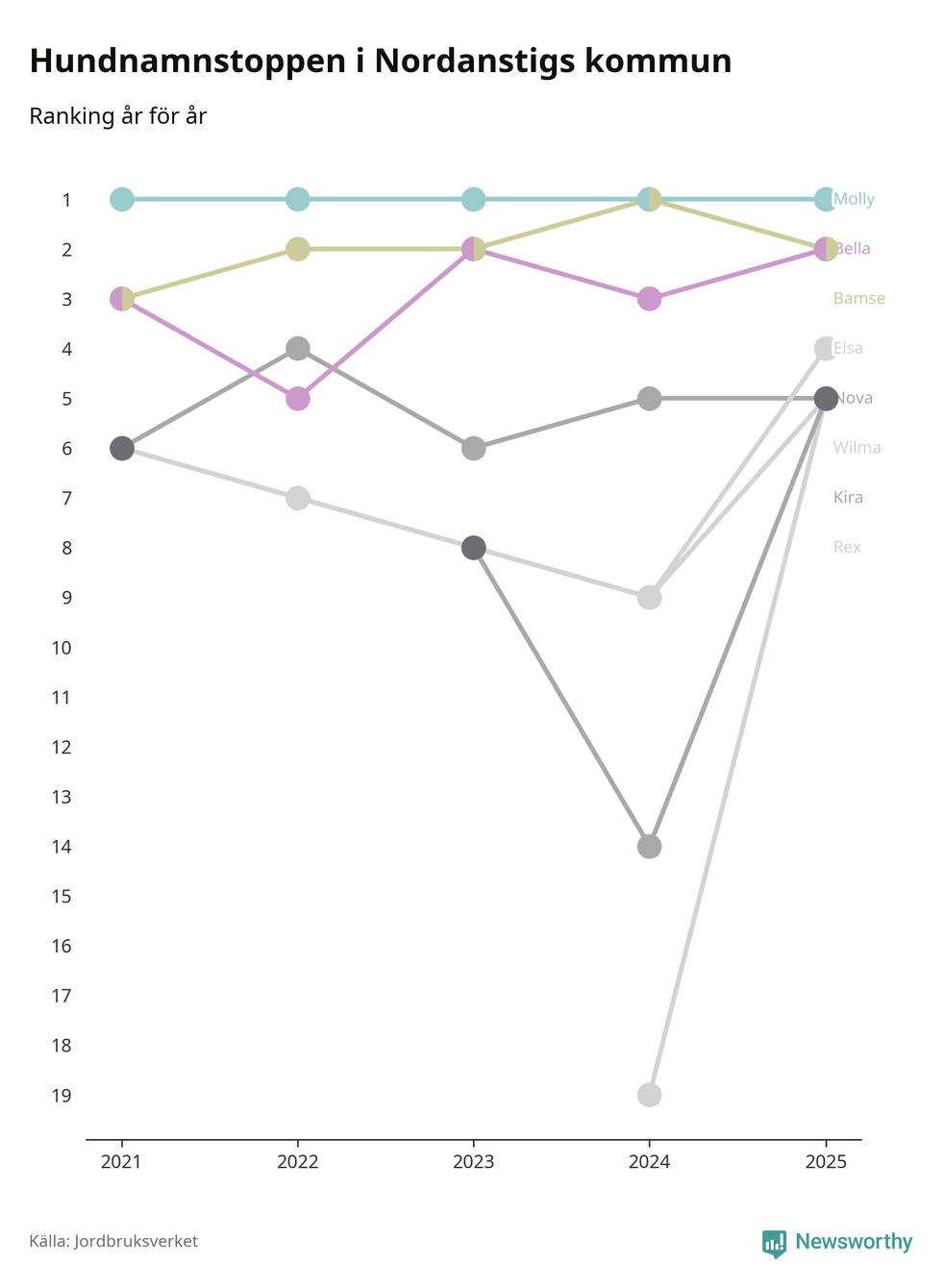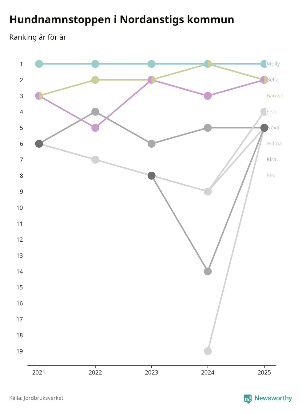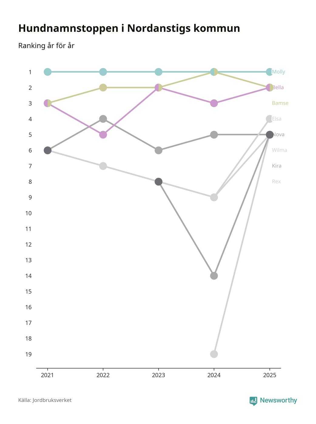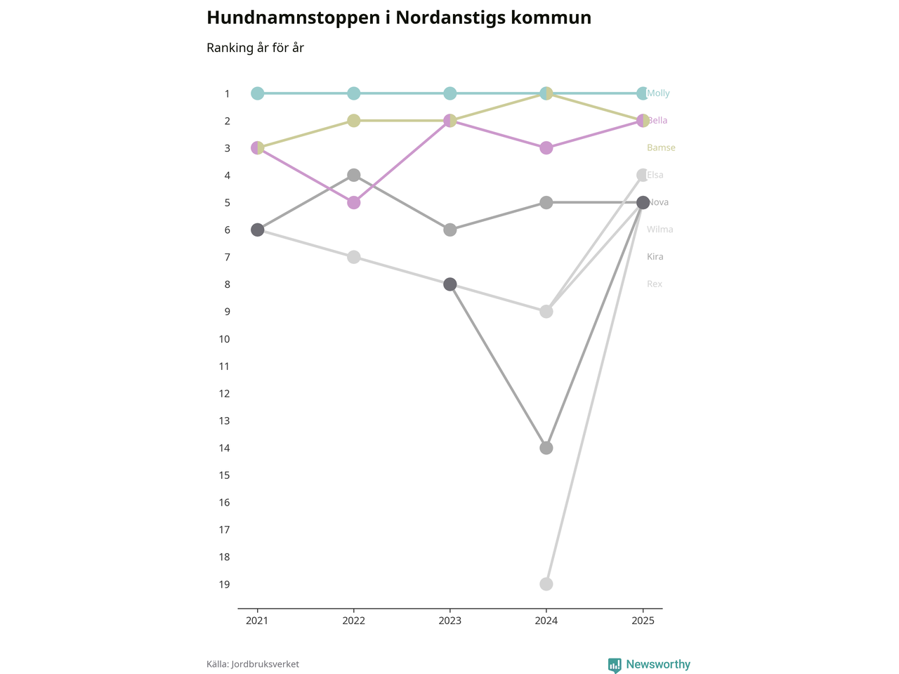 Molly toppar hundnamnsligan i Nordanstigs kommun, precis som i landet som helhet. Det visar färsk statistik från Jordbruksverket. Här finns hela topplistan för kommunen.