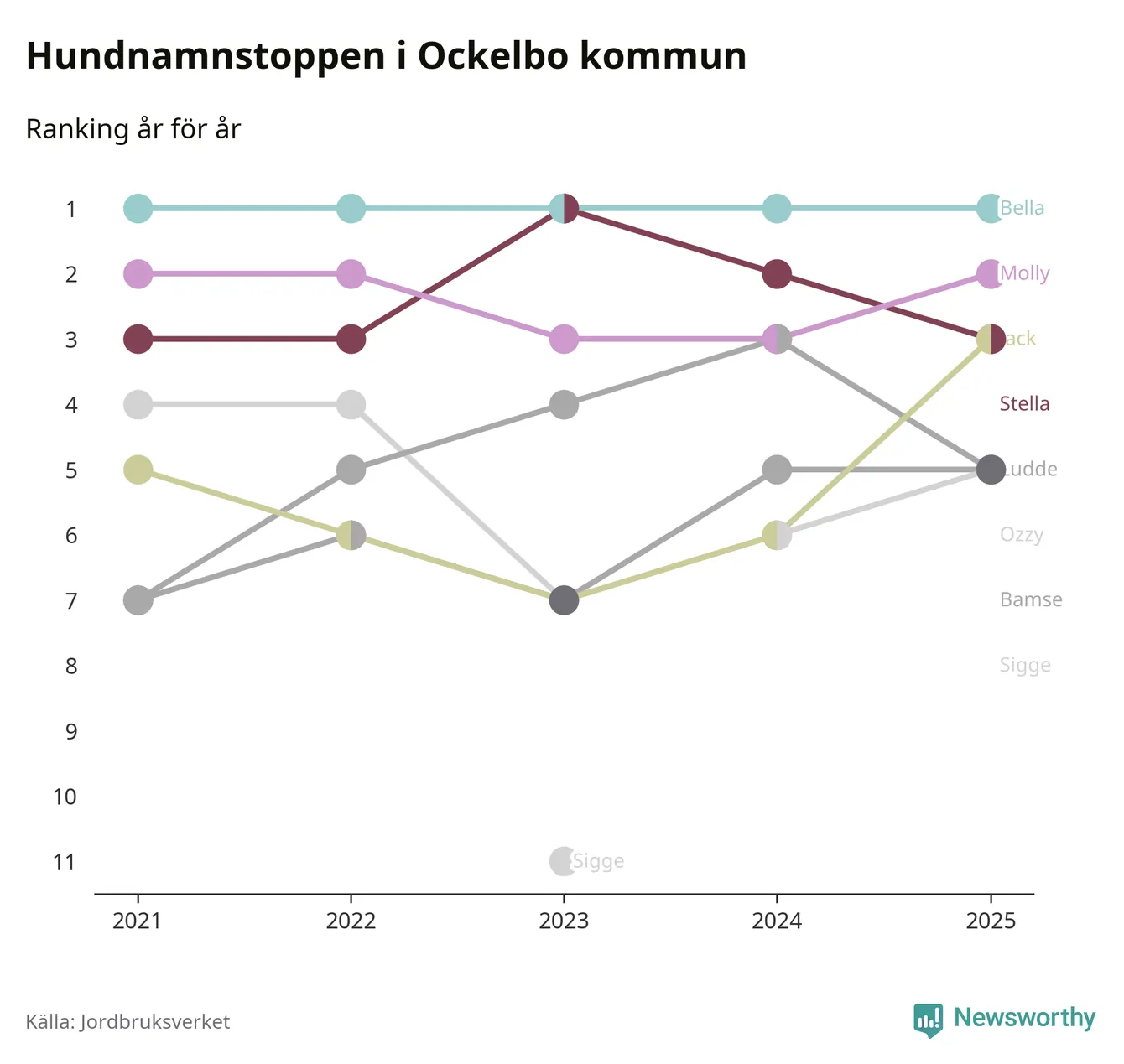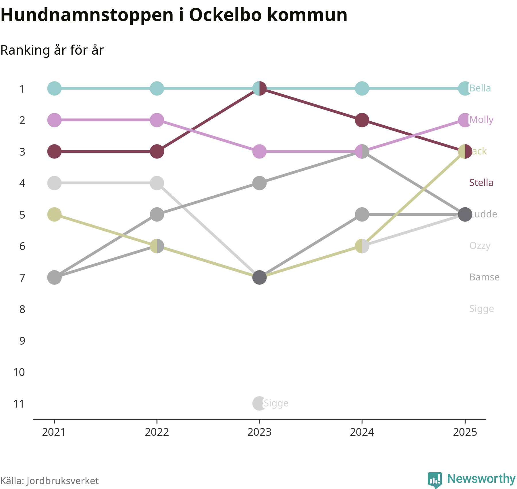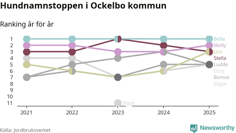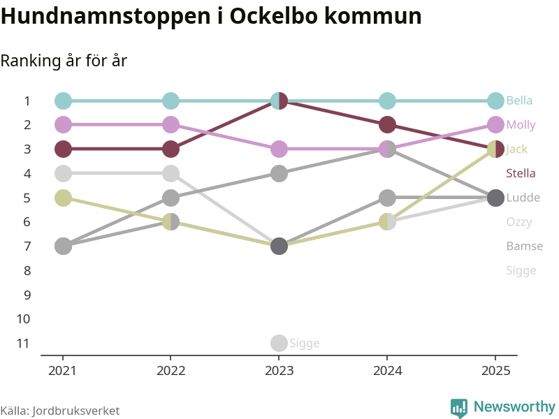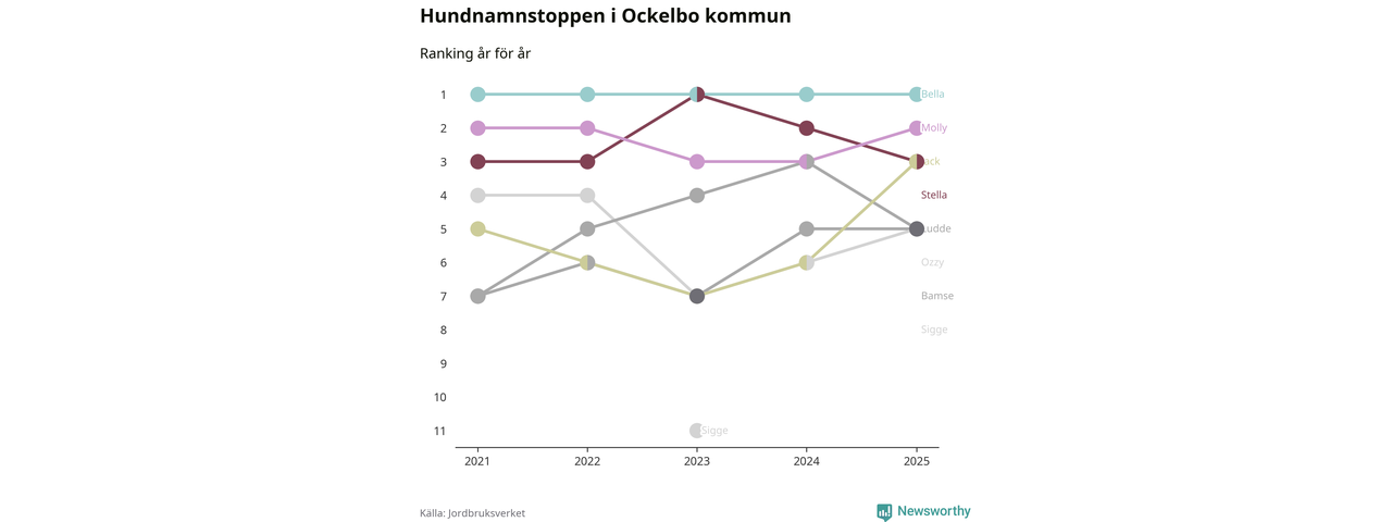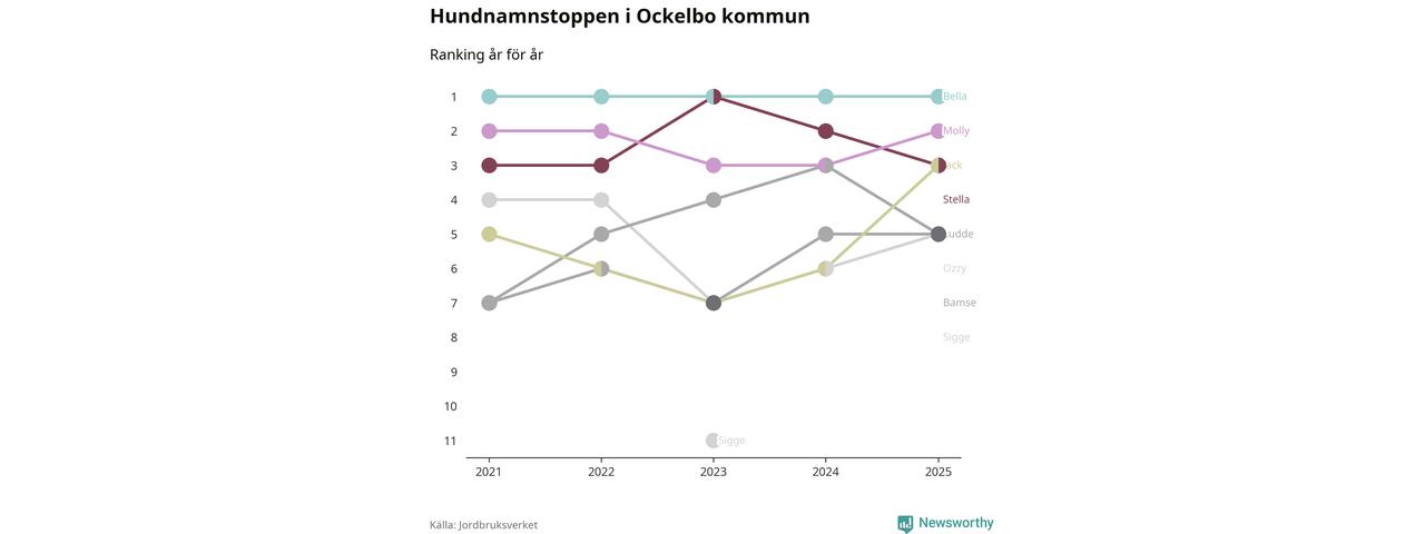 Molly är fortsatt ohotad etta bland hundnamnen i Sverige, följt av Bella och Charlie. Så har det sett ut flera år i rad, men bland Ockelbohundarna är