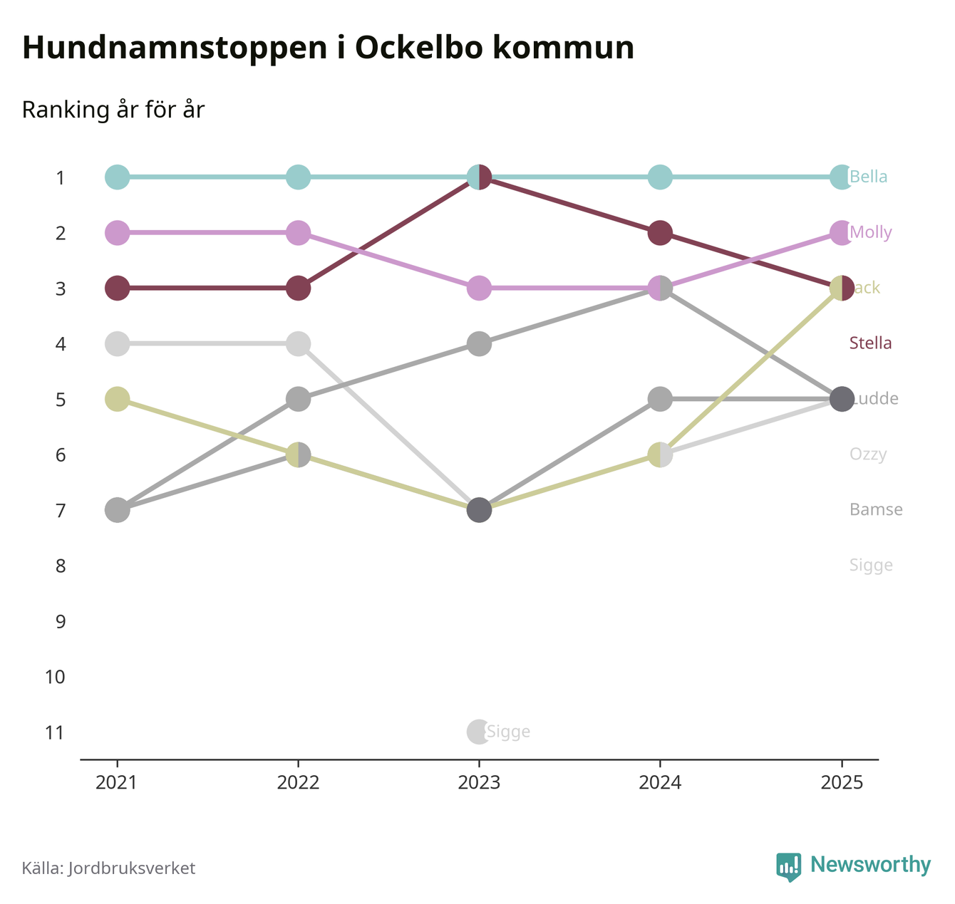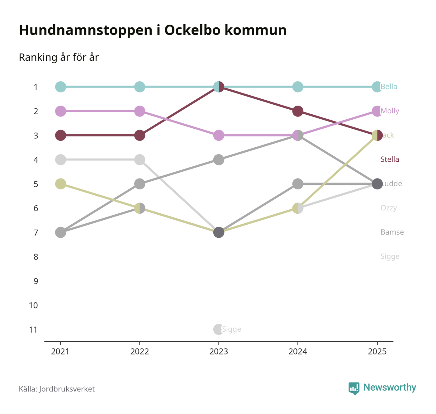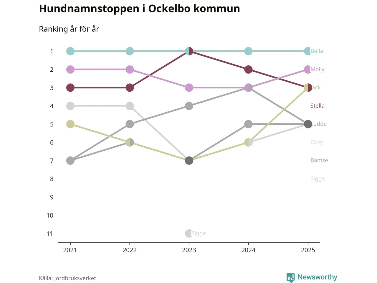 Molly är fortsatt ohotad etta bland hundnamnen i Sverige, följt av Bella och Charlie. Så har det sett ut flera år i rad, men bland Ockelbohundarna är