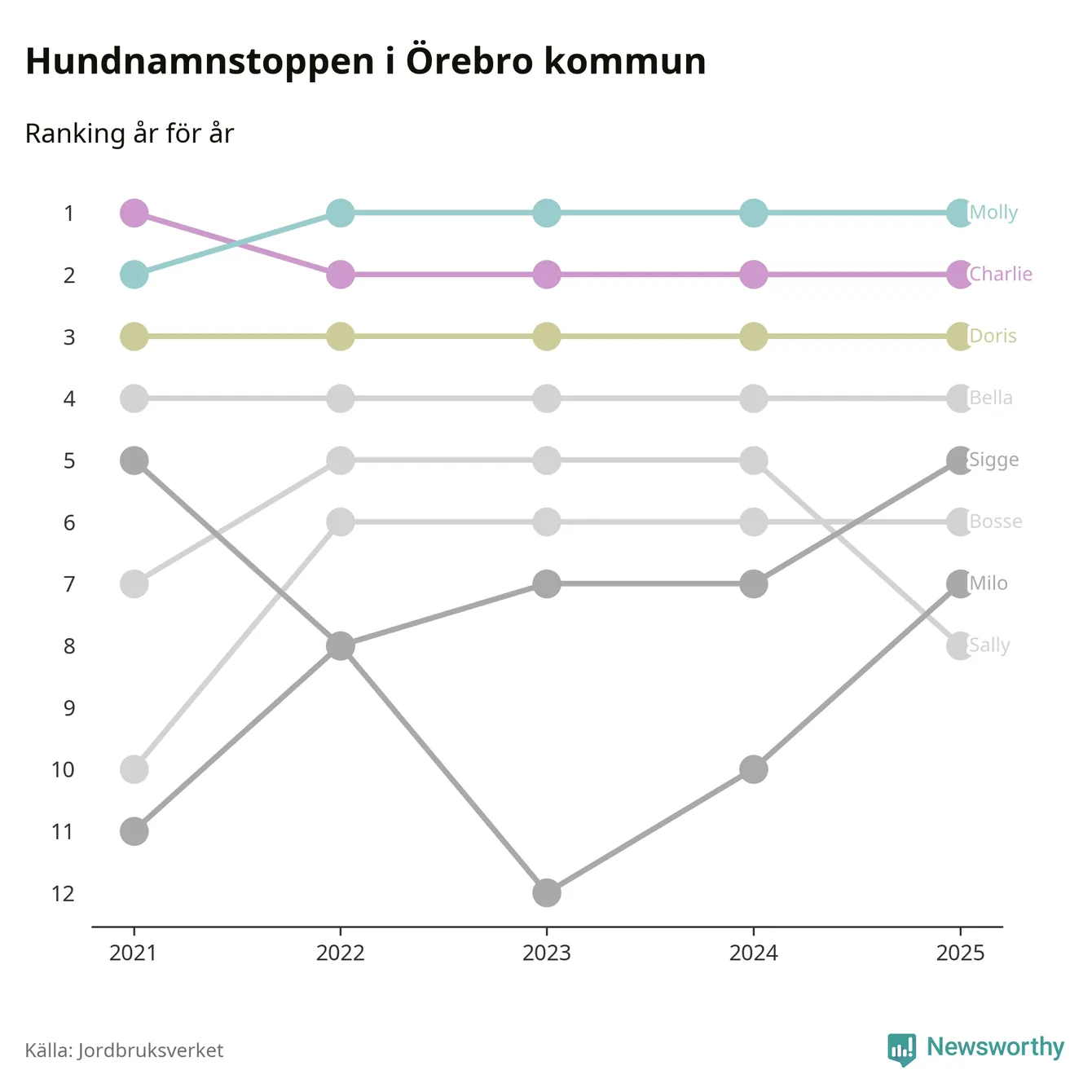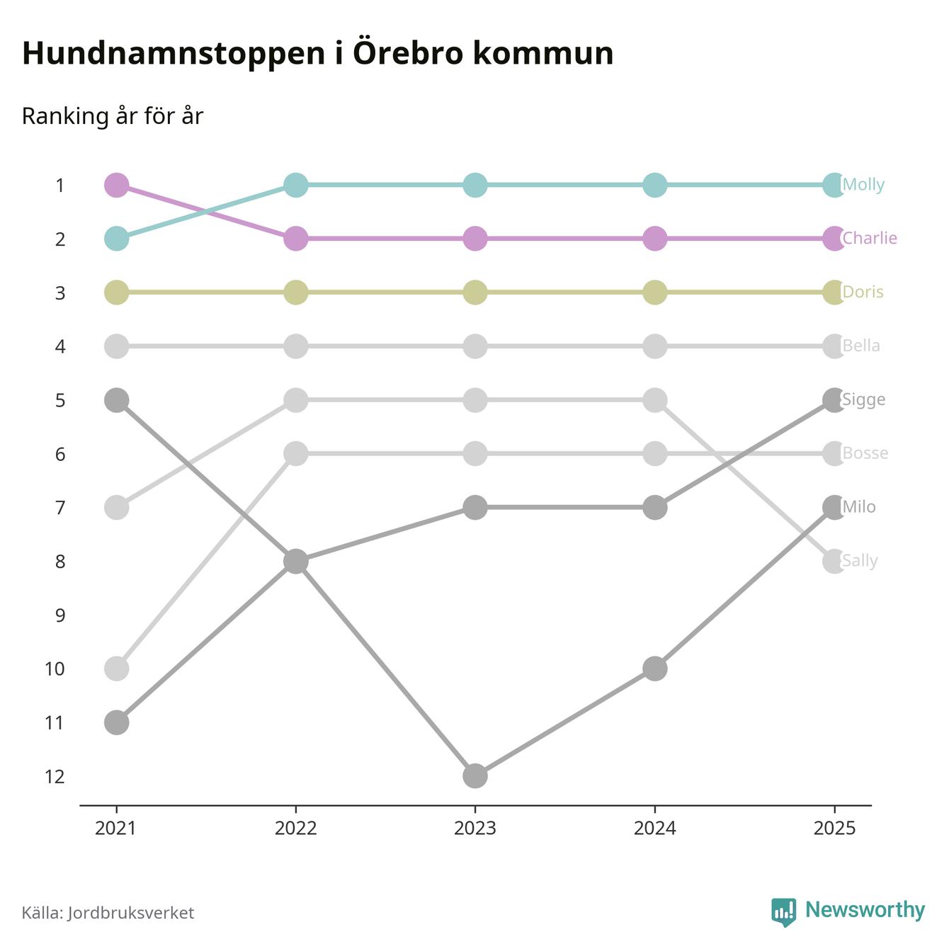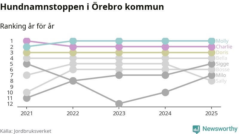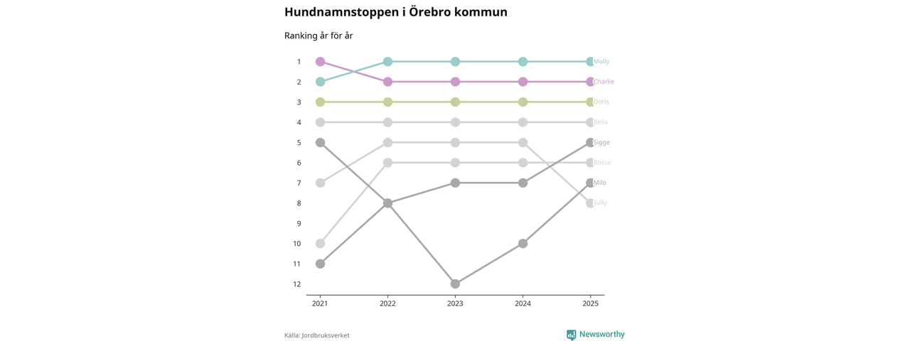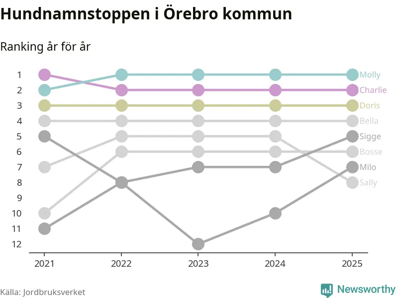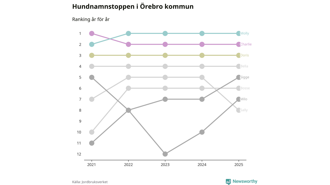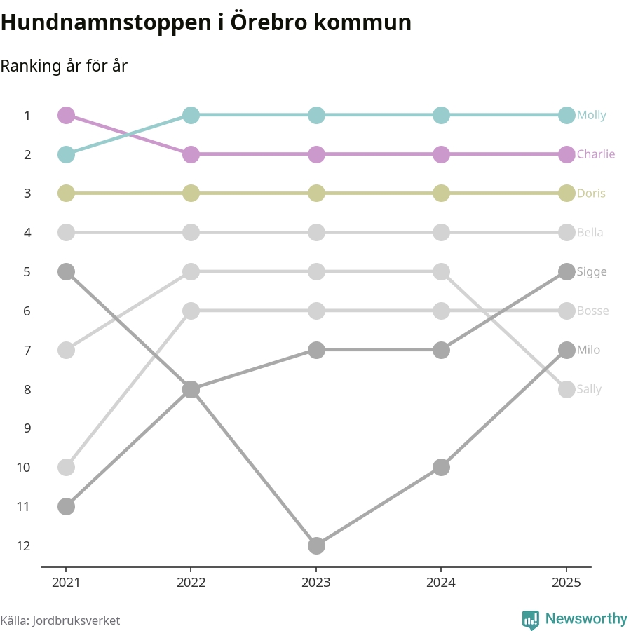 I hela landet är Molly det ohotat populäraste tilltalsnamnet för hundar sedan flera år, följt av Bella och Charlie. Något av de tre namnen toppar listan i 243 av 290 kommuner, och de har varit de vanligaste namnen sedan åtminstone 2018. Men det fjärde populäraste namnet, Doris, knappade in på ledartrion och kommer snart kunna utmana Charlie om tredjeplatsen, om trenden håller i sig.