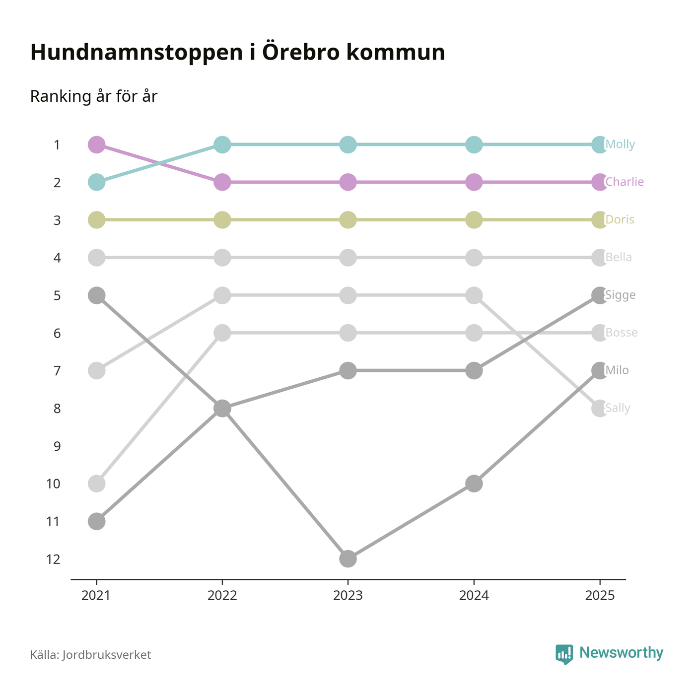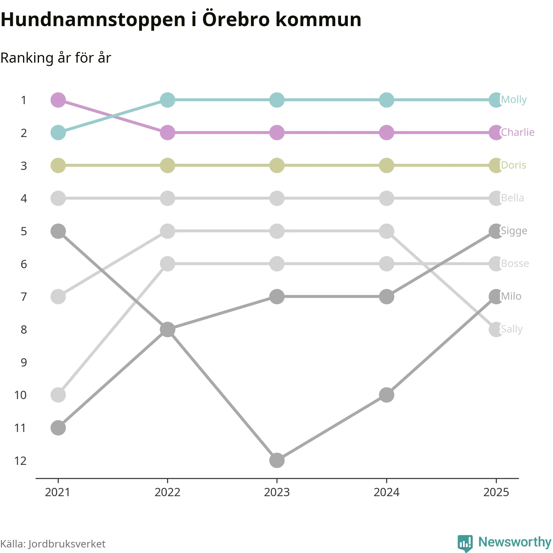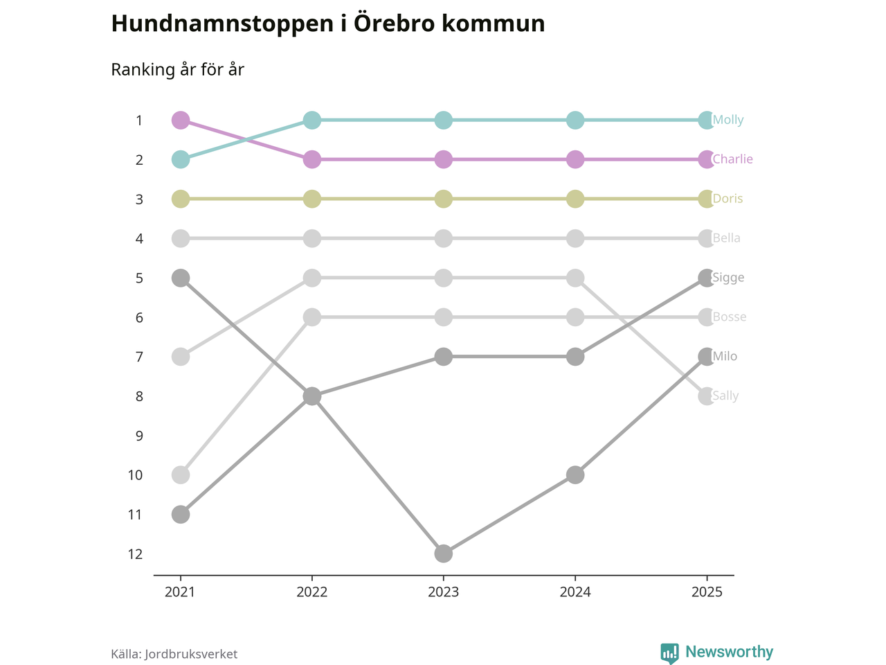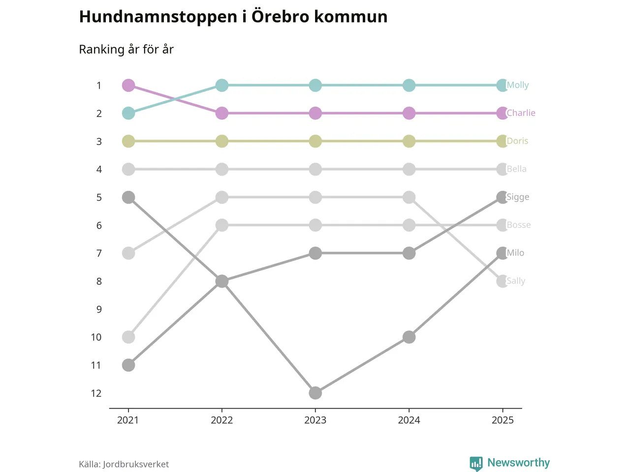 I hela landet är Molly det ohotat populäraste tilltalsnamnet för hundar sedan flera år, följt av Bella och Charlie. Något av de tre namnen toppar listan i 243 av 290 kommuner, och de har varit de vanligaste namnen sedan åtminstone 2018. Men det fjärde populäraste namnet, Doris, knappade in på ledartrion och kommer snart kunna utmana Charlie om tredjeplatsen, om trenden håller i sig.