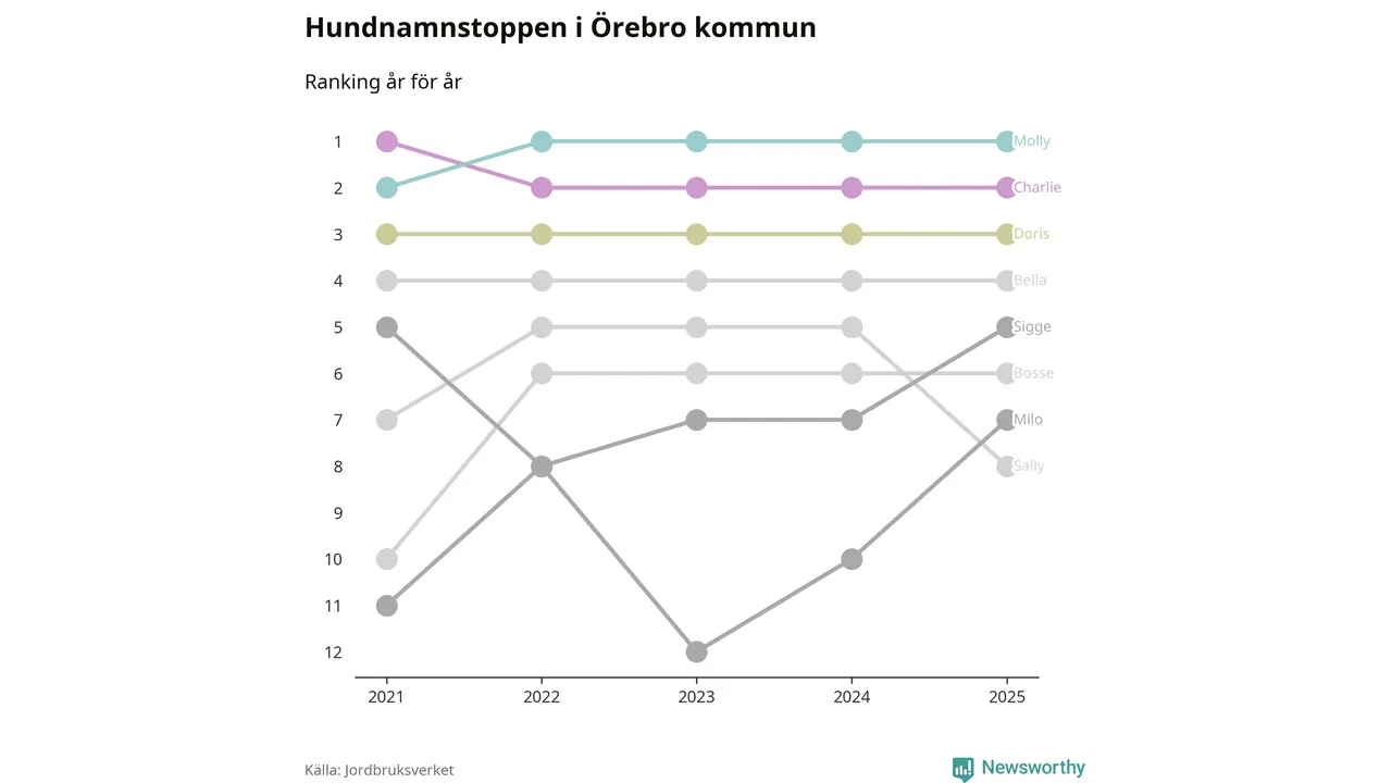 Molly är fortsatt ohotad etta bland hundnamnen i Sverige, följt av Bella och Charlie. Så har det sett ut flera år i rad, och även bland Örebrohundarna ligger alltså Molly i topp.