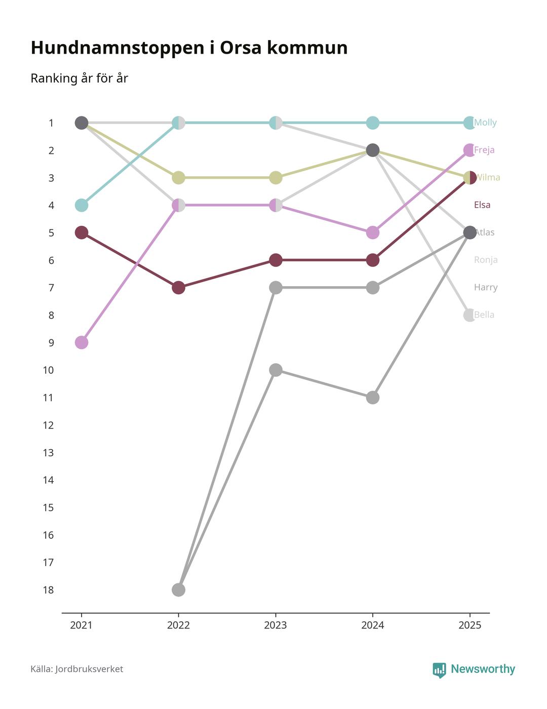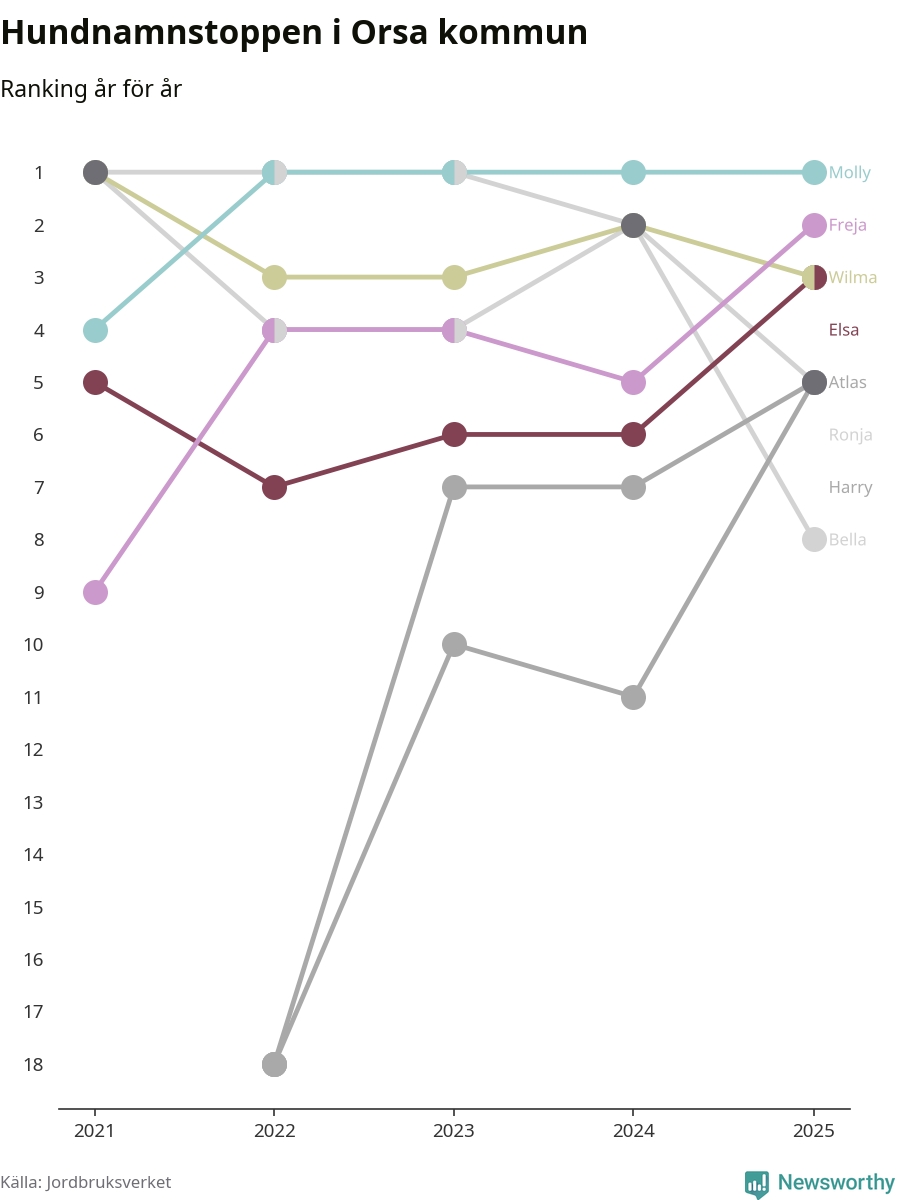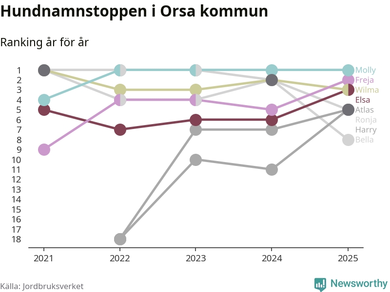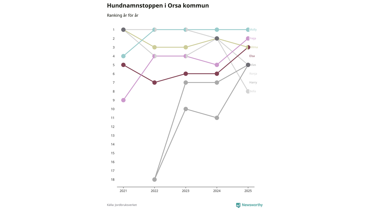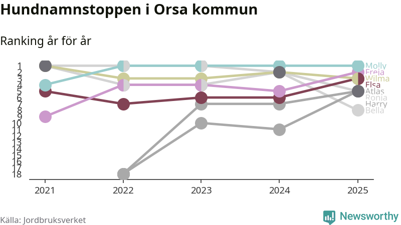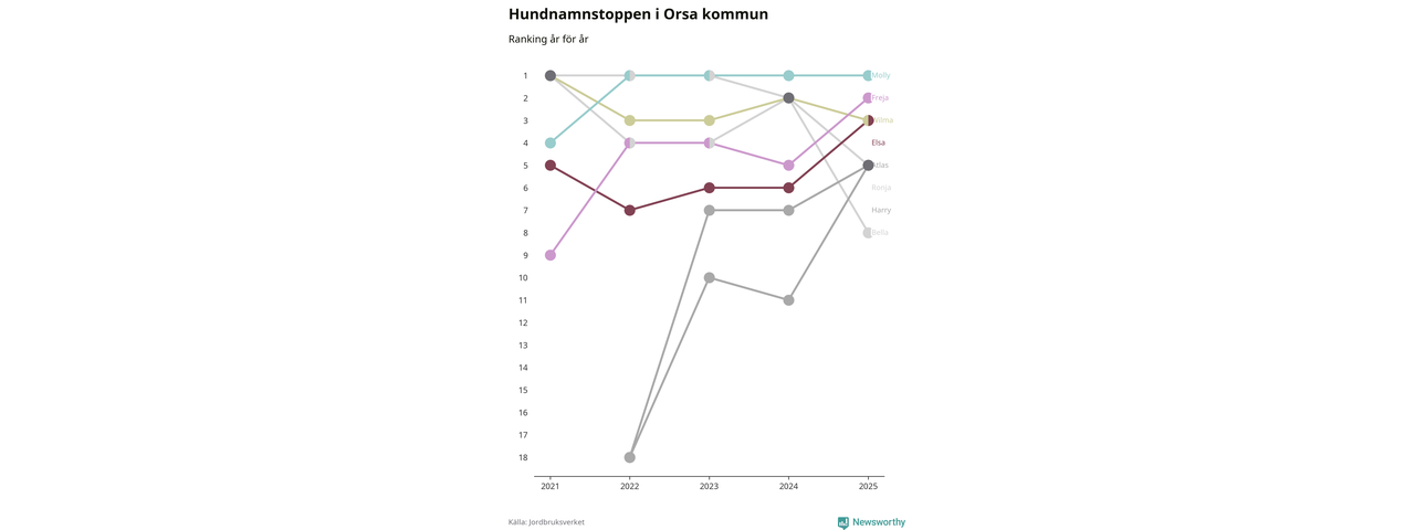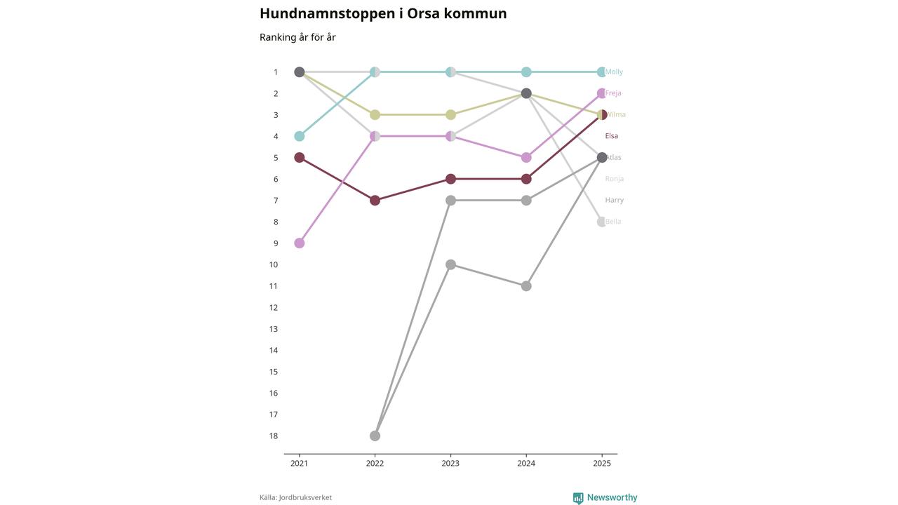 Molly toppar hundnamnsligan i Orsa kommun, precis som i landet som helhet. Det visar färsk statistik från Jordbruksverket. Här finns hela topplistan för kommunen.