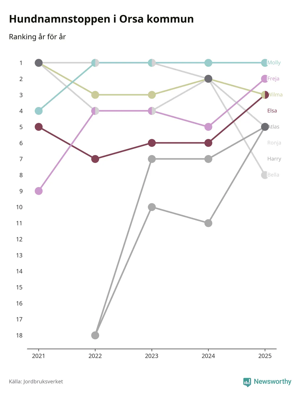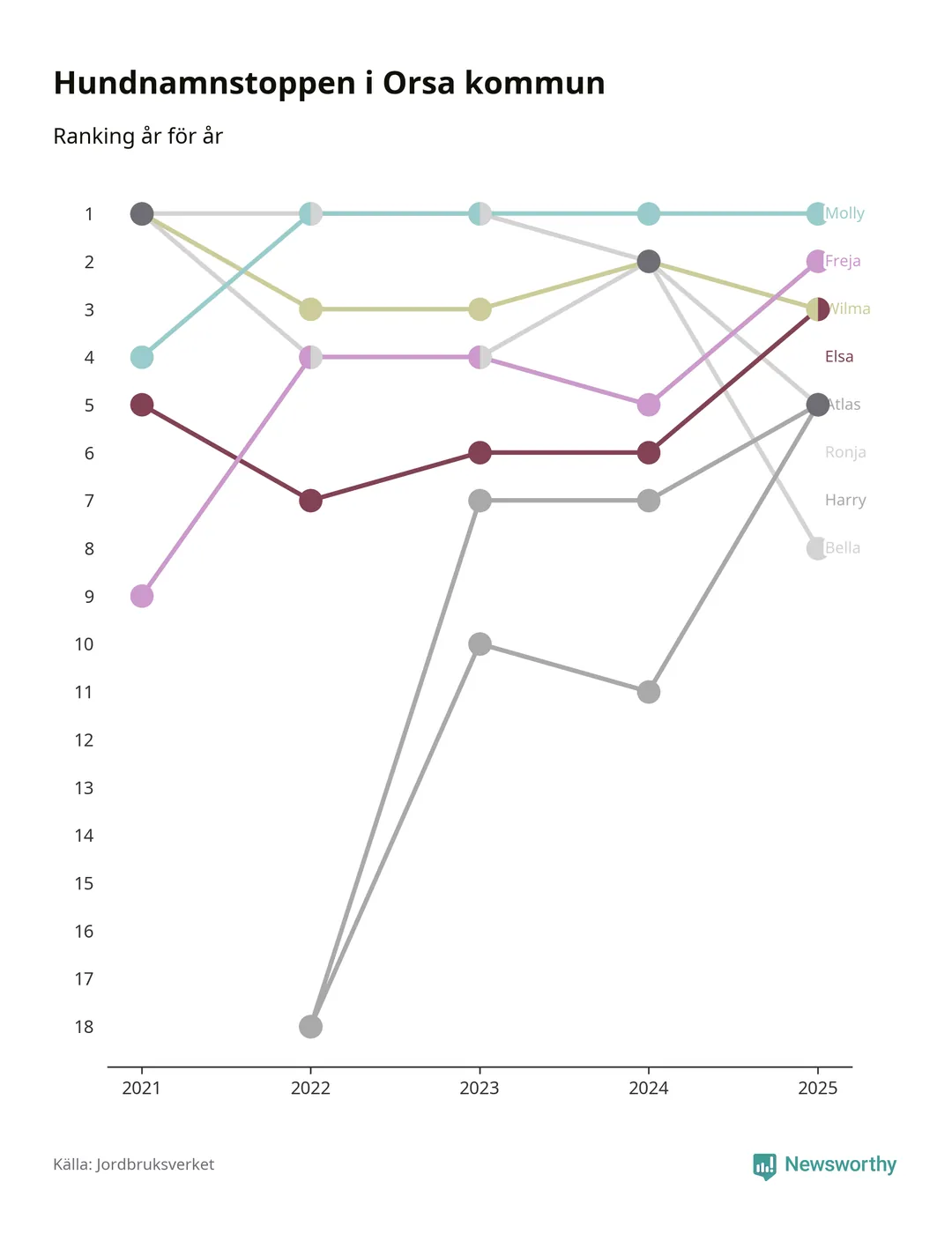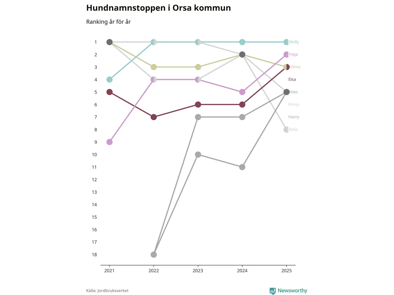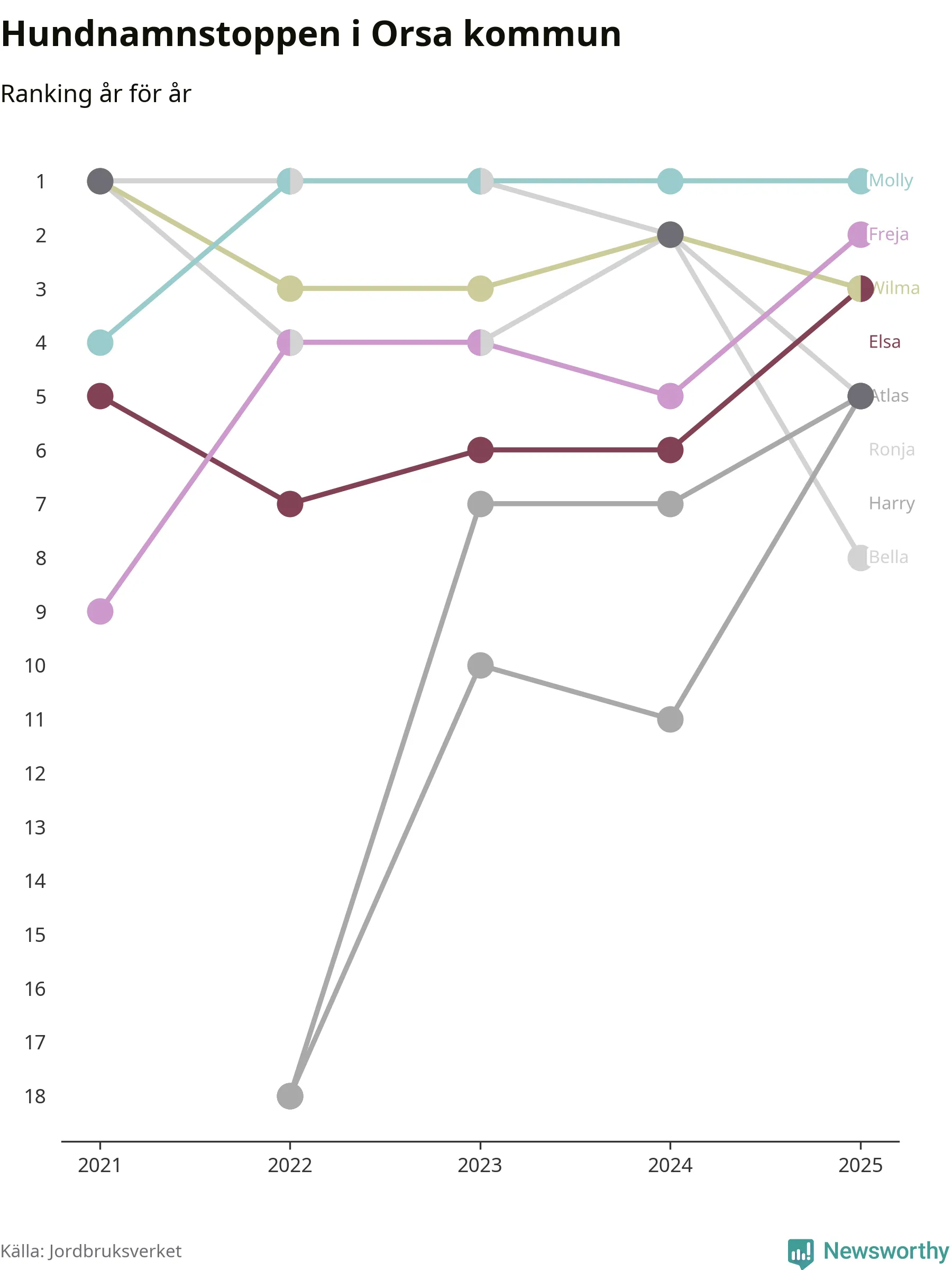 Molly toppar hundnamnsligan i Orsa kommun, precis som i landet som helhet. Det visar färsk statistik från Jordbruksverket. Här finns hela topplistan för kommunen.