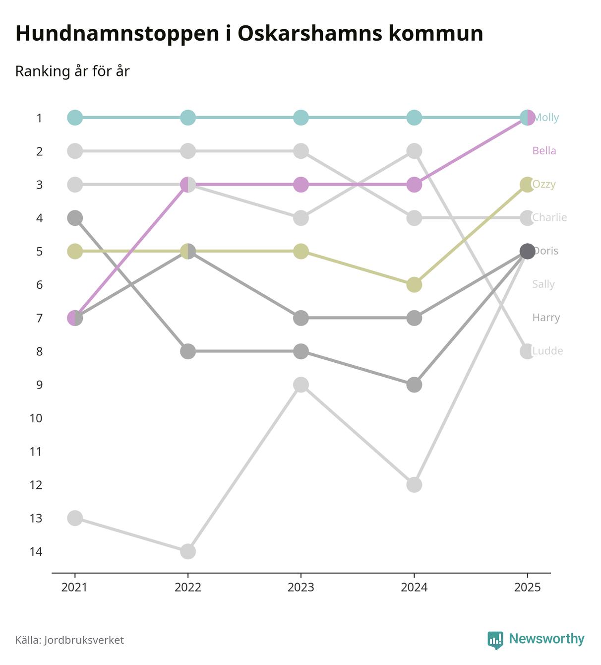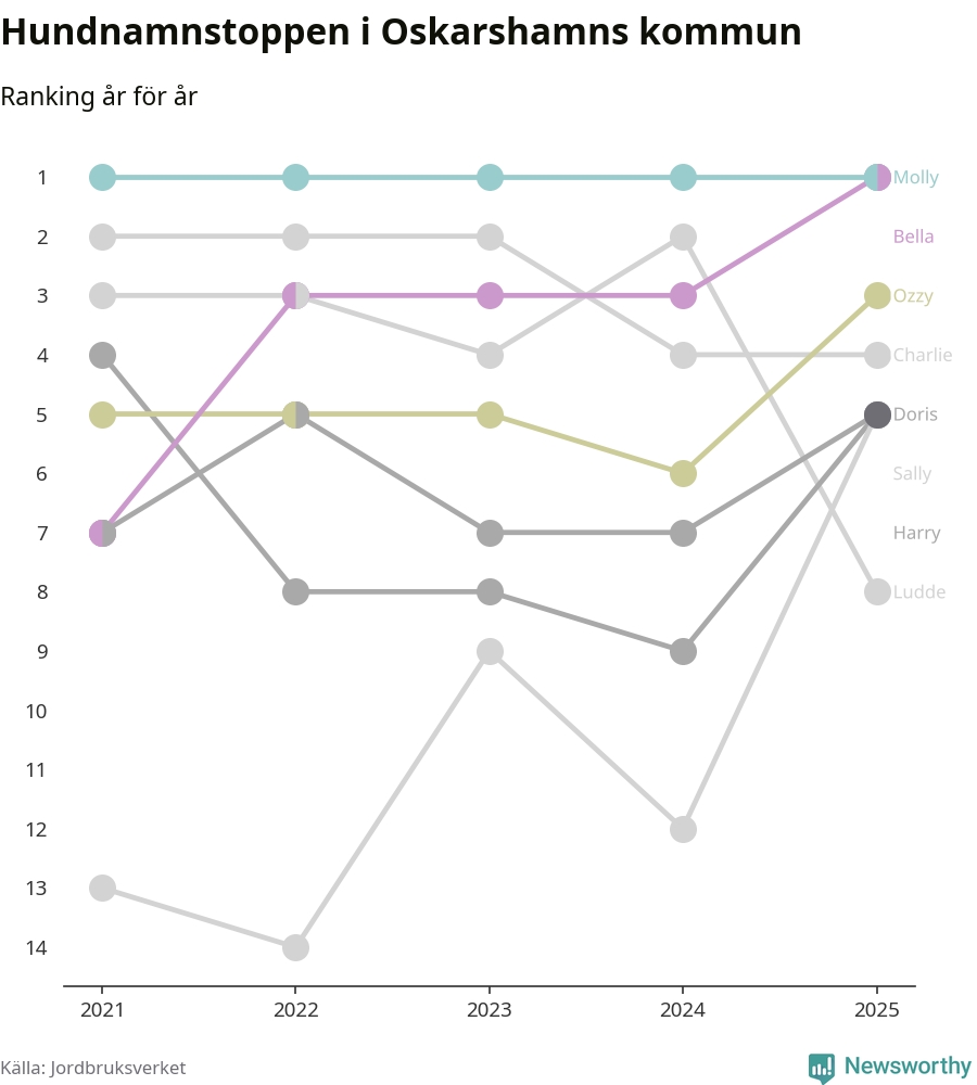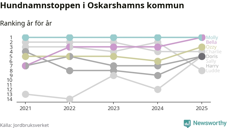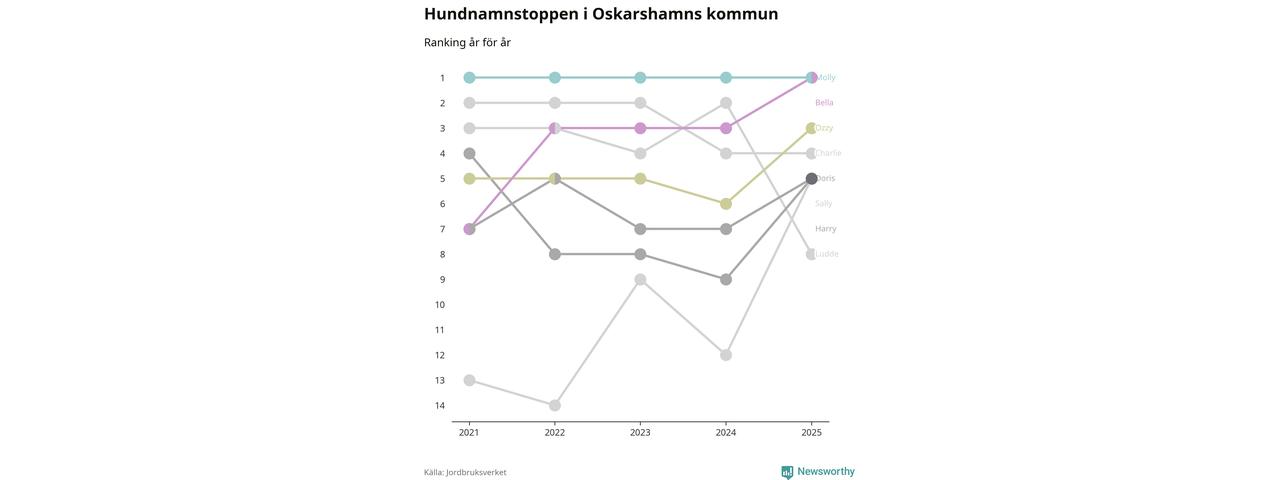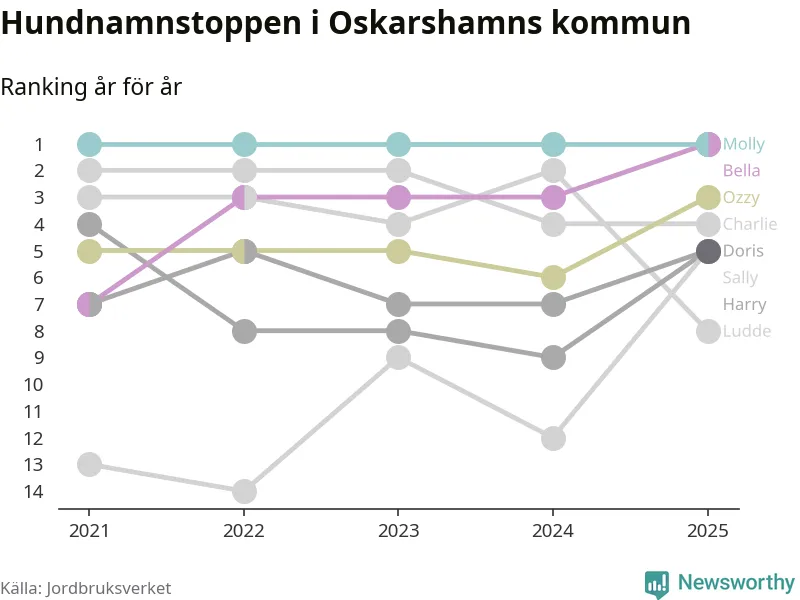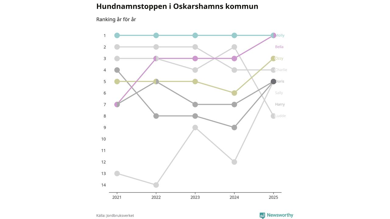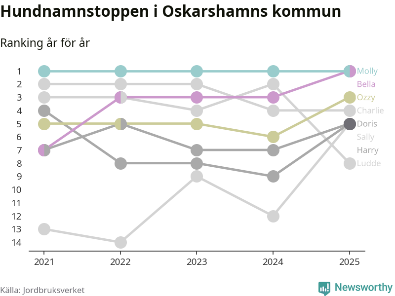 Molly är fortsatt ohotad etta bland hundnamnen i Sverige, följt av Bella och Charlie. Så har det sett ut flera år i rad, och även bland Oskarshamnshundarna ligger Molly i topp, tillsammans med Bella.