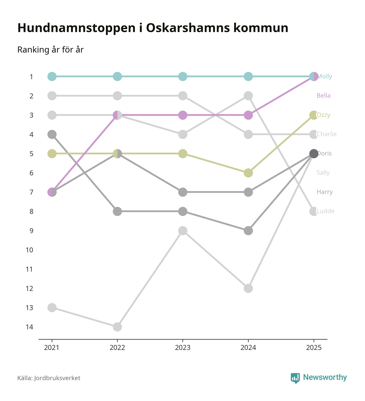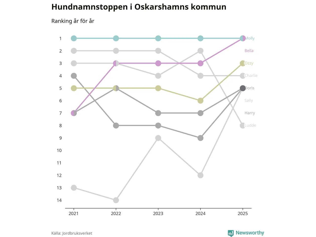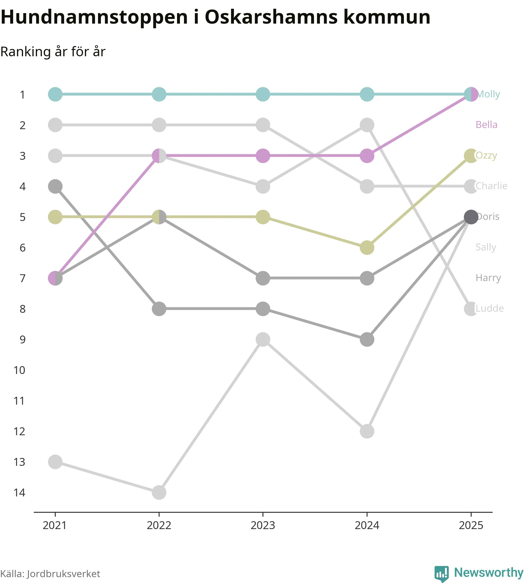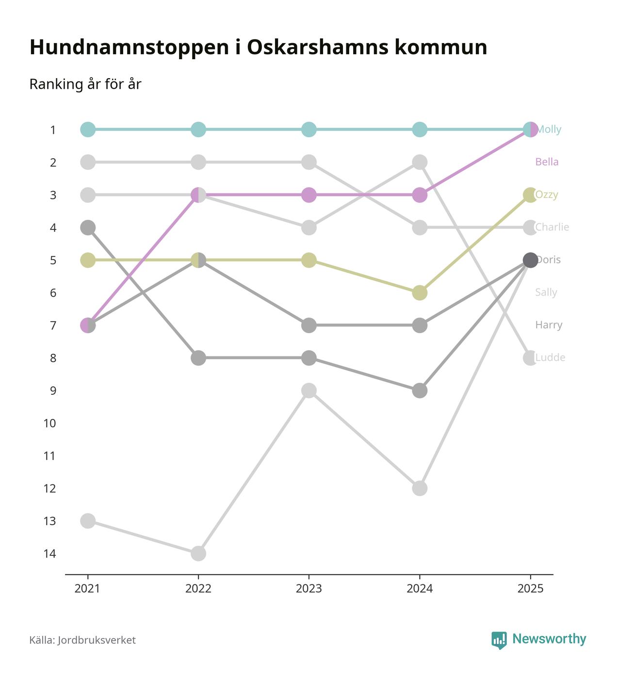 Molly är fortsatt ohotad etta bland hundnamnen i Sverige, följt av Bella och Charlie. Så har det sett ut flera år i rad, och även bland Oskarshamnshundarna ligger Molly i topp, tillsammans med Bella.