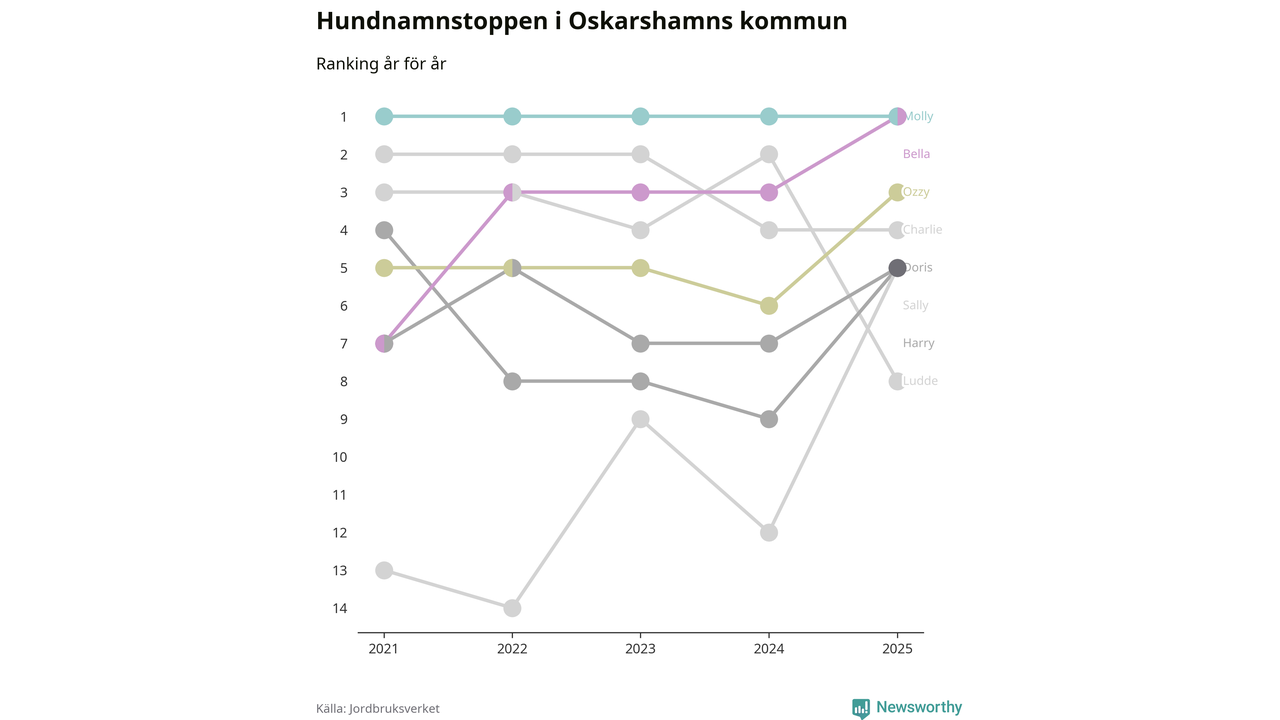 Sally klättrar på topplistan bland Oskarshamns hundnamn, visar ny statistik från Jordbruksverkets hundregister.