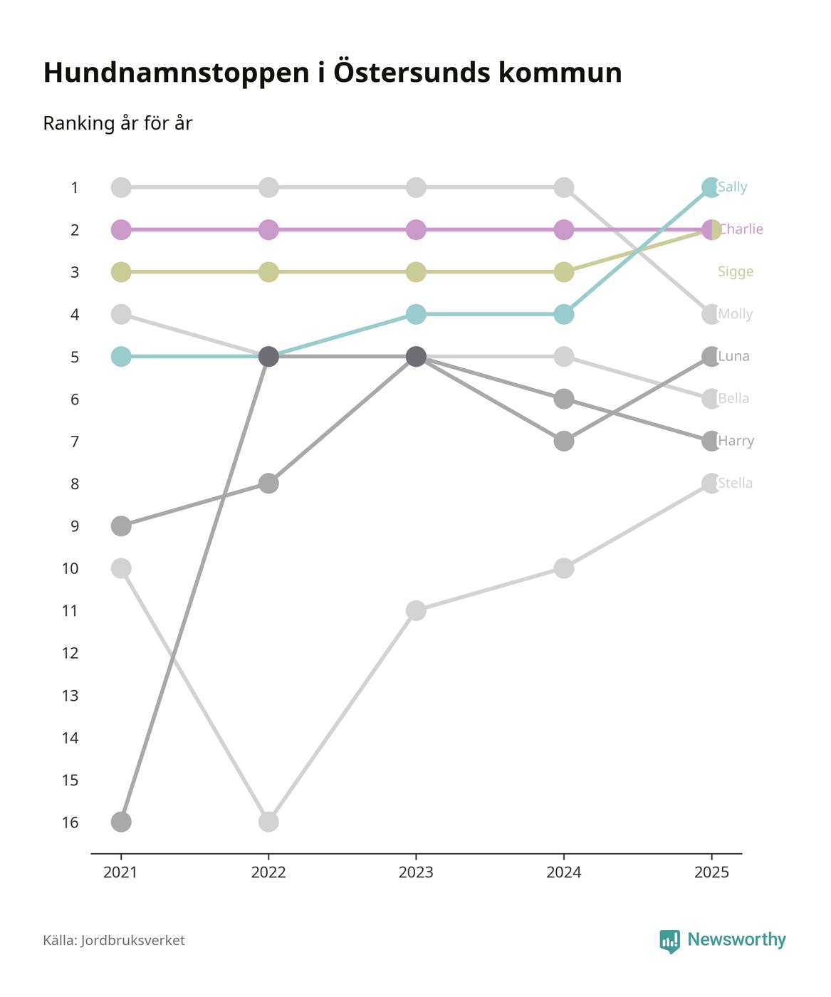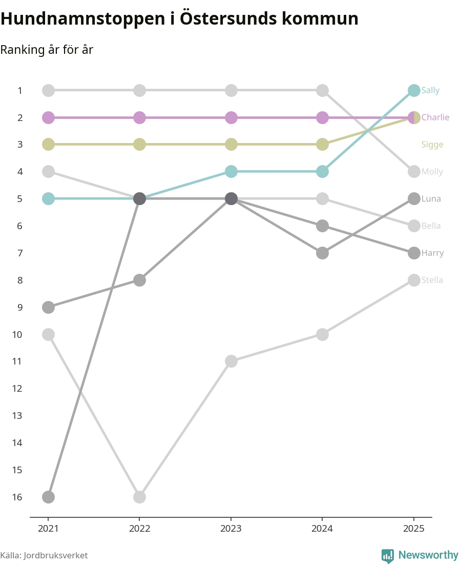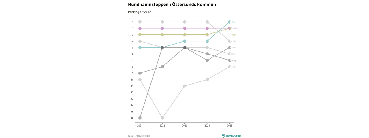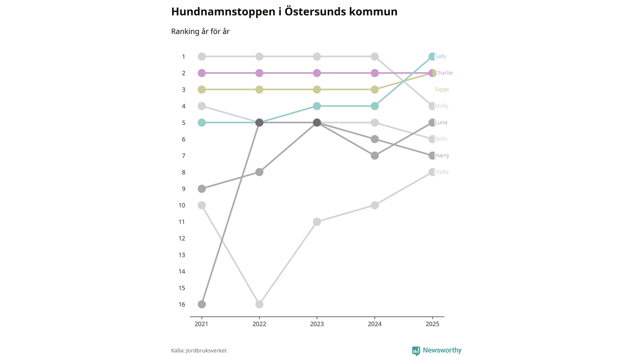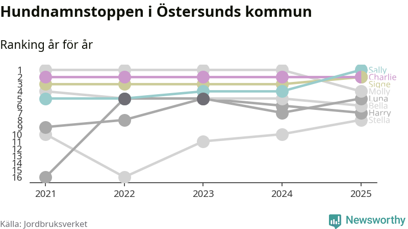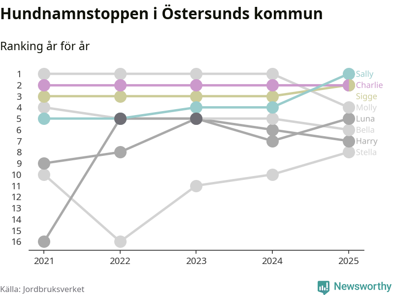 Molly är fortsatt ohotad etta bland hundnamnen i Sverige, följt av Bella och Charlie. Så har det sett ut flera år i rad, men bland Östersundshundarna är Sally populärast. Östersund är en av 18 kommuner i landet där Sally är vanligast, eller på delad förstaplats.