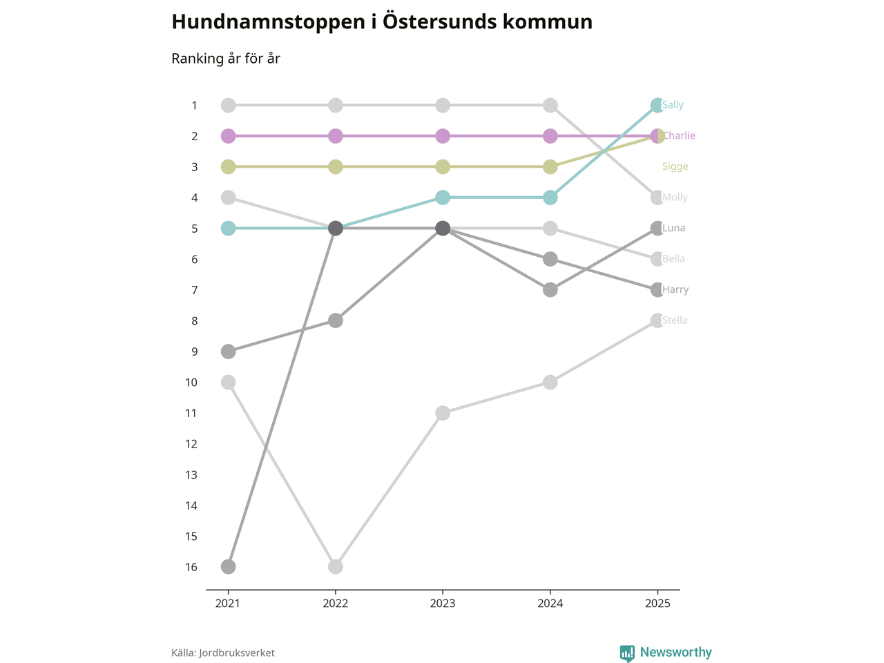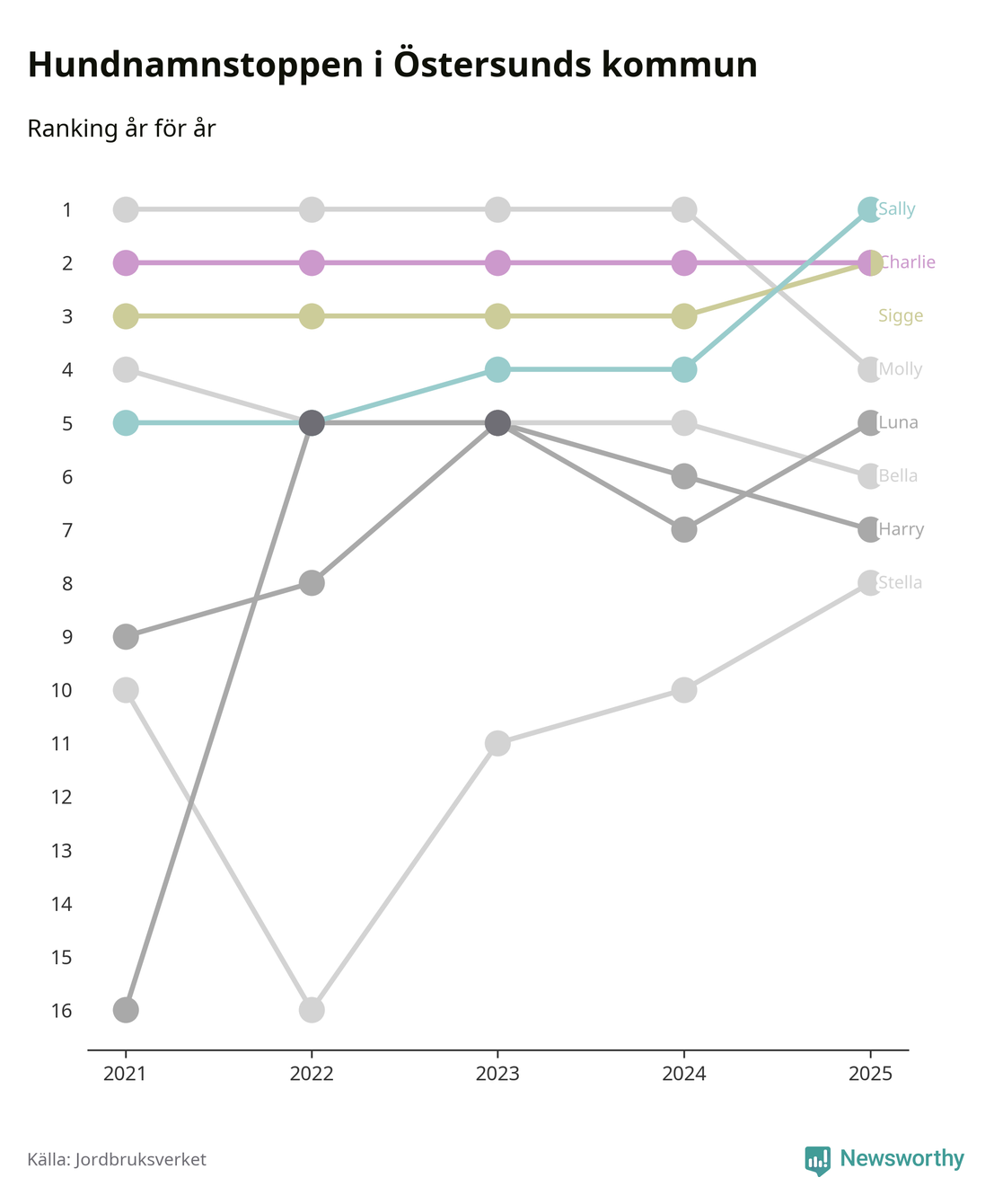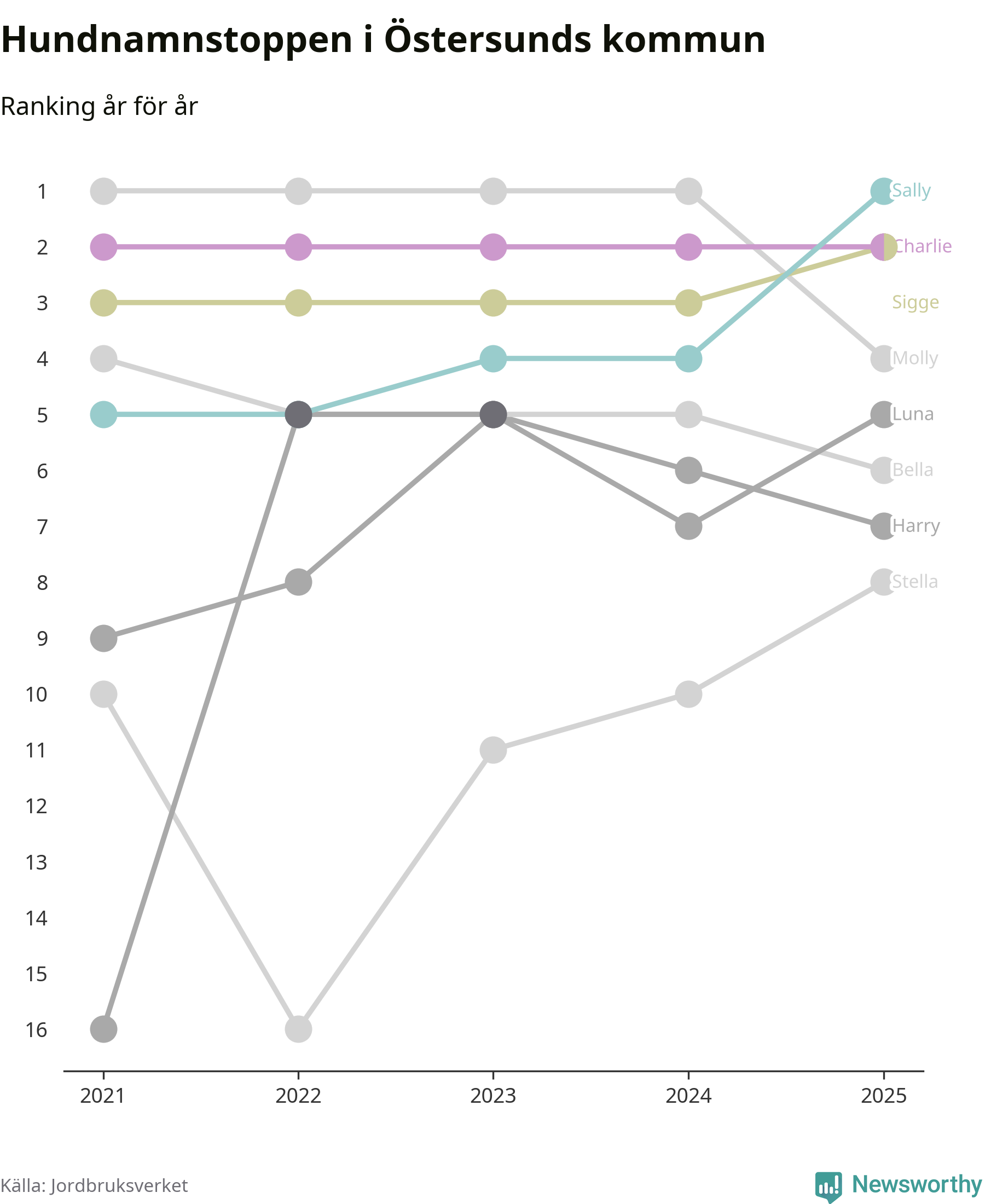 Molly är fortsatt ohotad etta bland hundnamnen i Sverige, följt av Bella och Charlie. Så har det sett ut flera år i rad, men bland Östersundshundarna är Sally populärast. Östersund är en av 18 kommuner i landet där Sally är vanligast, eller på delad förstaplats.