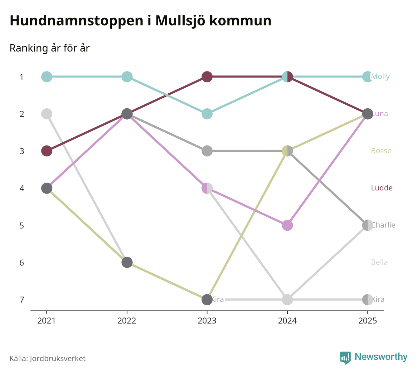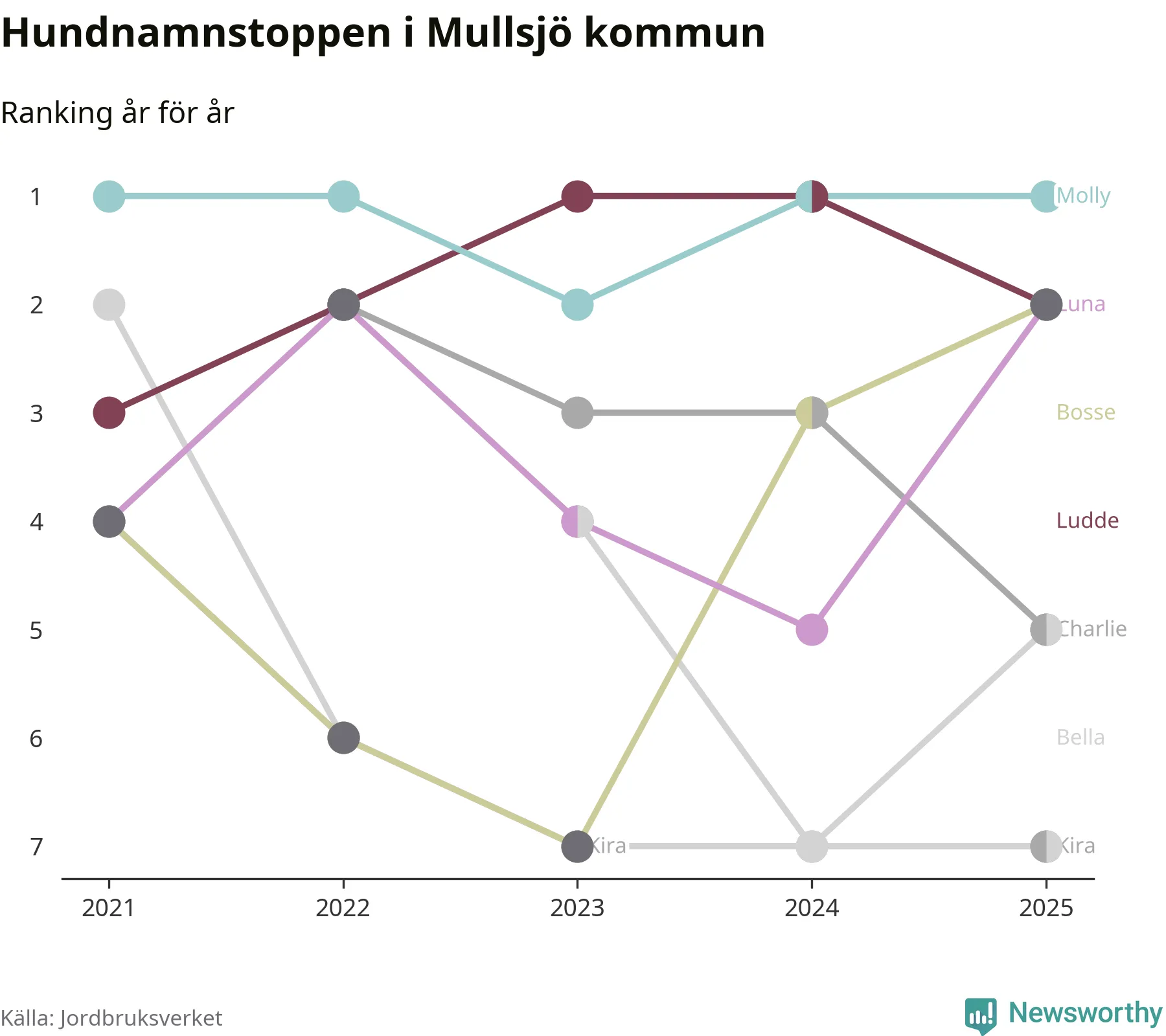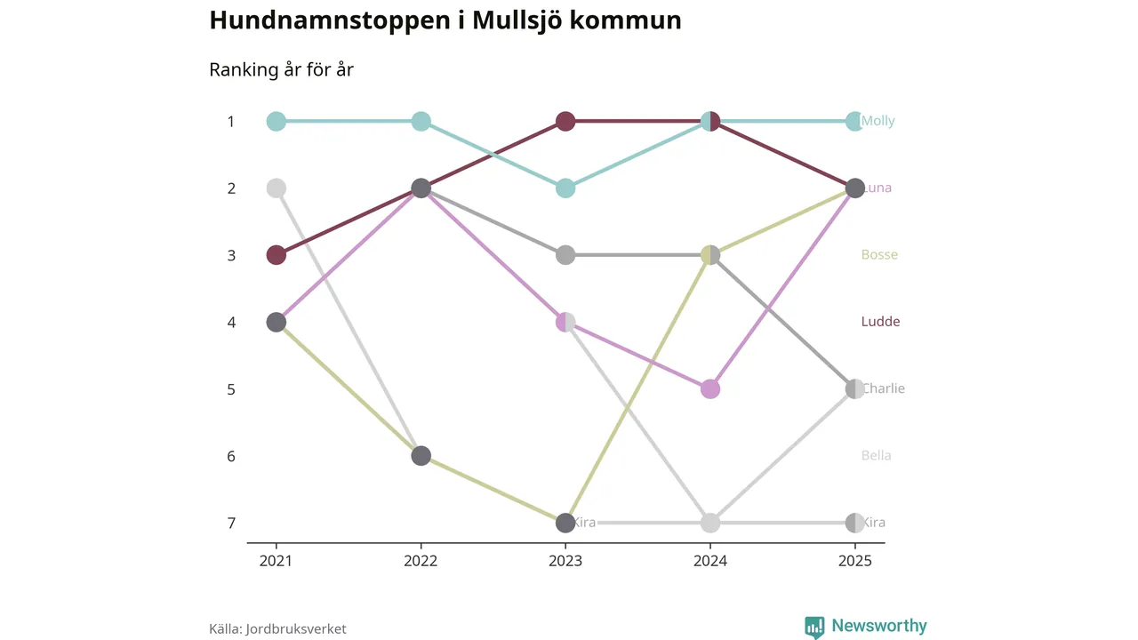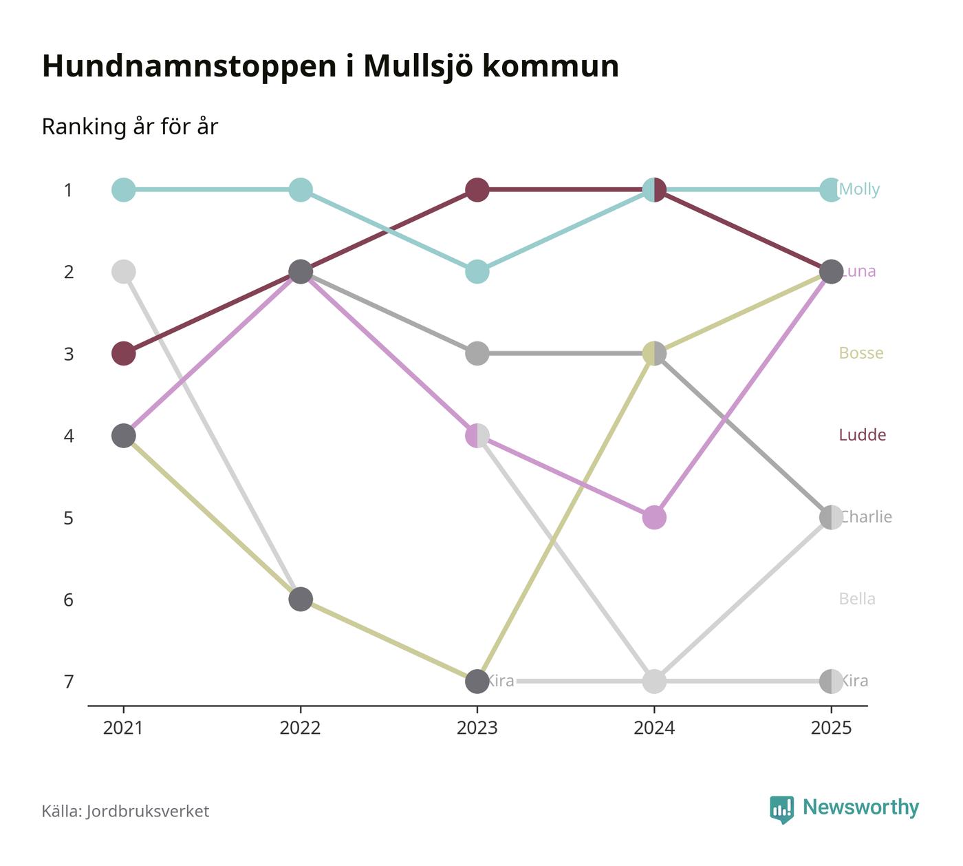 Molly är fortsatt ohotad etta bland hundnamnen i Sverige, följt av Bella och Charlie. Så har det sett ut flera år i rad, och även bland Mullsjöhundarna ligger alltså Molly i topp.