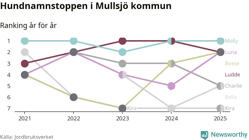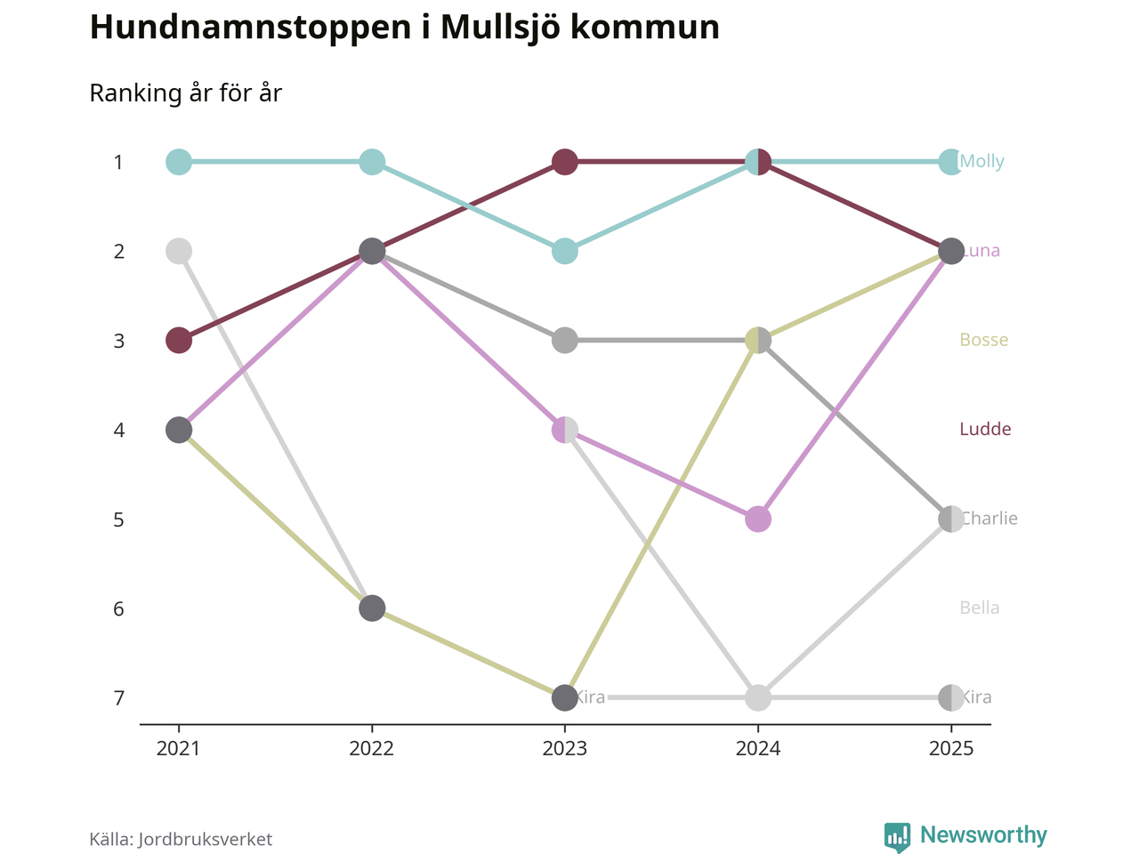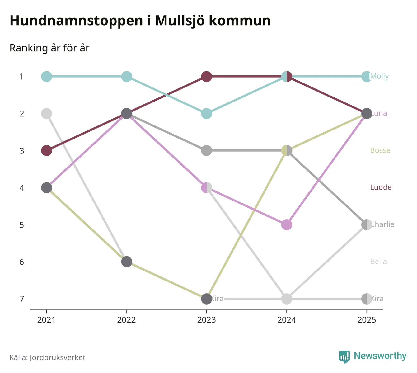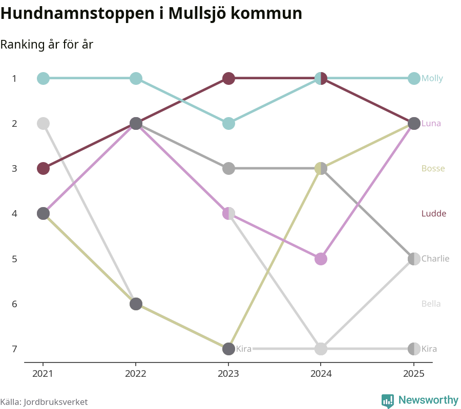 Molly är fortsatt ohotad etta bland hundnamnen i Sverige, följt av Bella och Charlie. Så har det sett ut flera år i rad, och även bland Mullsjöhundarna ligger alltså Molly i topp.