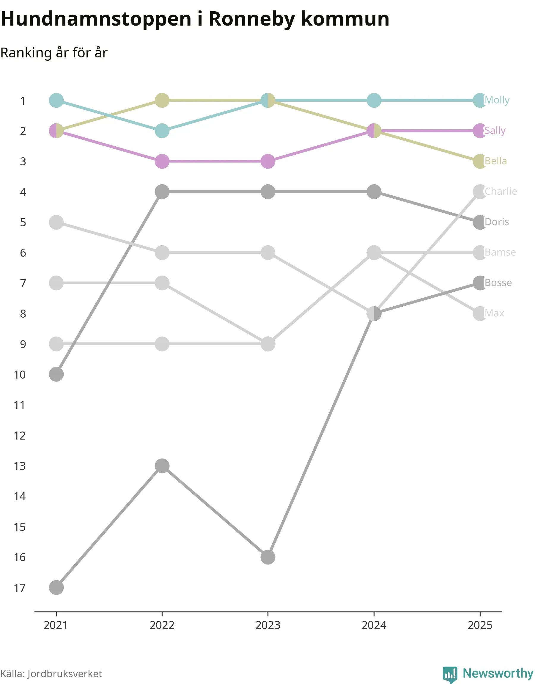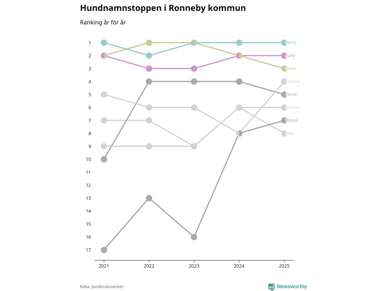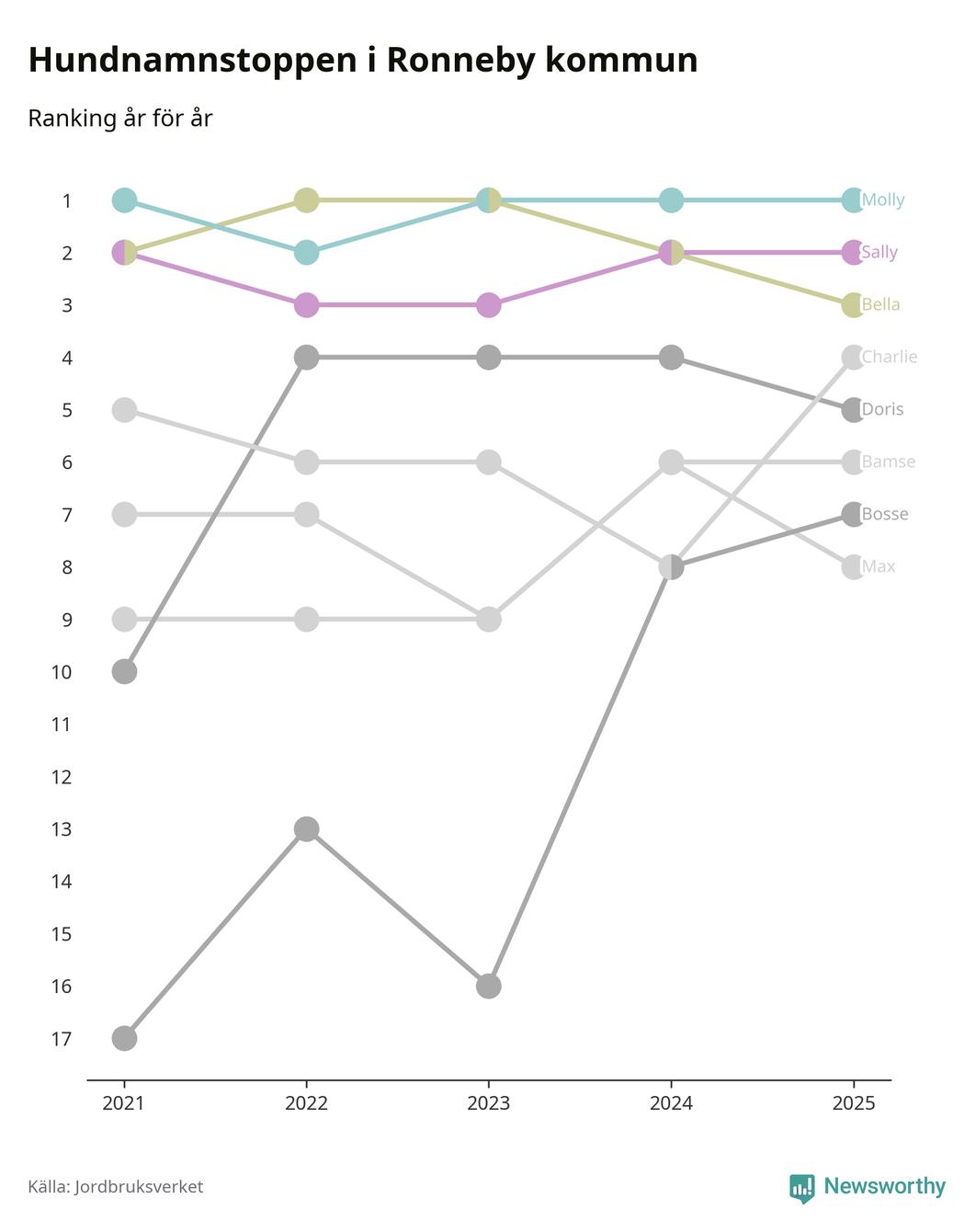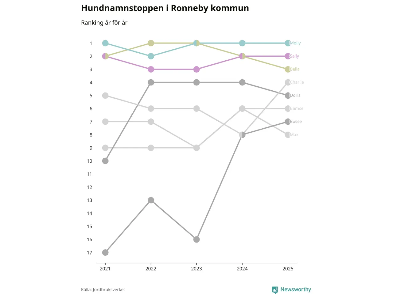 I hela landet är Molly det ohotat populäraste tilltalsnamnet för hundar sedan flera år, följt av Bella och Charlie. Något av de tre namnen toppar listan i 243 av 290 kommuner, och de har varit de vanligaste namnen sedan åtminstone 2018. Men det fjärde populäraste namnet, Doris, knappade in på ledartrion och kommer snart kunna utmana Charlie om tredjeplatsen, om trenden håller i sig.