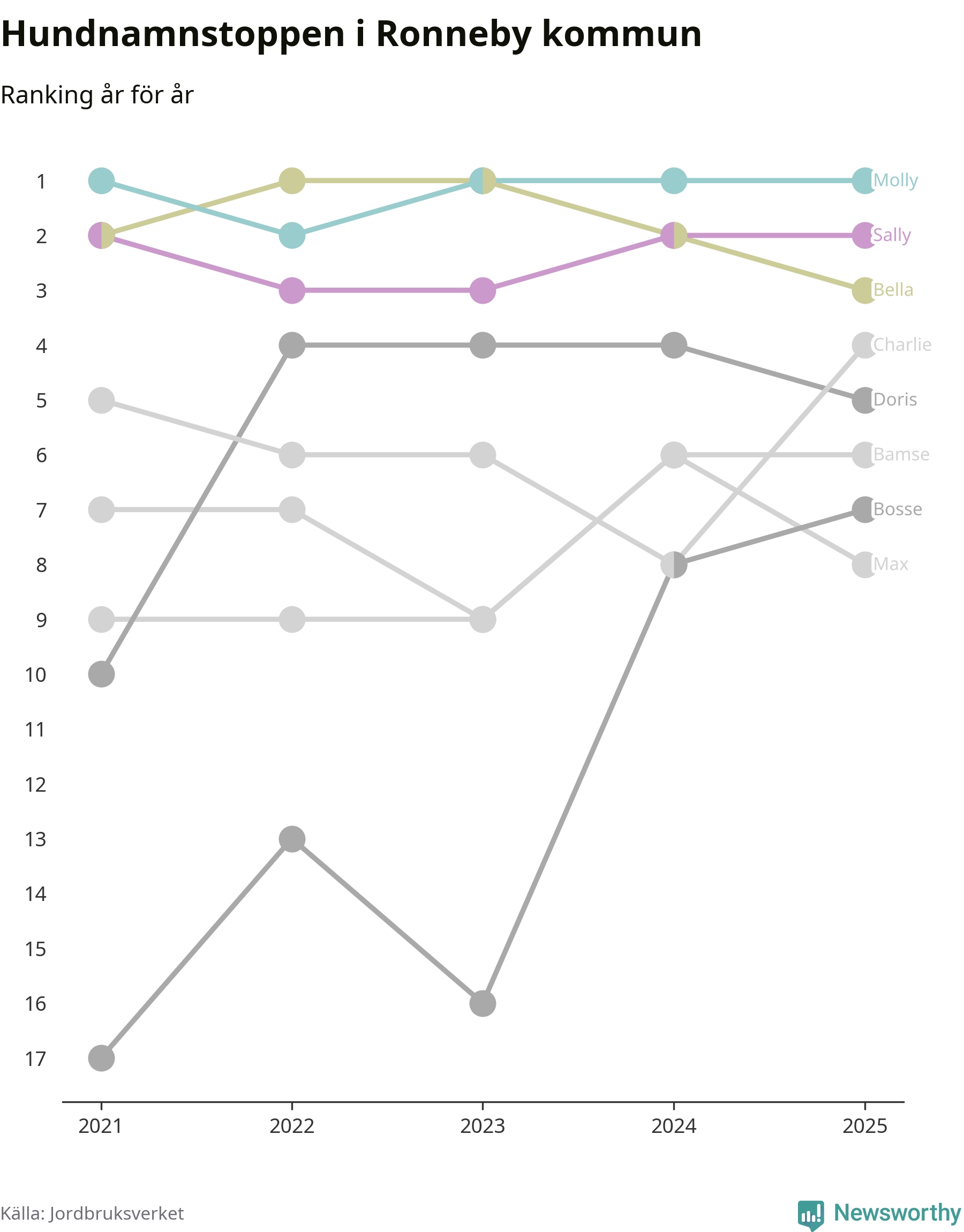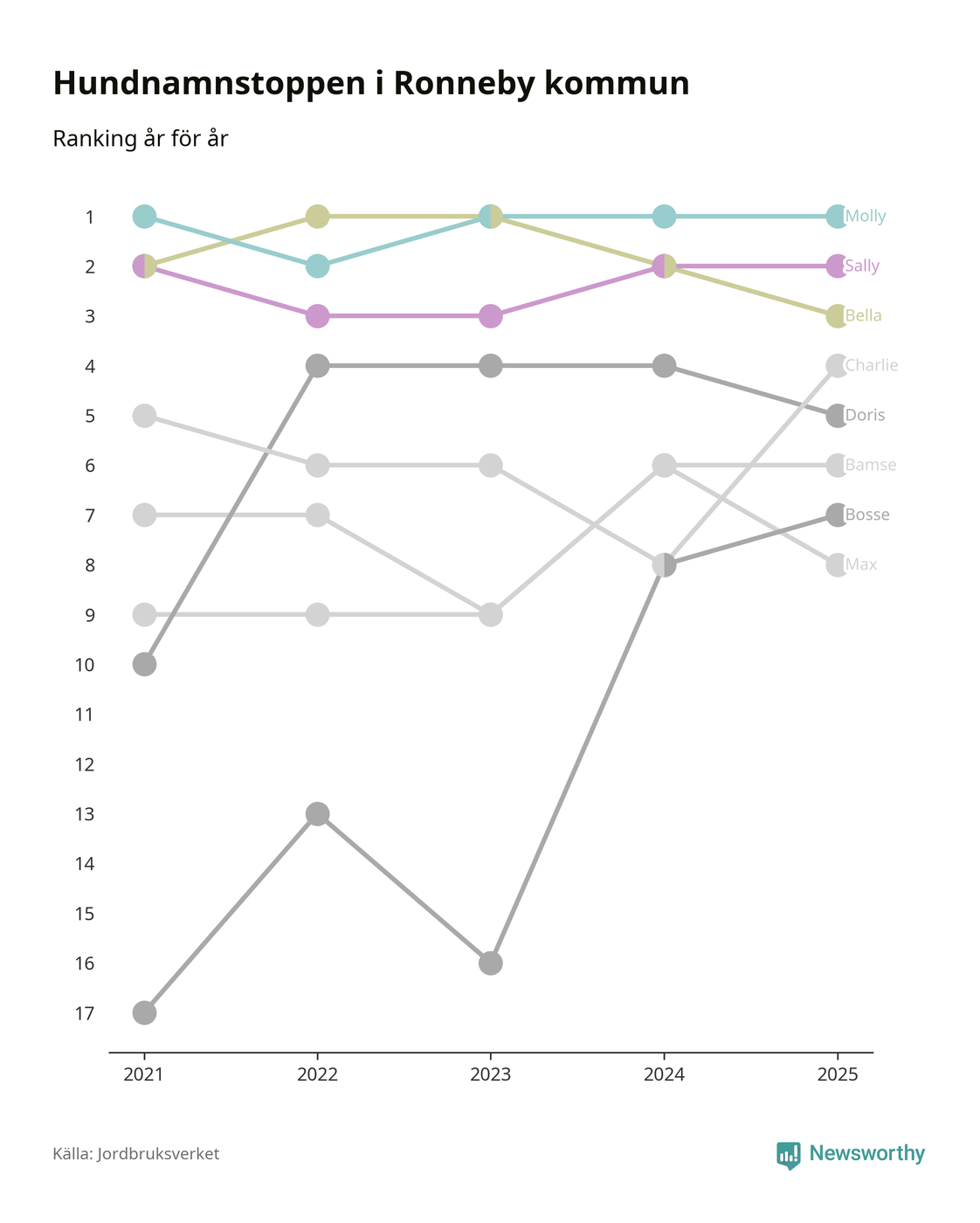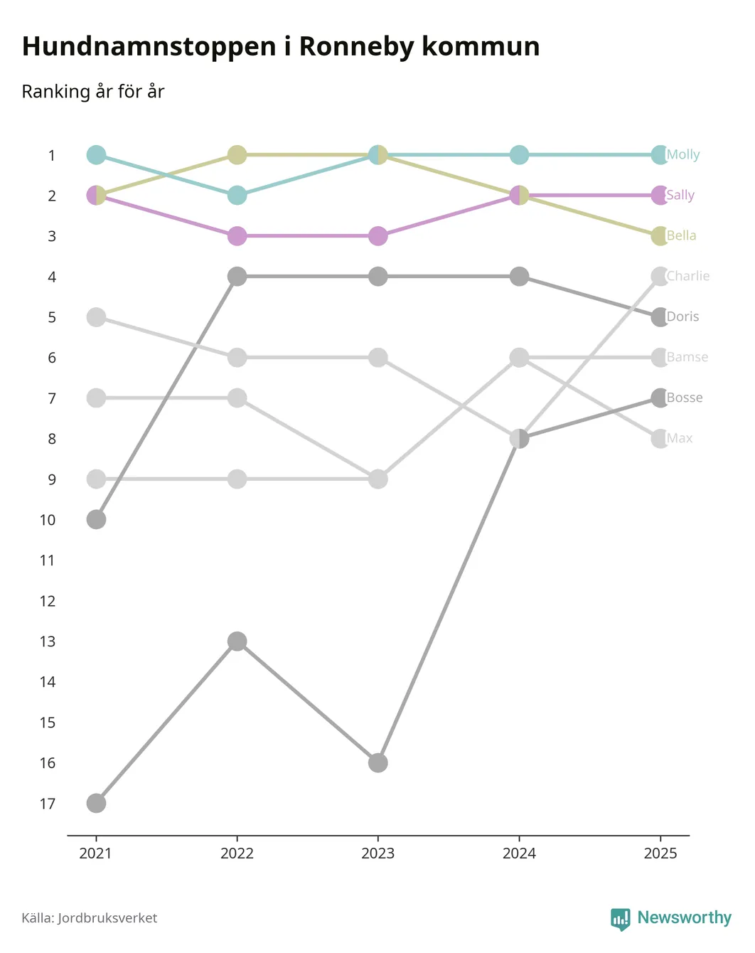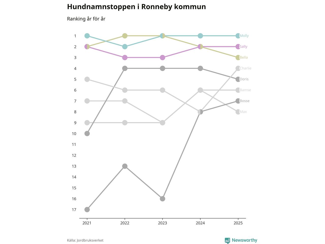 I hela landet är Molly det ohotat populäraste tilltalsnamnet för hundar sedan flera år, följt av Bella och Charlie. Något av de tre namnen toppar listan i 243 av 290 kommuner, och de har varit de vanligaste namnen sedan åtminstone 2018. Men det fjärde populäraste namnet, Doris, knappade in på ledartrion och kommer snart kunna utmana Charlie om tredjeplatsen, om trenden håller i sig.