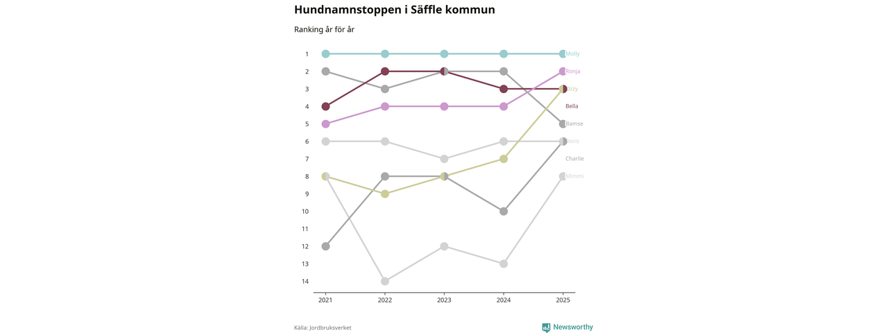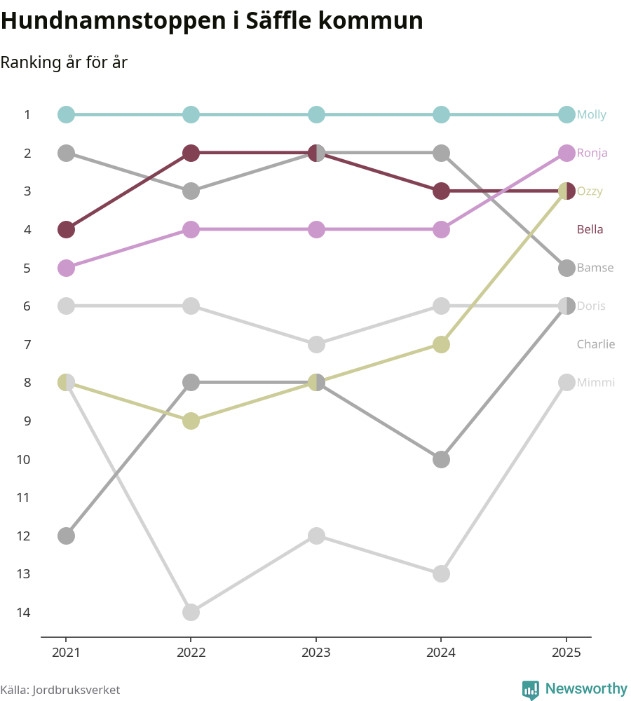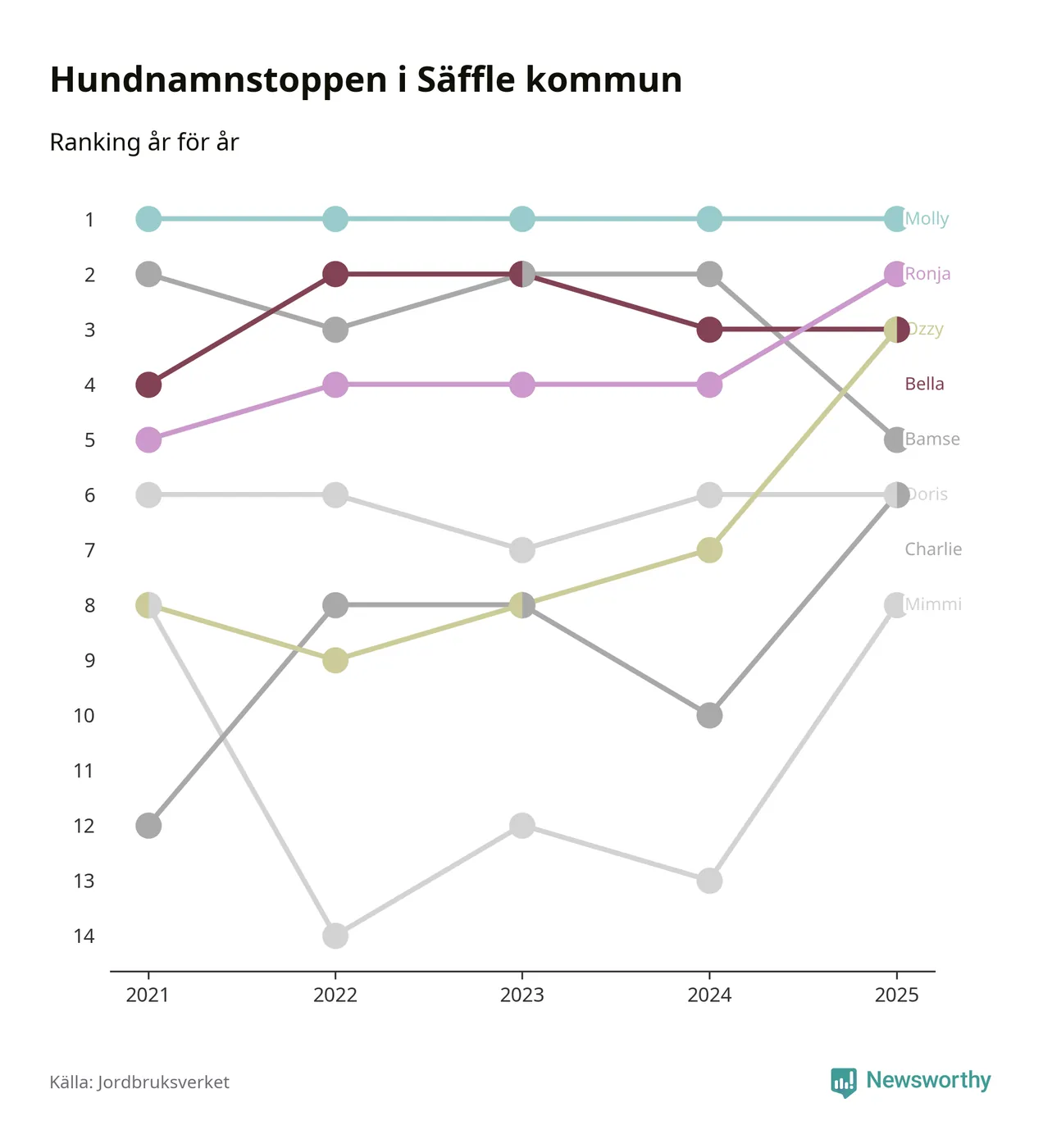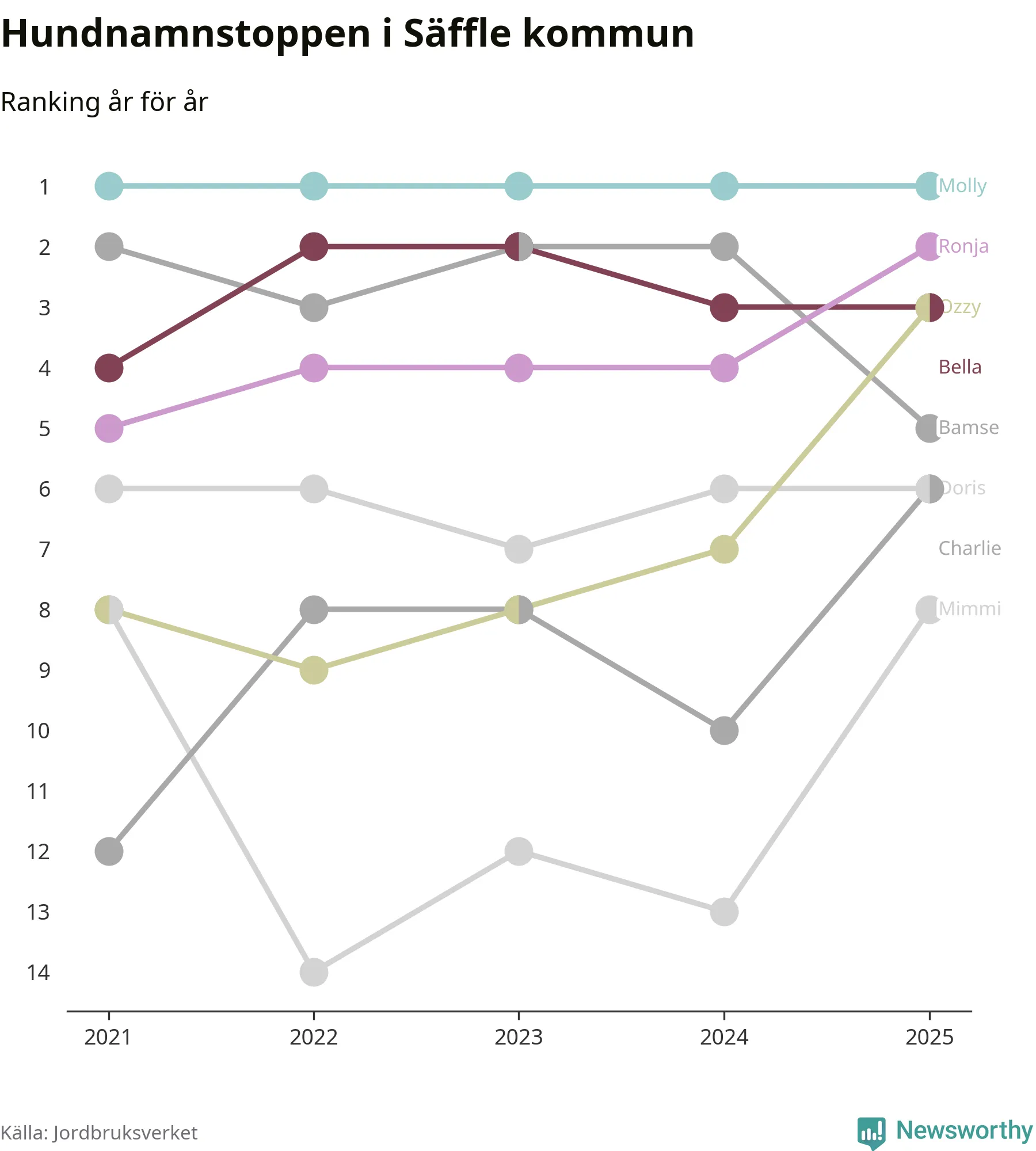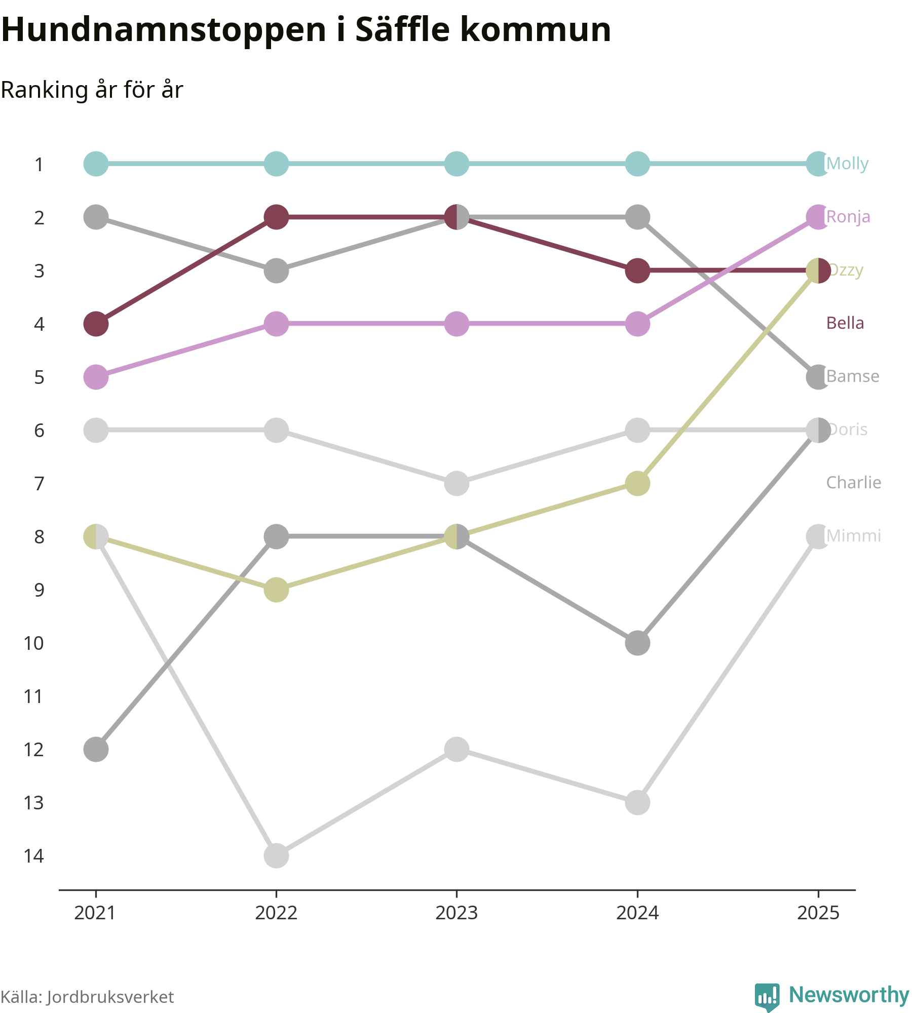 Molly toppar hundnamnsligan i Säffle kommun, precis som i landet som helhet. Det visar färsk statistik från Jordbruksverket. Här finns hela topplistan för kommunen.