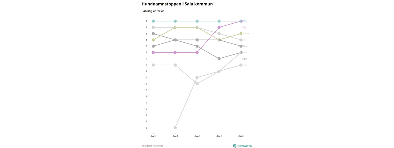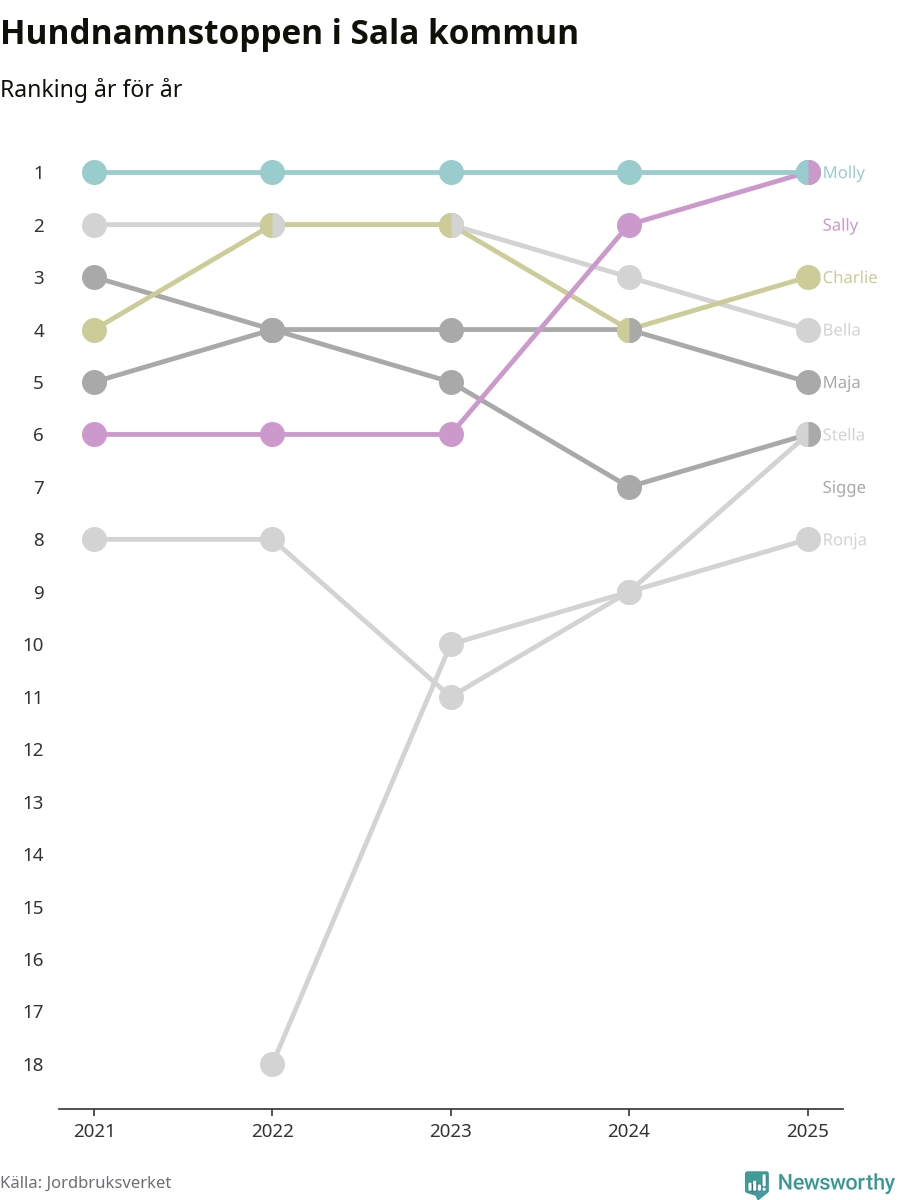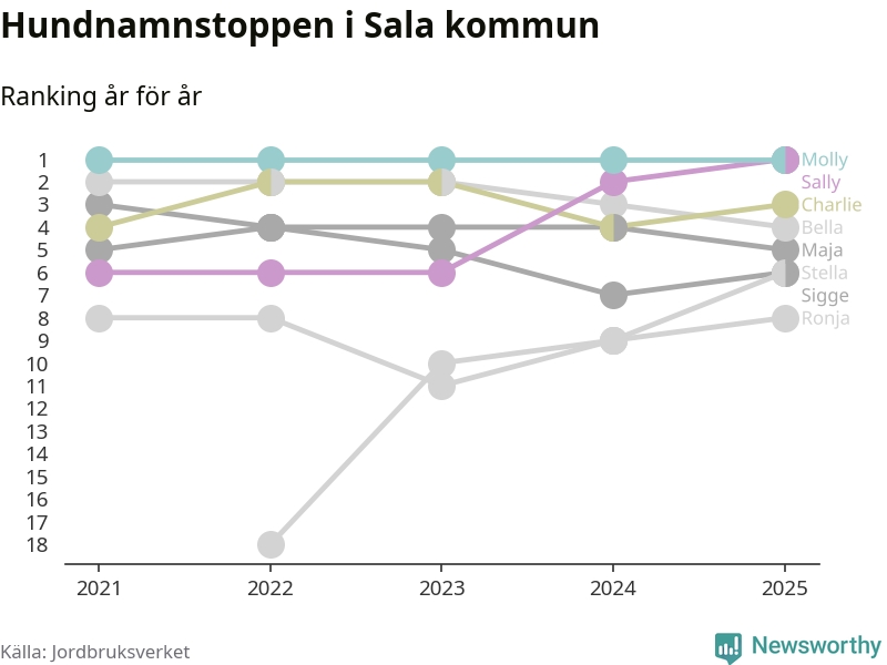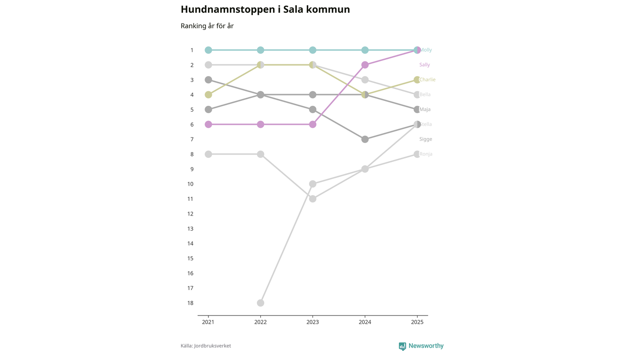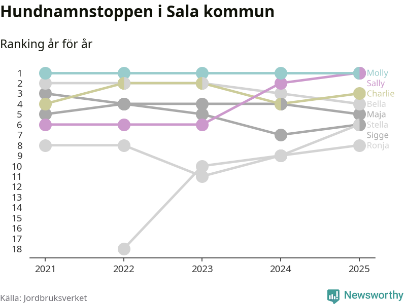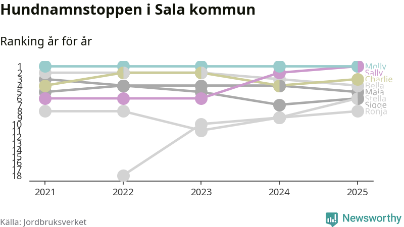 Sally utmanar Molly om förstaplatsen på topplistan över Salas hundnamn, visar ny statistik från Jordbruksverkets hundregister. Namnet delar nu topplaceringen.