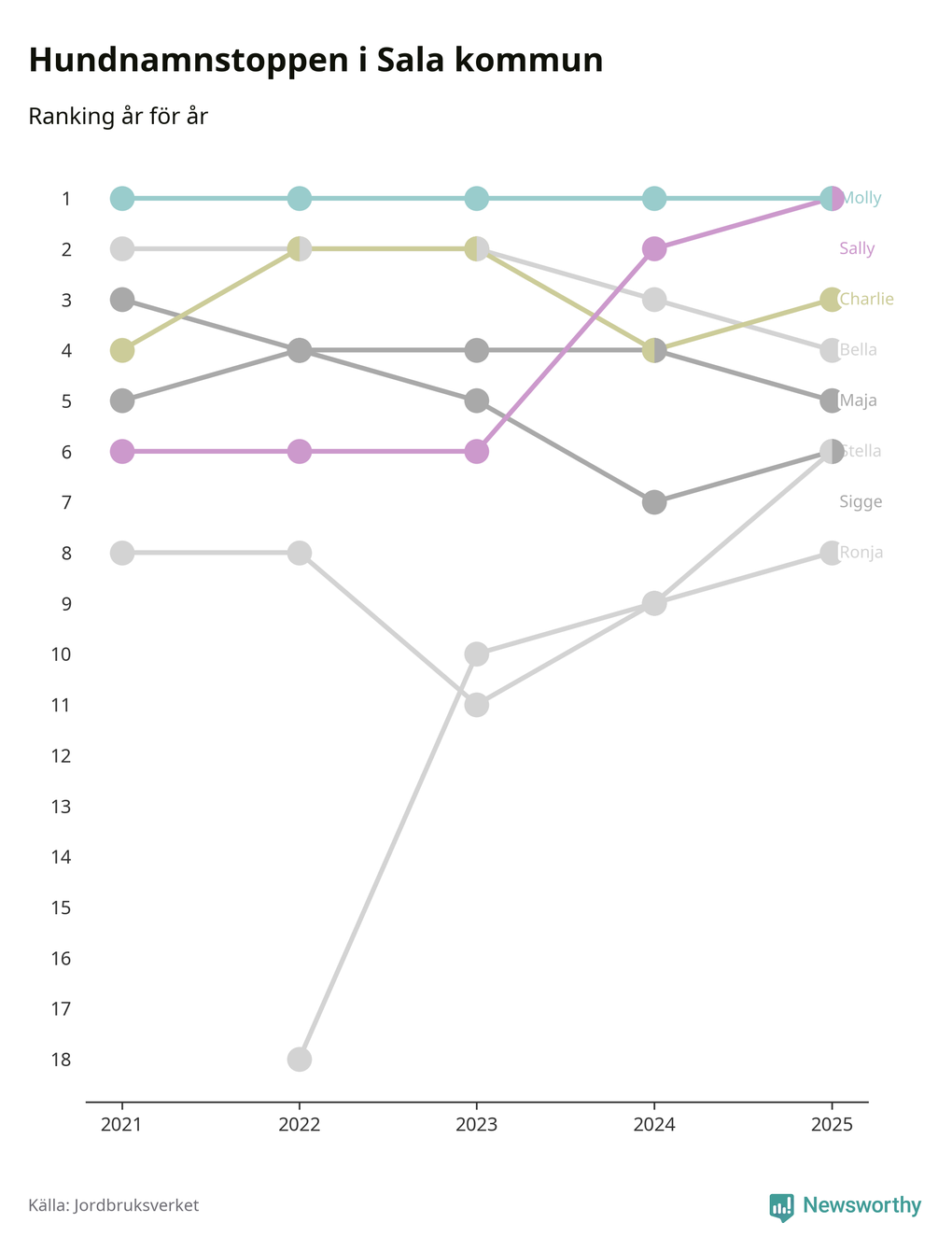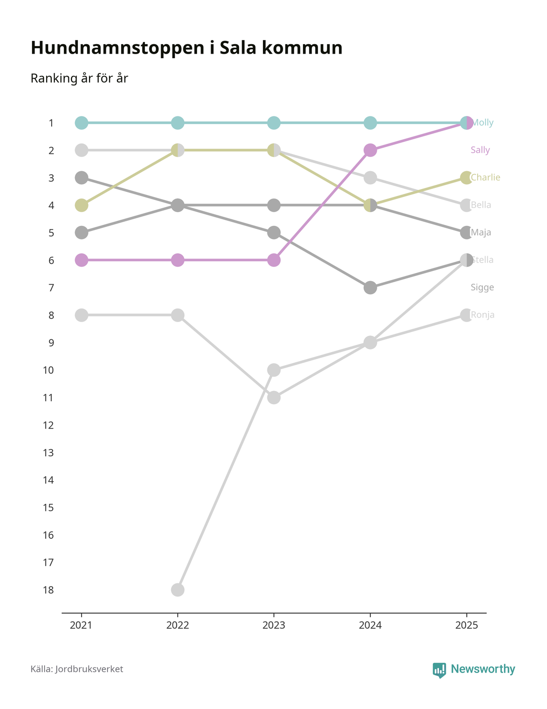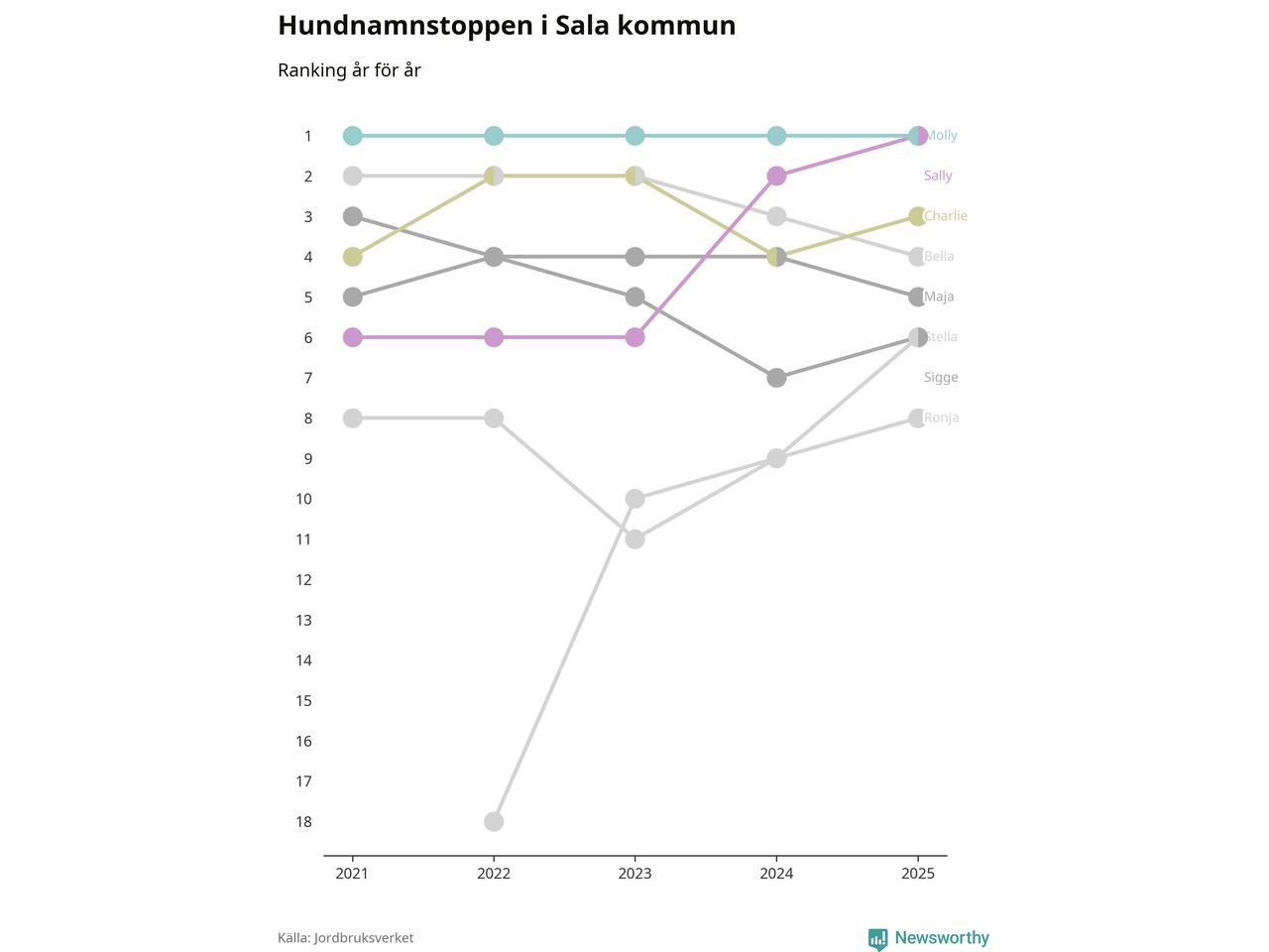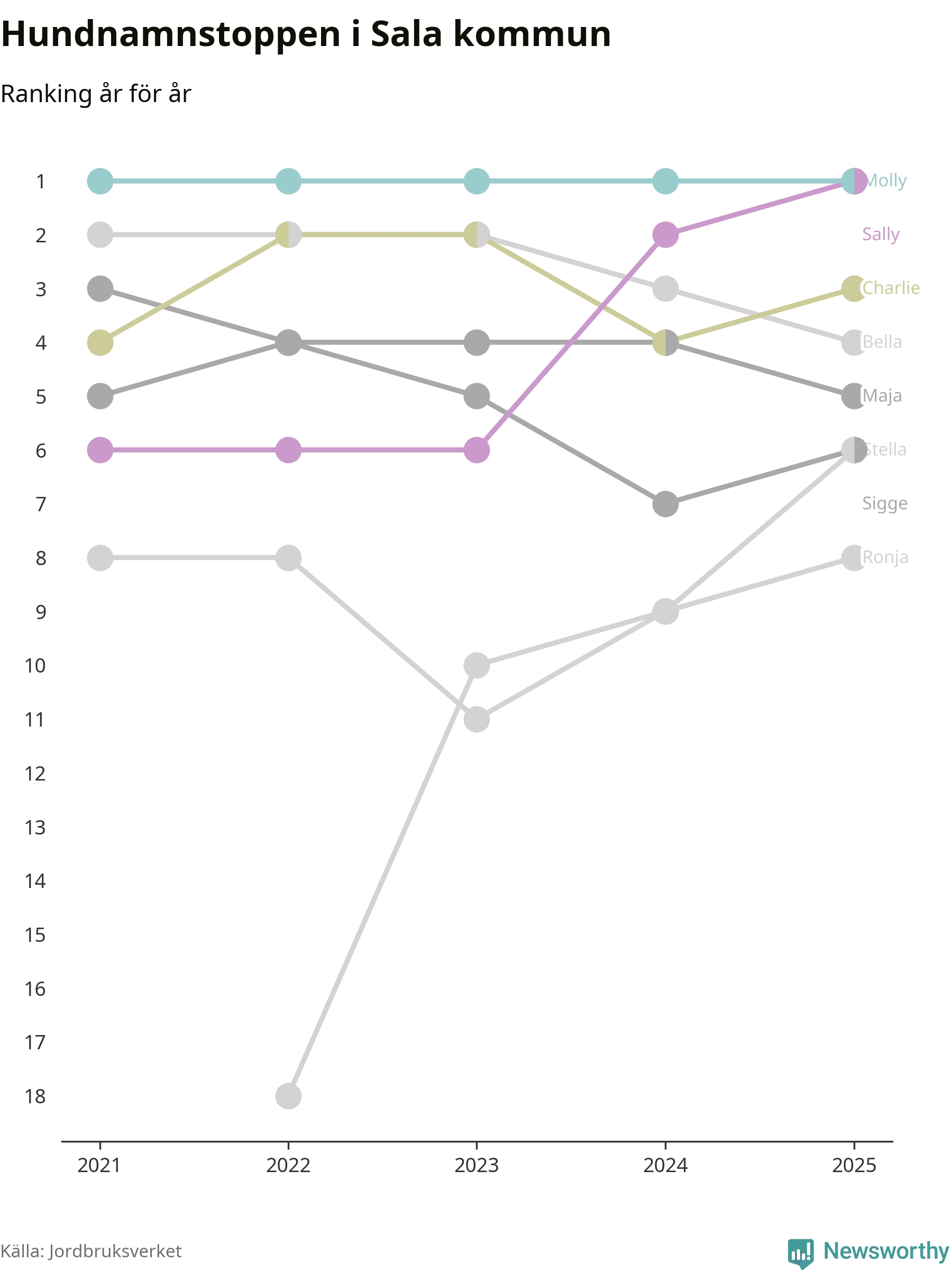 Sally utmanar Molly om förstaplatsen på topplistan över Salas hundnamn, visar ny statistik från Jordbruksverkets hundregister. Namnet delar nu topplaceringen.