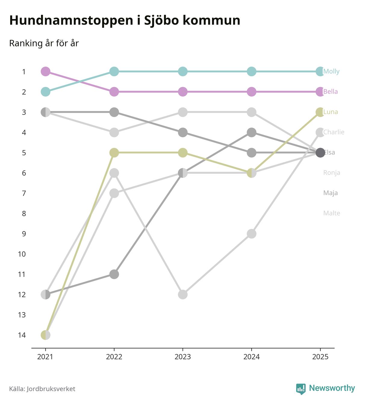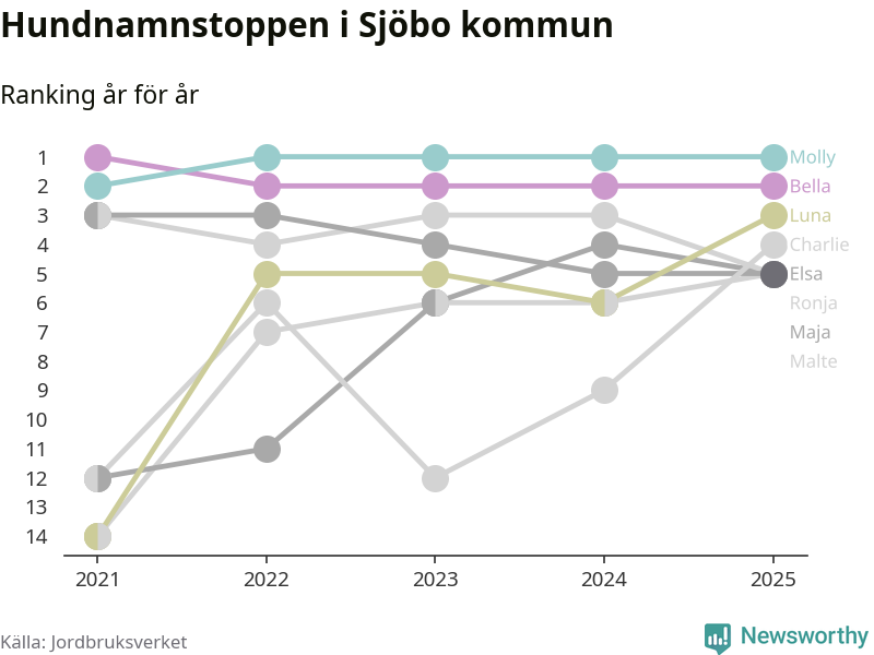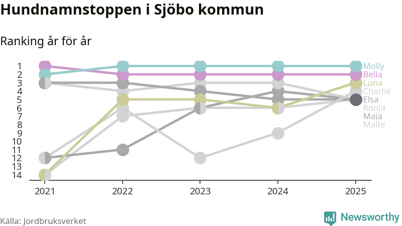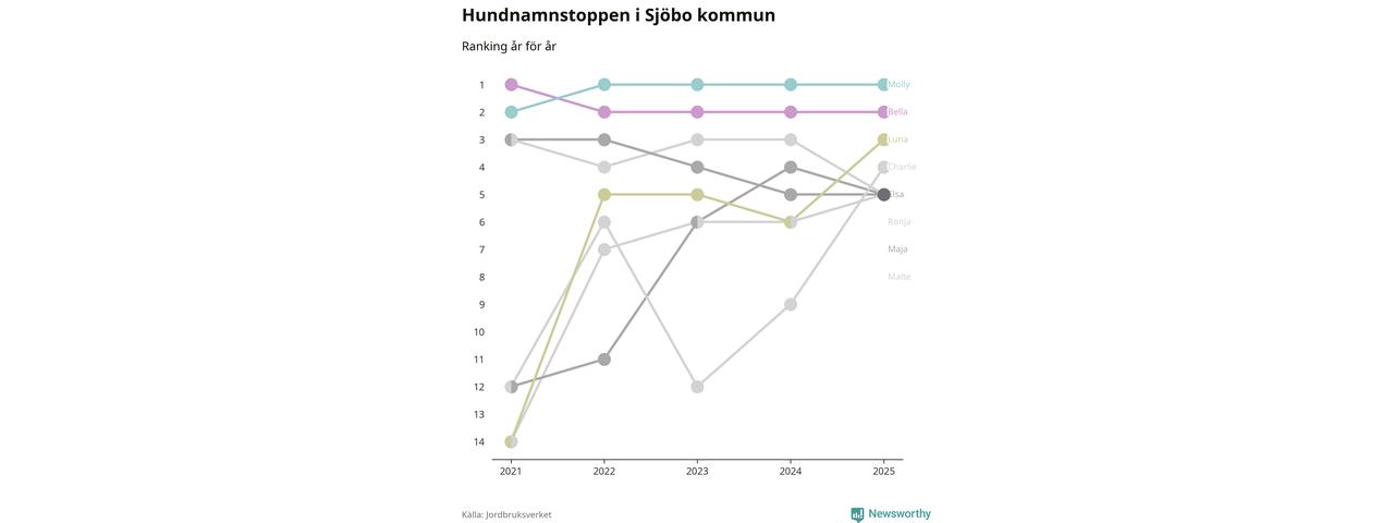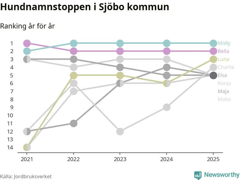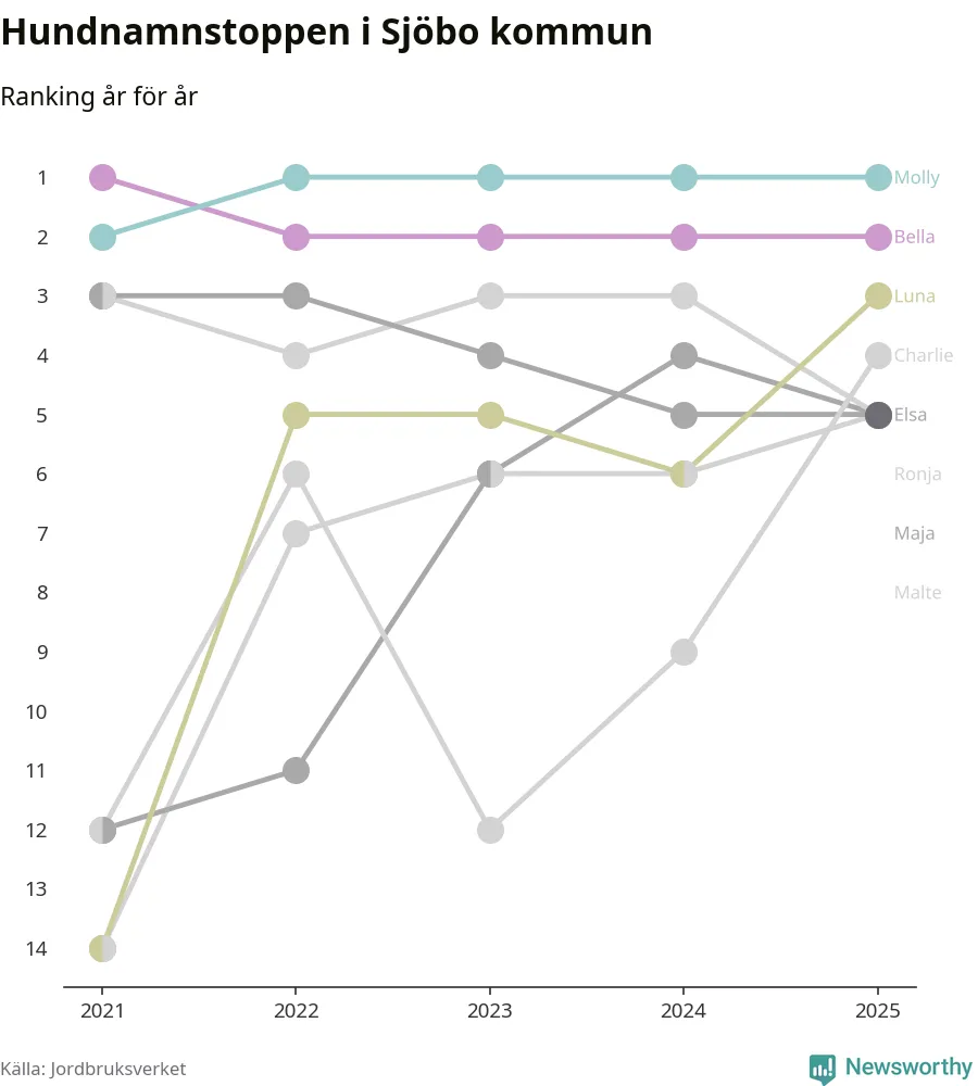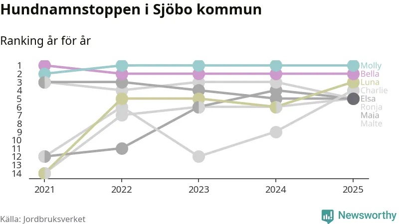 Molly är fortsatt ohotad etta bland hundnamnen i Sverige, följt av Bella och Charlie. Så har det sett ut flera år i rad, och även bland Sjöbohundarna ligger Molly i topp.