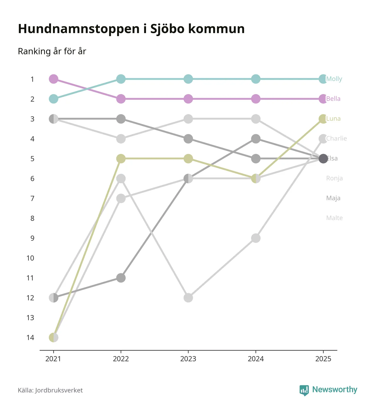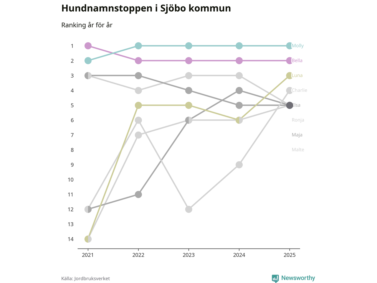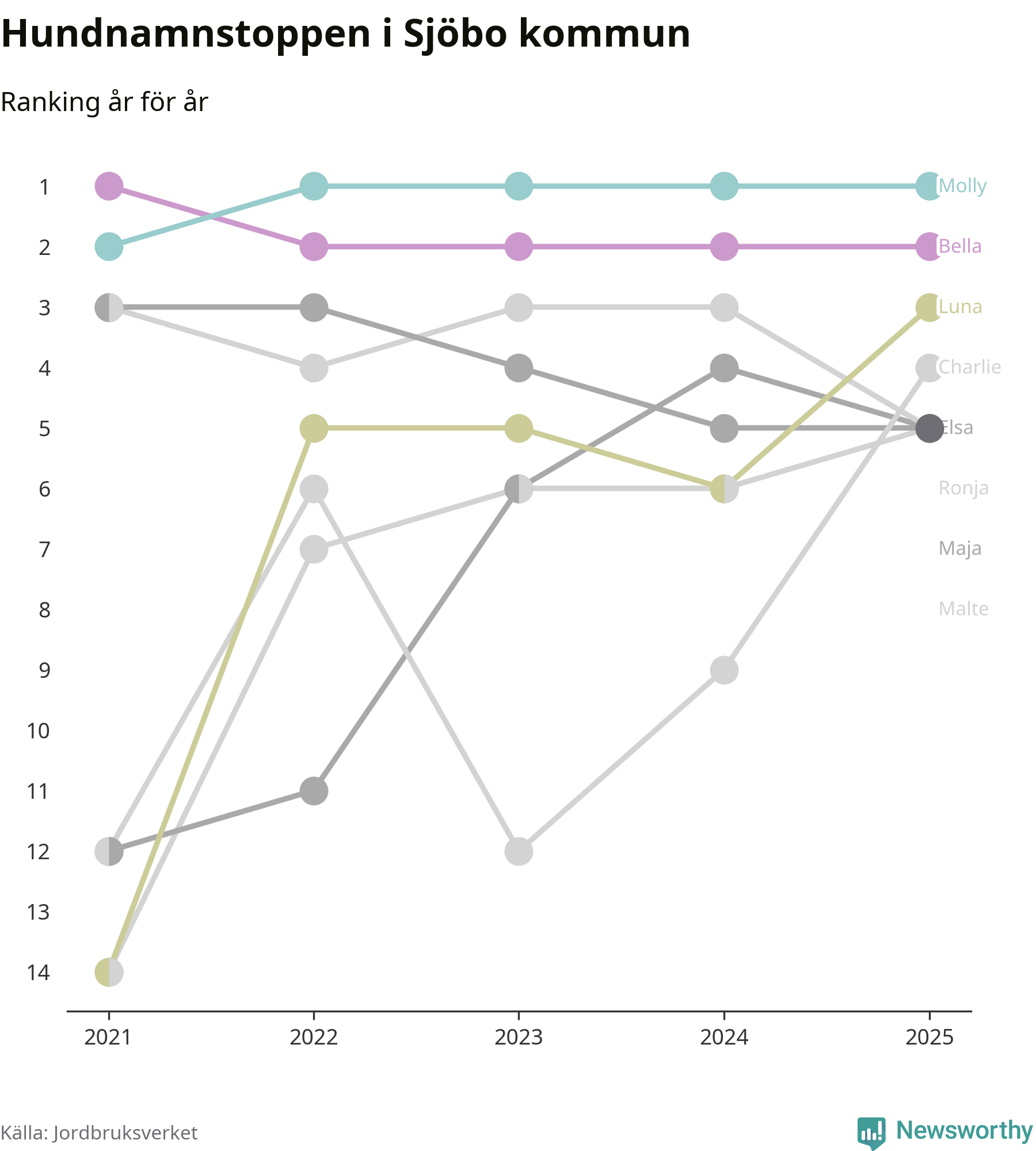 Molly är fortsatt ohotad etta bland hundnamnen i Sverige, följt av Bella och Charlie. Så har det sett ut flera år i rad, och även bland Sjöbohundarna ligger Molly i topp.
