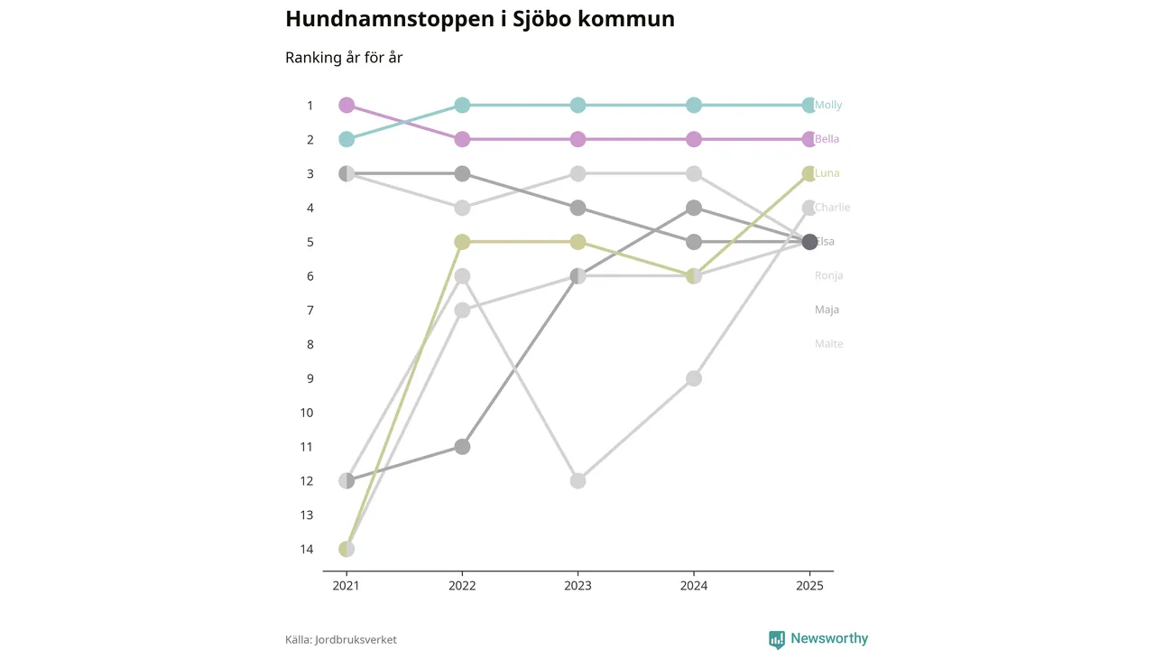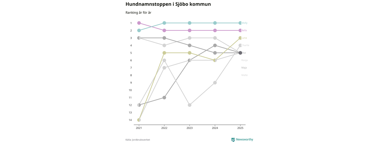 I hela landet är Molly det ohotat populäraste tilltalsnamnet för hundar sedan flera år, följt av Bella och Charlie. Något av de tre namnen toppar listan i 243 av 290 kommuner, och de har varit de vanligaste namnen sedan åtminstone 2018. Men det fjärde populäraste namnet, Doris, knappade in på ledartrion och kommer snart kunna utmana Charlie om tredjeplatsen, om trenden håller i sig.