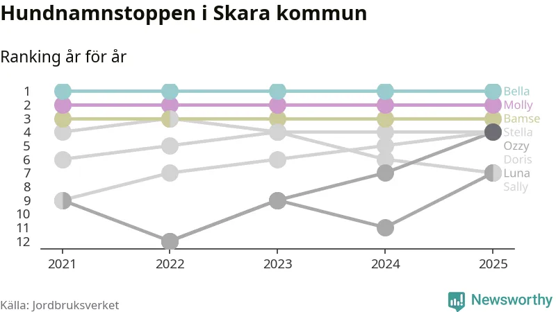 I hela landet är Molly det ohotat populäraste tilltalsnamnet för hundar sedan flera år, följt av Bella och Charlie. Något av de tre namnen toppar listan i 243 av 290 kommuner, och de har varit de vanligaste namnen sedan åtminstone 2018. Men det fjärde populäraste namnet, Doris, knappade in på ledartrion och kommer snart kunna utmana Charlie om tredjeplatsen, om trenden håller i sig.