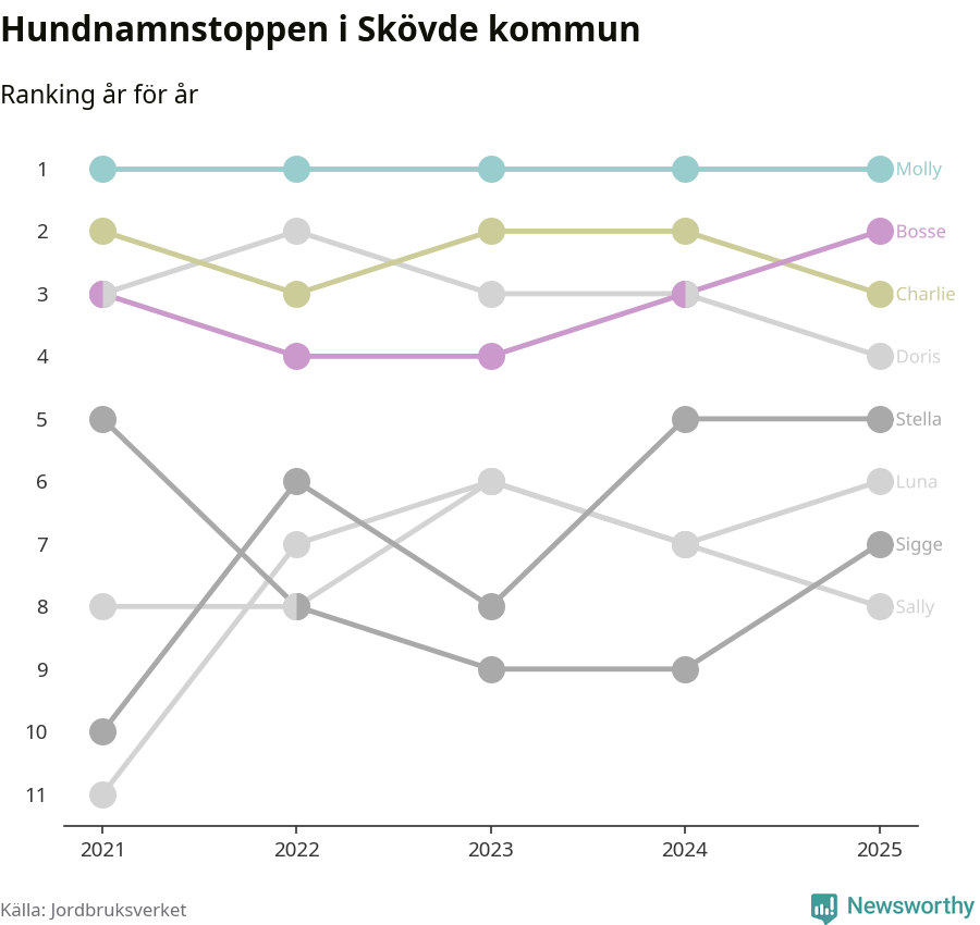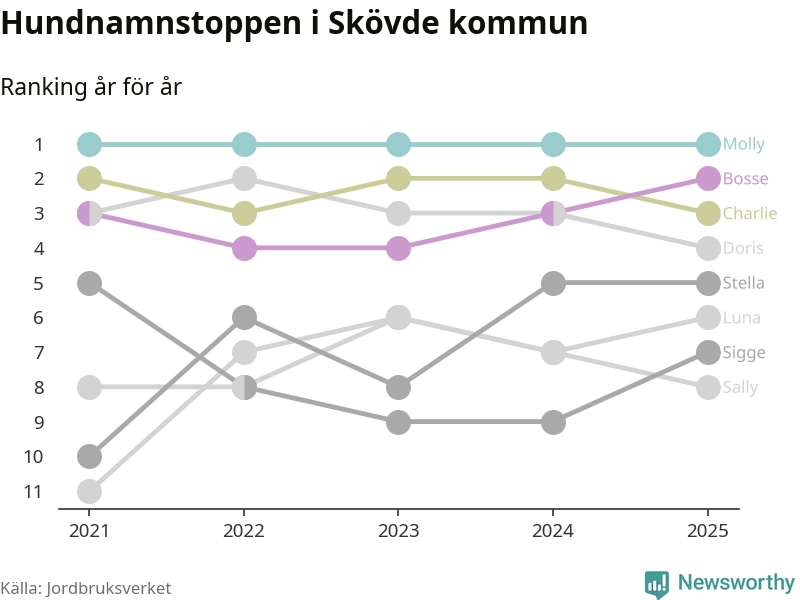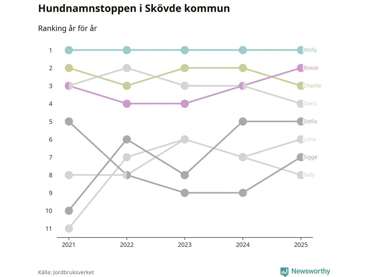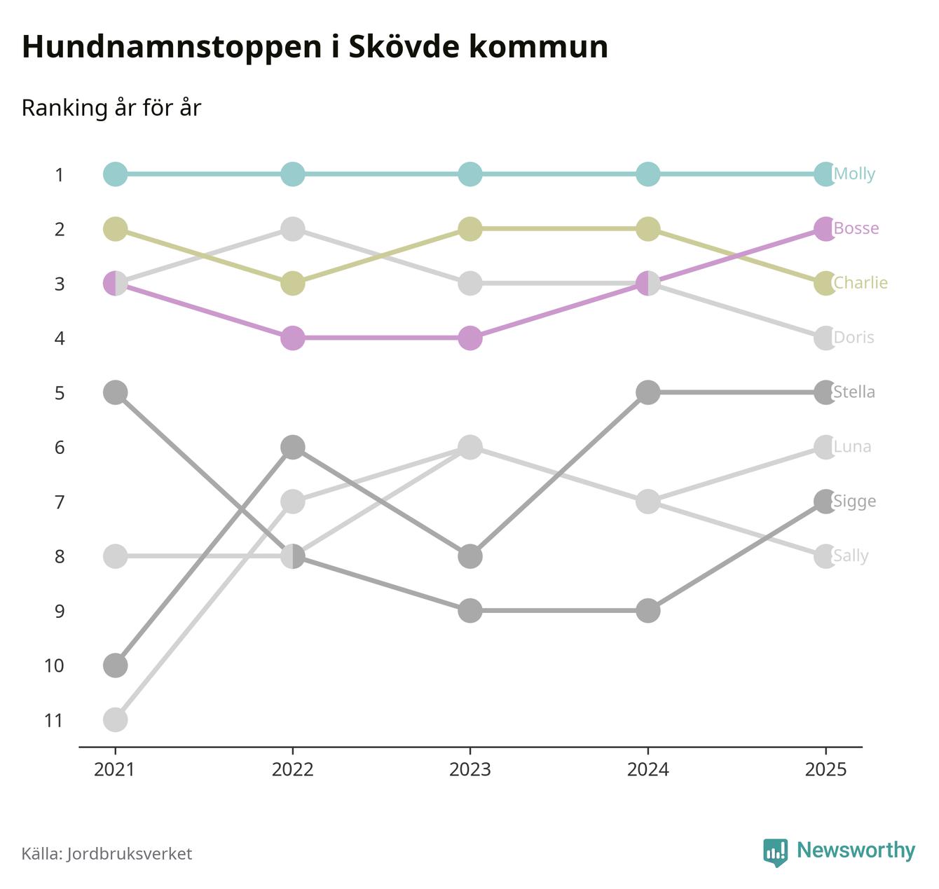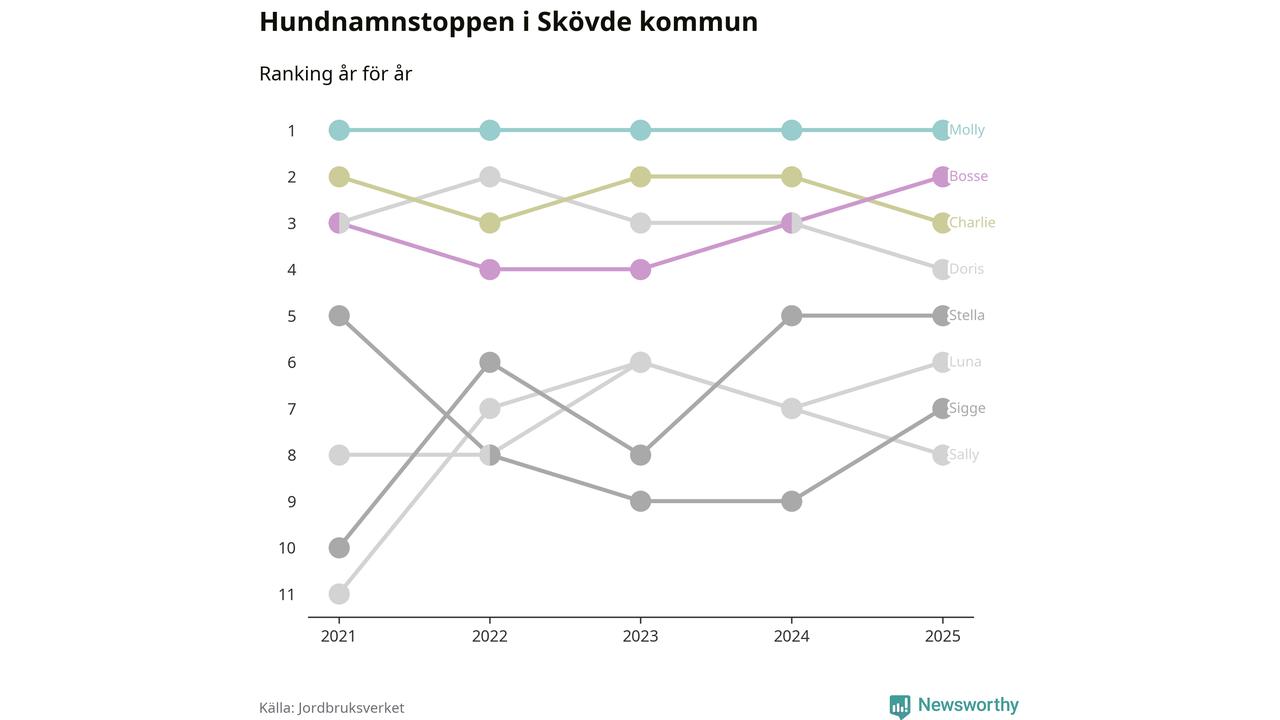 Molly toppar hundnamnsligan i Skövde kommun, precis som i landet som helhet. Det visar färsk statistik från Jordbruksverket. Här finns hela topplistan för kommunen.