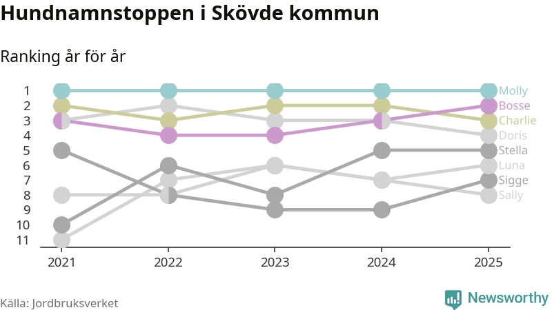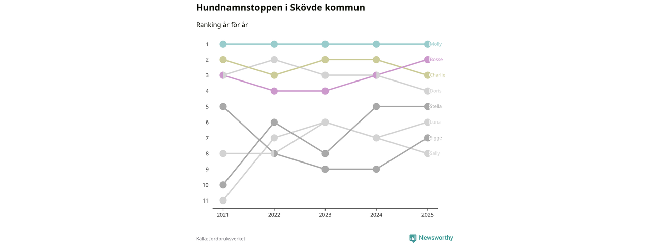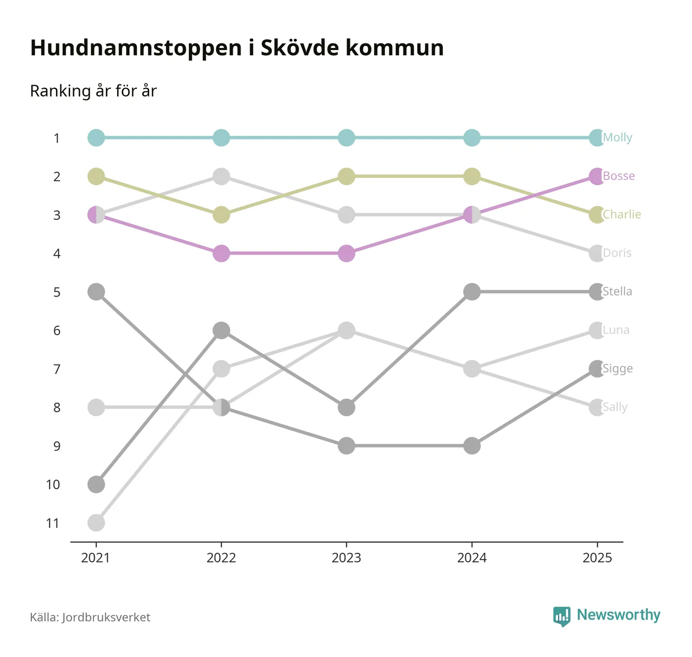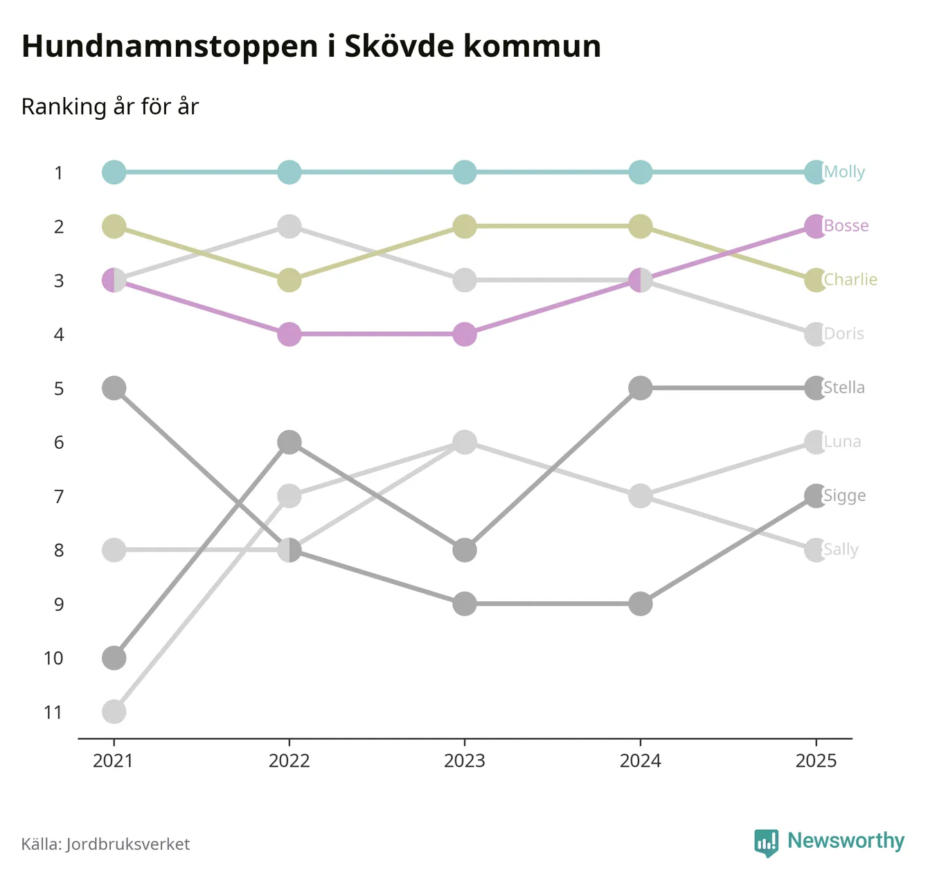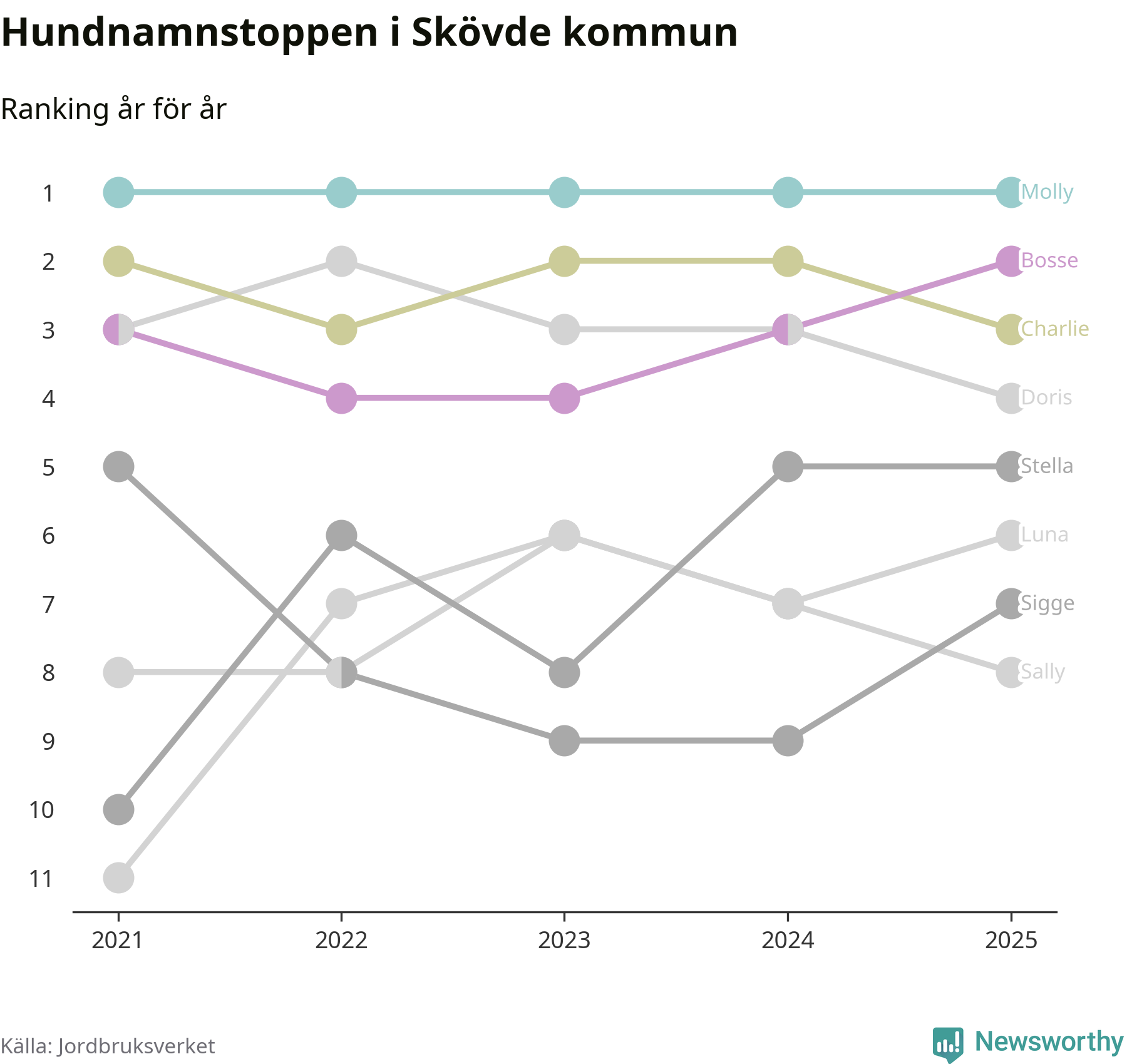 Molly toppar hundnamnsligan i Skövde kommun, precis som i landet som helhet. Det visar färsk statistik från Jordbruksverket. Här finns hela topplistan för kommunen.