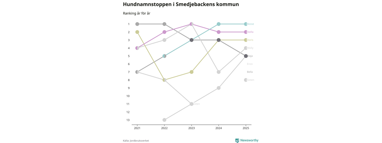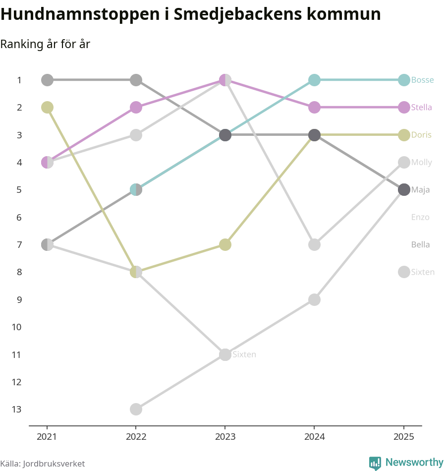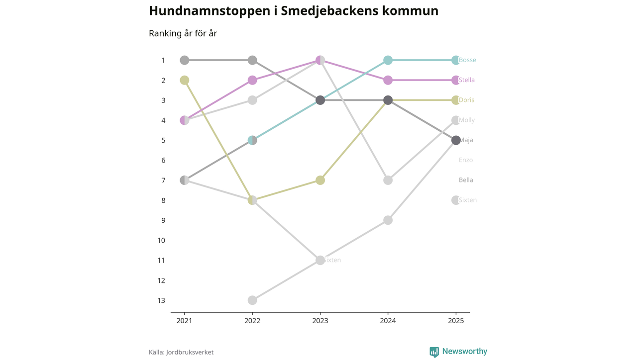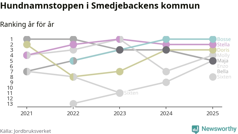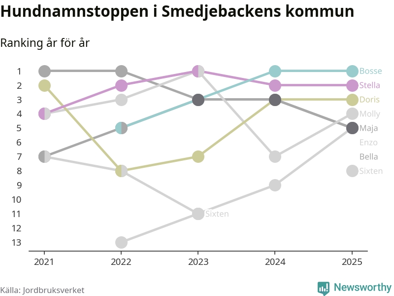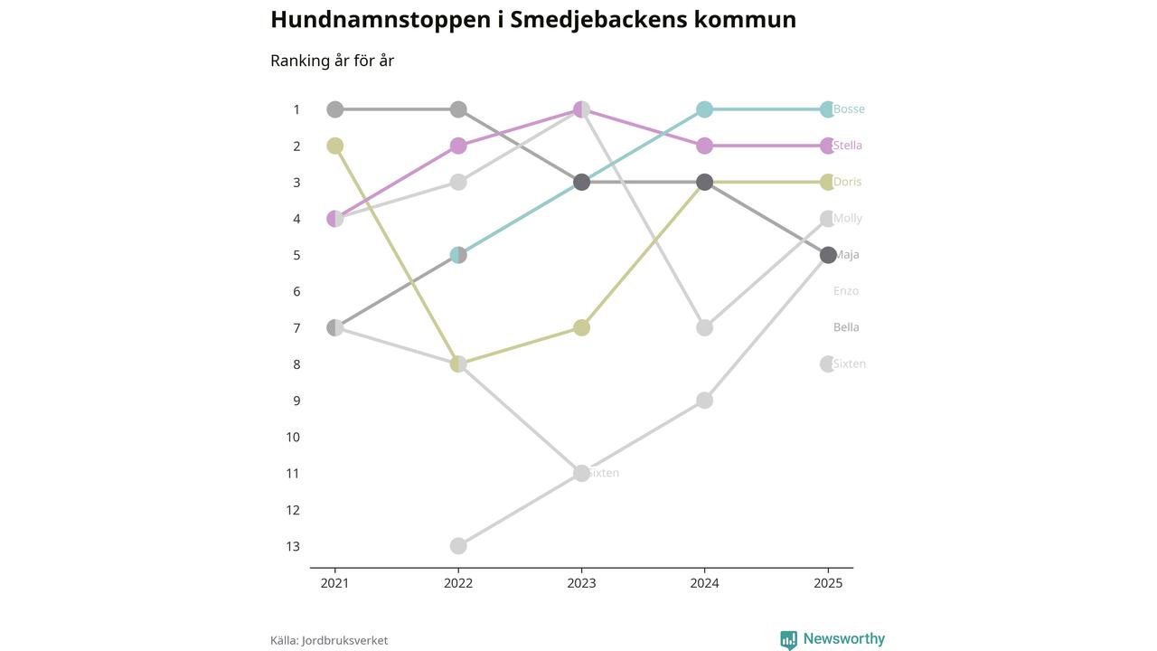 Molly är fortsatt ohotad etta bland hundnamnen i Sverige, följt av Bella och Charlie. Så har det sett ut flera år i rad, men bland Smedjebackenshundarna är Bosse populärast. Smedjebacken är en av åtta kommuner i landet där Bosse är vanligast, eller på delad förstaplats.
