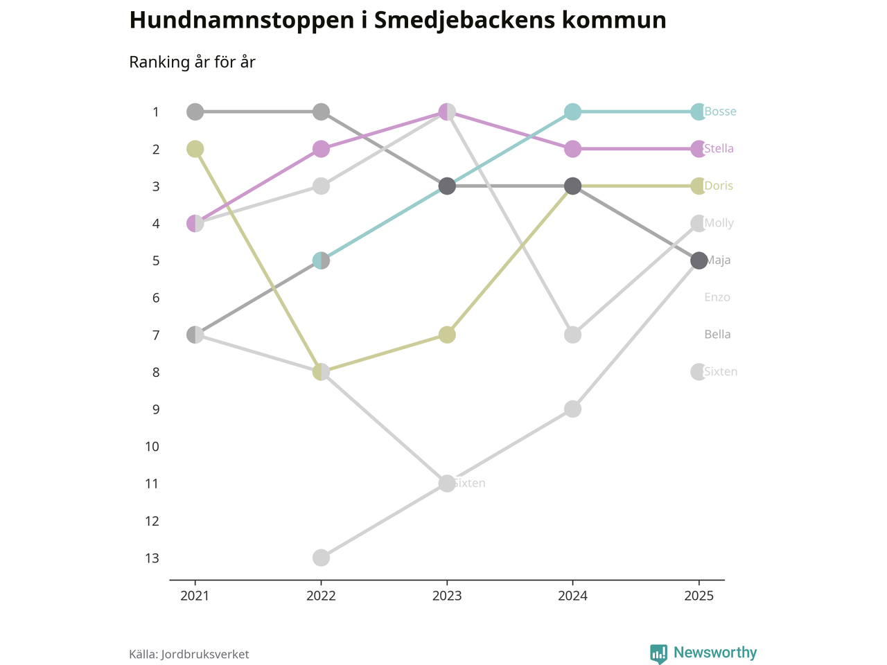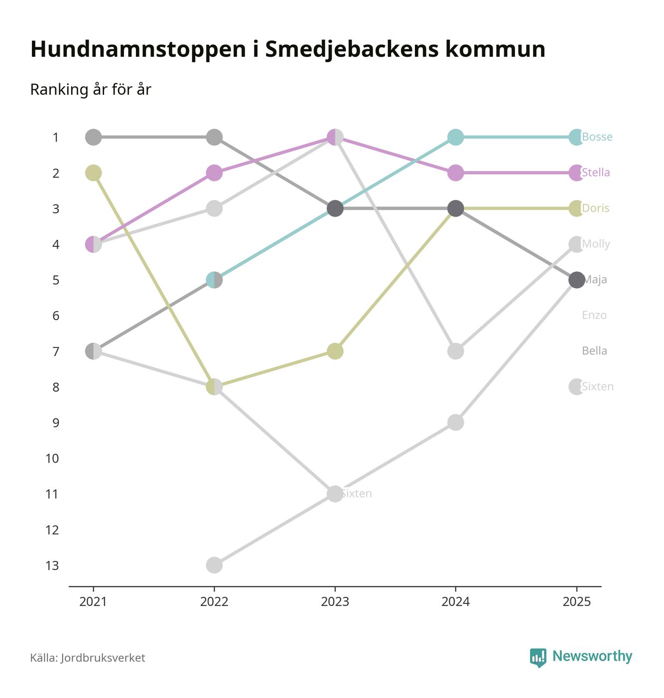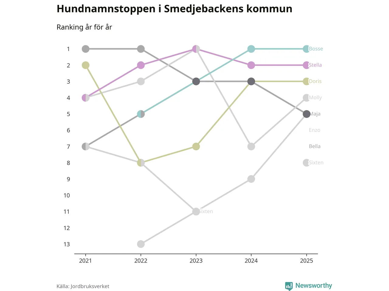 I hela landet är Molly det ohotat populäraste tilltalsnamnet för hundar sedan flera år, följt av Bella och Charlie. Något av de tre namnen toppar listan i 243 av 290 kommuner, och de har varit de vanligaste namnen sedan åtminstone 2018. Men det fjärde populäraste namnet, Doris, knappade in på ledartrion och kommer snart kunna utmana Charlie om tredjeplatsen, om trenden håller i sig.