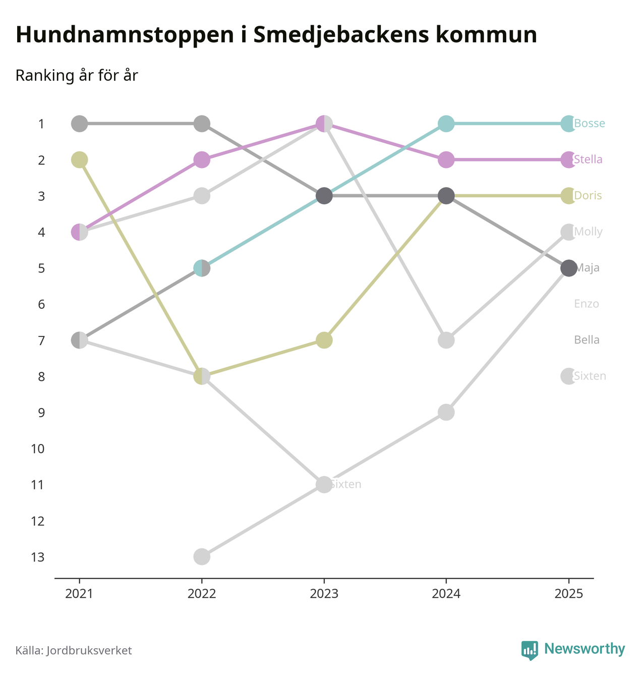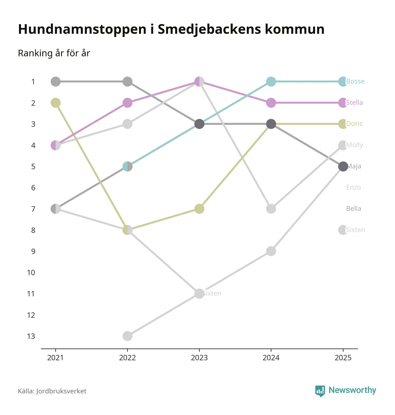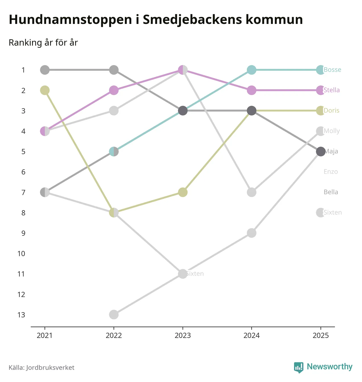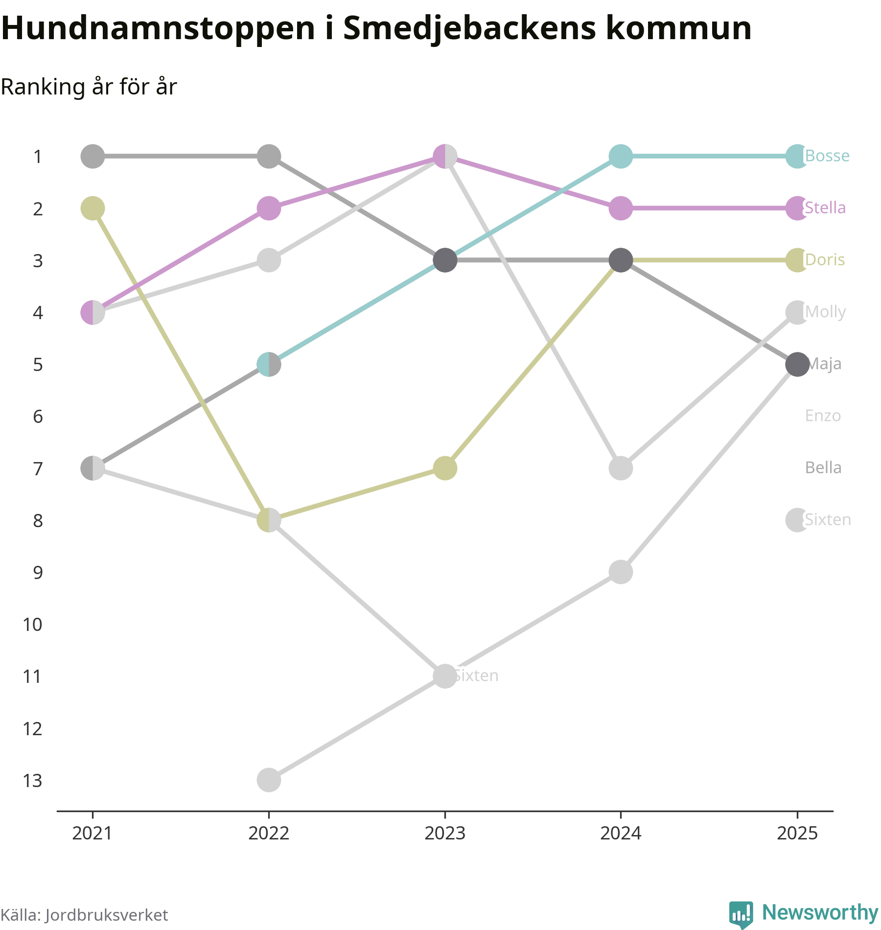 I hela landet är Molly det ohotat populäraste tilltalsnamnet för hundar sedan flera år, följt av Bella och Charlie. Något av de tre namnen toppar listan i 243 av 290 kommuner, och de har varit de vanligaste namnen sedan åtminstone 2018. Men det fjärde populäraste namnet, Doris, knappade in på ledartrion och kommer snart kunna utmana Charlie om tredjeplatsen, om trenden håller i sig.