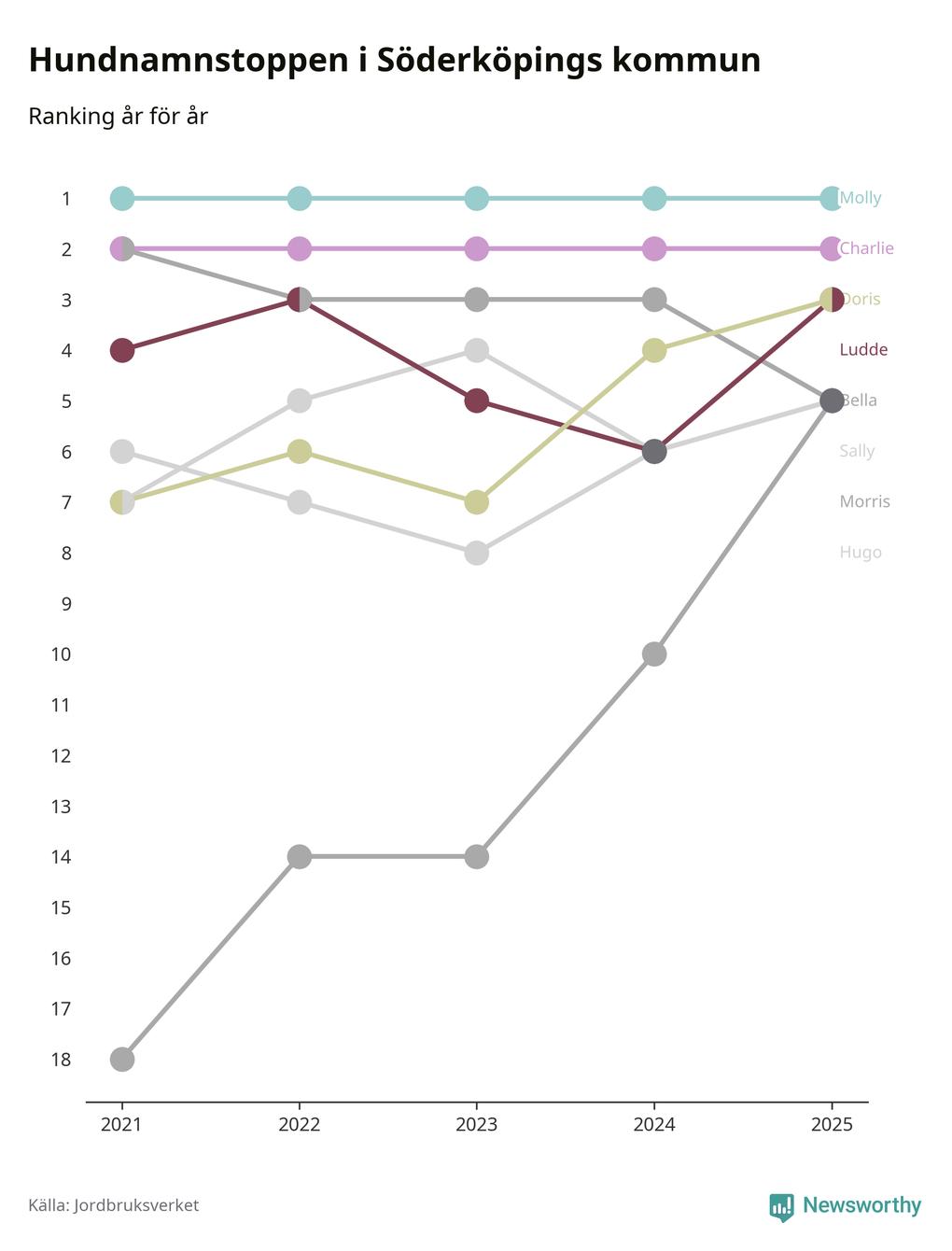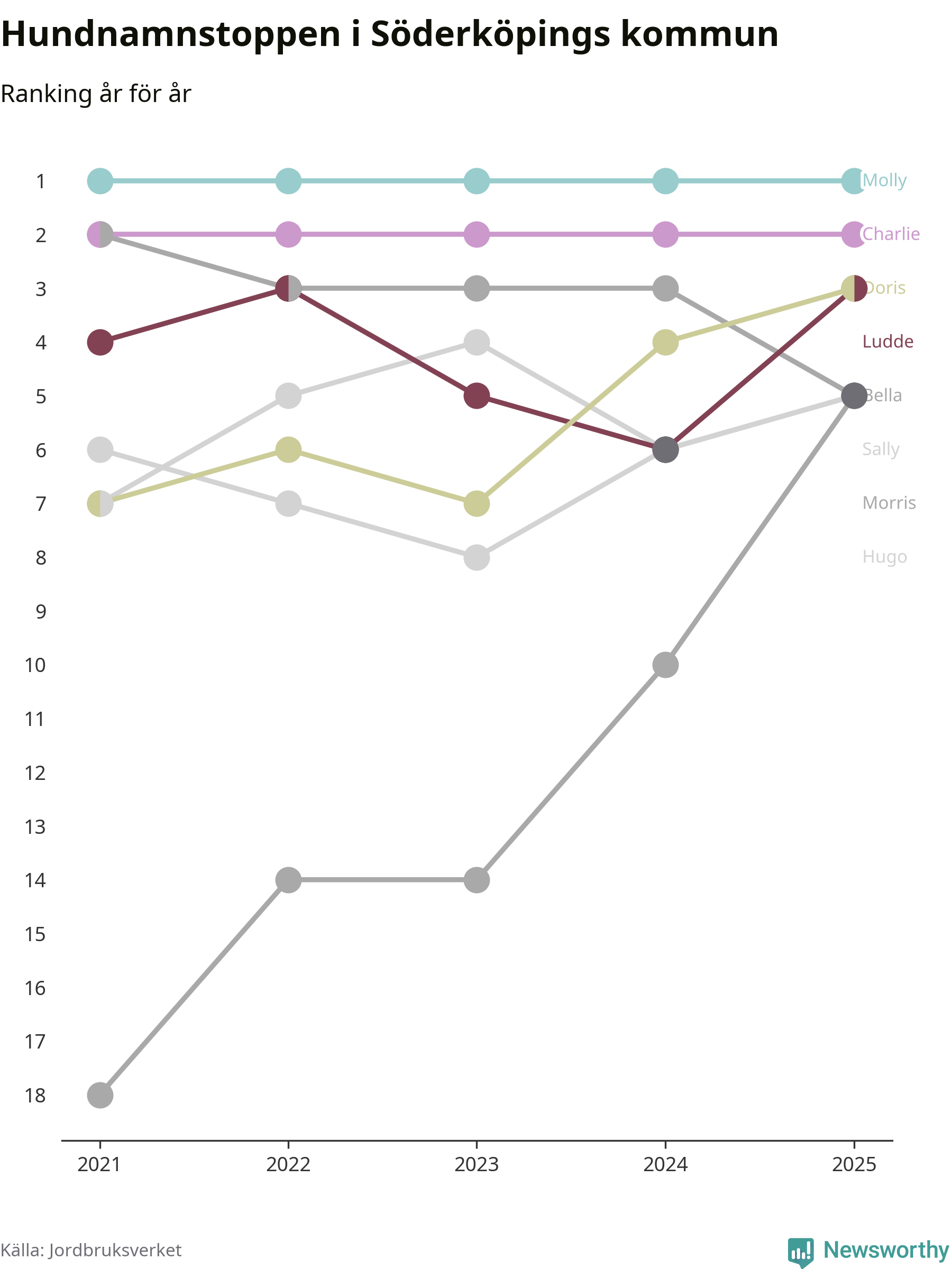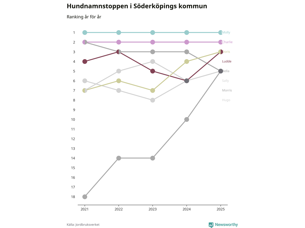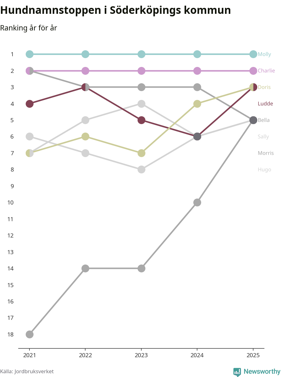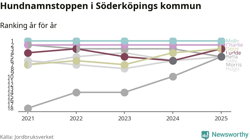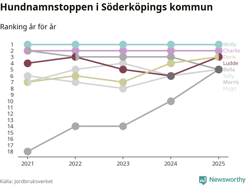 I hela landet är Molly det ohotat populäraste tilltalsnamnet för hundar sedan flera år, följt av Bella och Charlie. Något av de tre namnen toppar listan i 243 av 290 kommuner, och de har varit de vanligaste namnen sedan åtminstone 2018. Men det fjärde populäraste namnet, Doris, knappade in på ledartrion och kommer snart kunna utmana Charlie om tredjeplatsen, om trenden håller i sig.