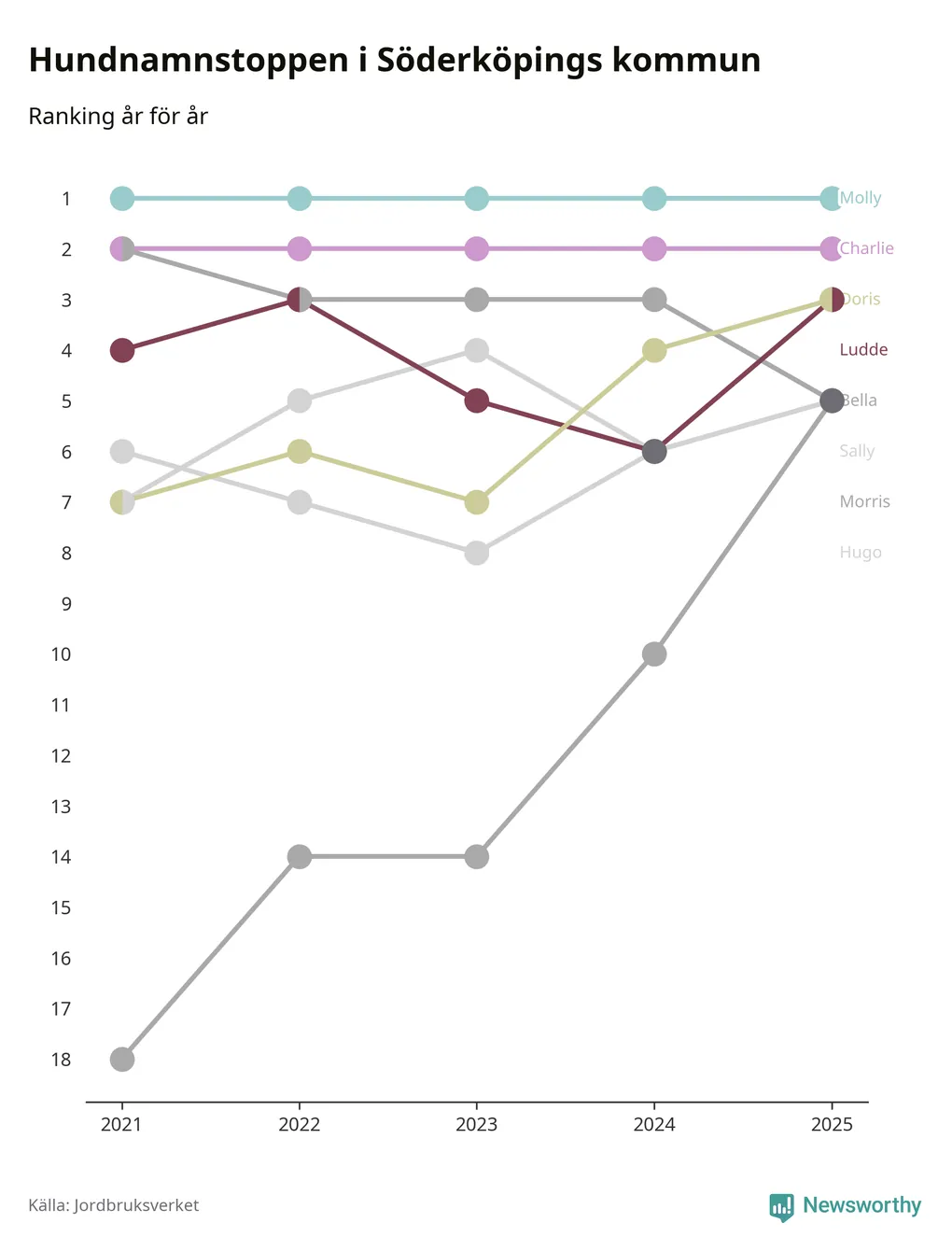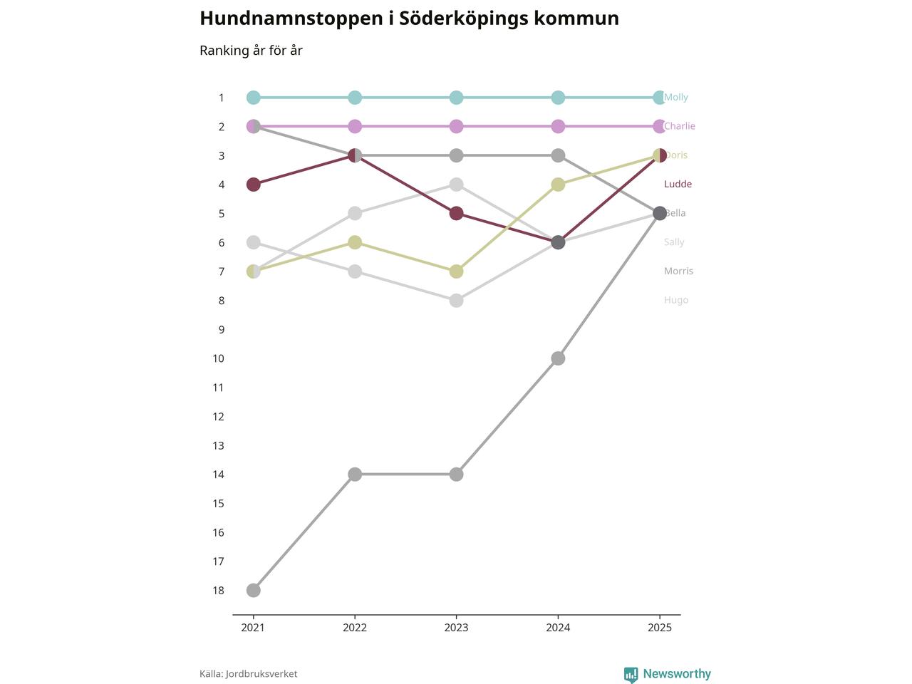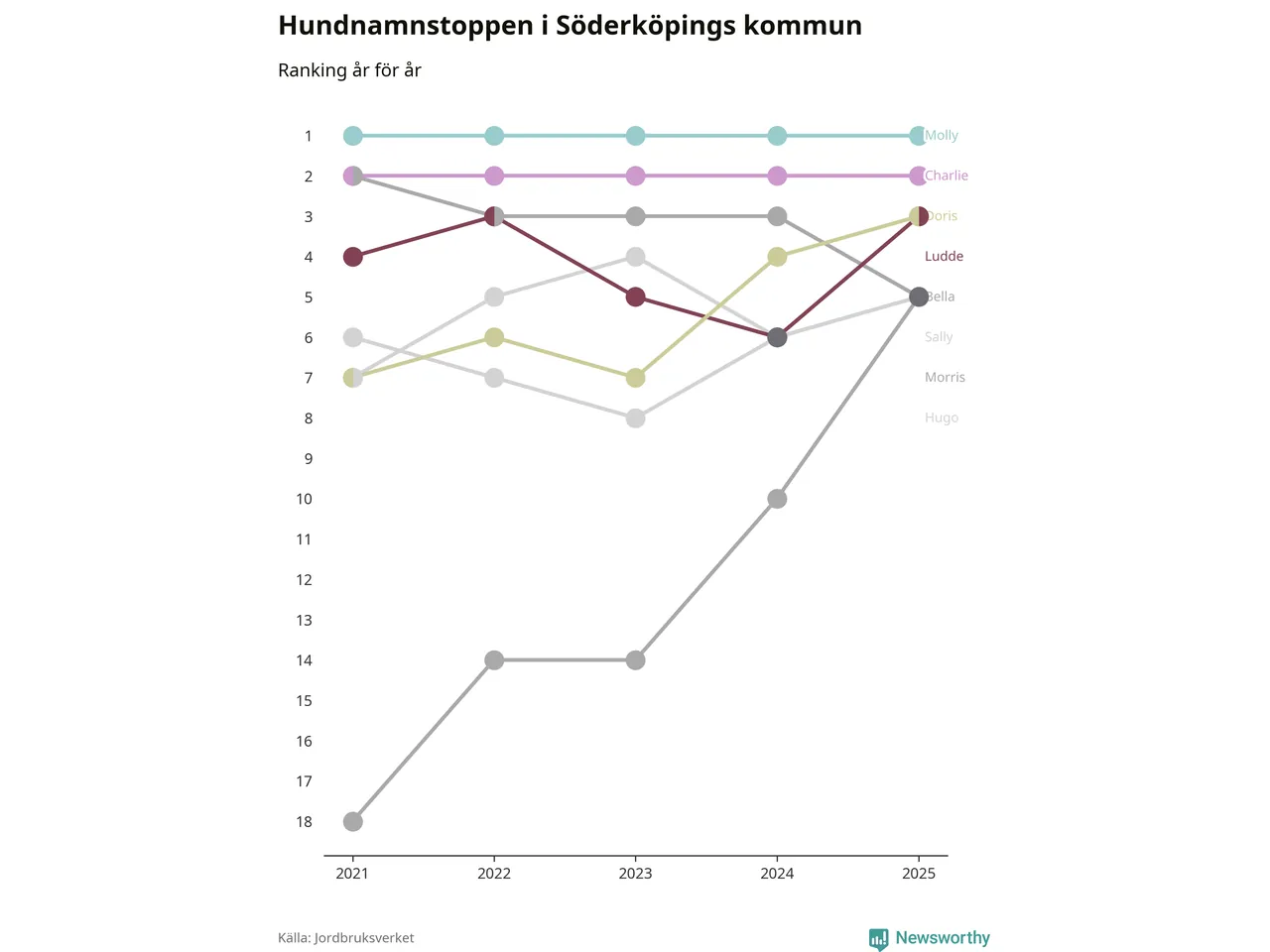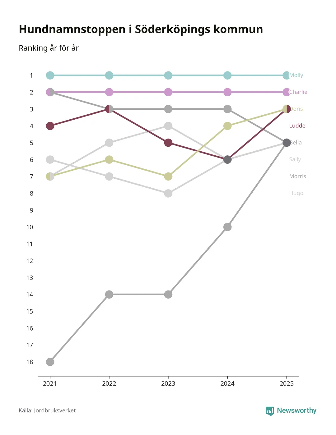 I hela landet är Molly det ohotat populäraste tilltalsnamnet för hundar sedan flera år, följt av Bella och Charlie. Något av de tre namnen toppar listan i 243 av 290 kommuner, och de har varit de vanligaste namnen sedan åtminstone 2018. Men det fjärde populäraste namnet, Doris, knappade in på ledartrion och kommer snart kunna utmana Charlie om tredjeplatsen, om trenden håller i sig.