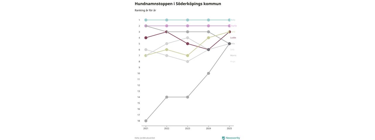 Molly är fortsatt ohotad etta bland hundnamnen i Sverige, följt av Bella och Charlie. Så har det sett ut flera år i rad, och även bland Söderköpingshundarna ligger Molly i topp.