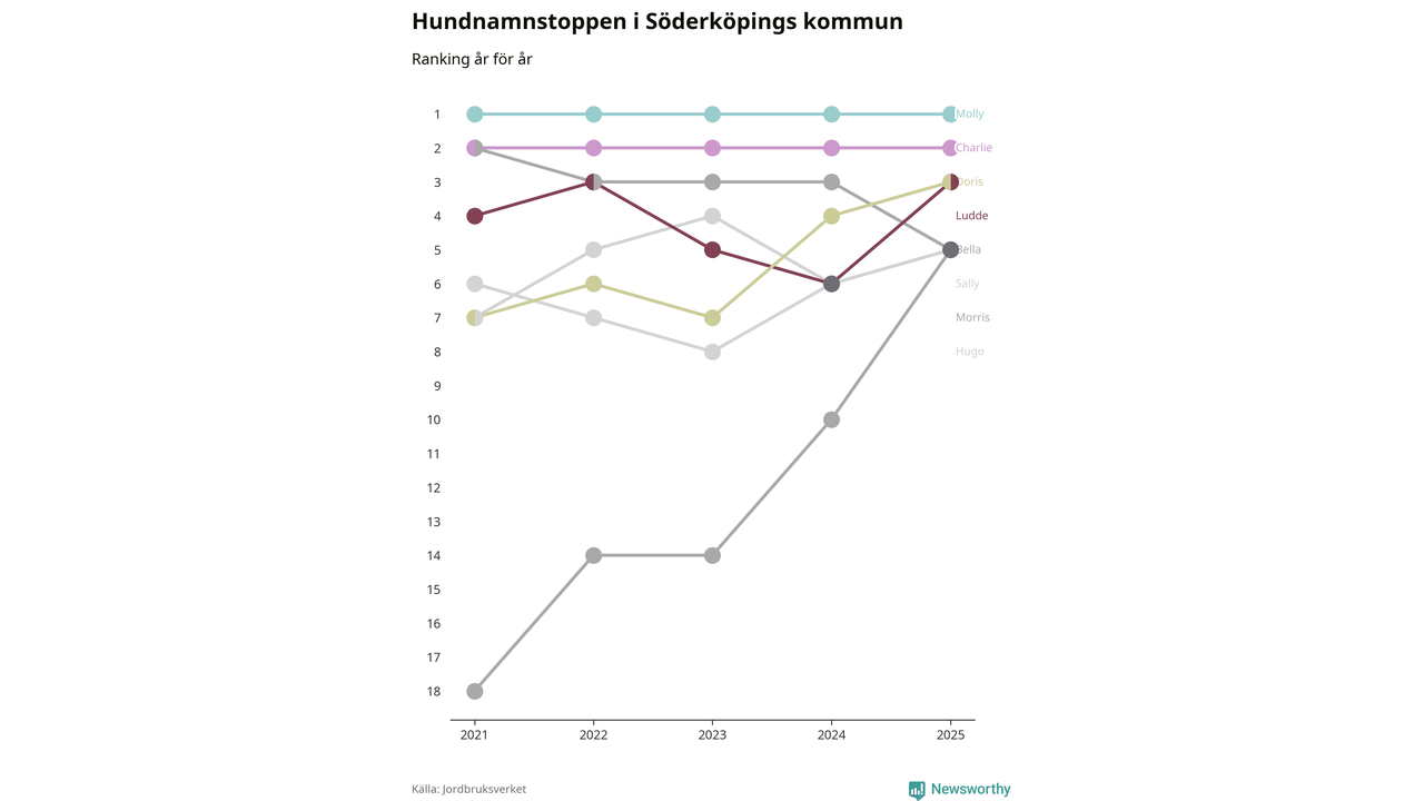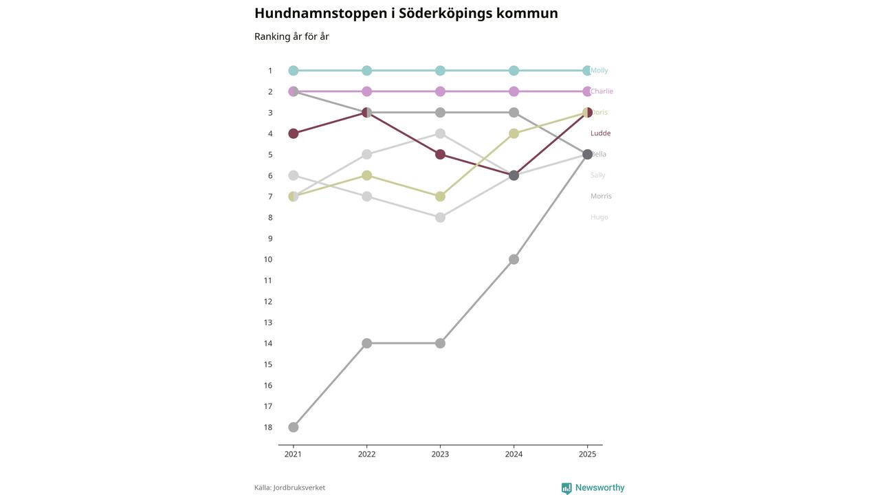 Morris och Luna klättrar på topplistan bland Söderköpings hundnamn, visar ny statistik från Jordbruksverkets hundregister.