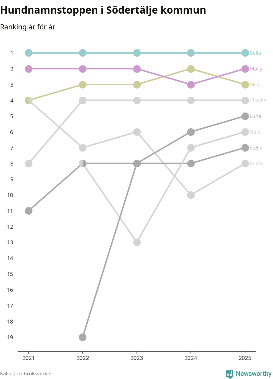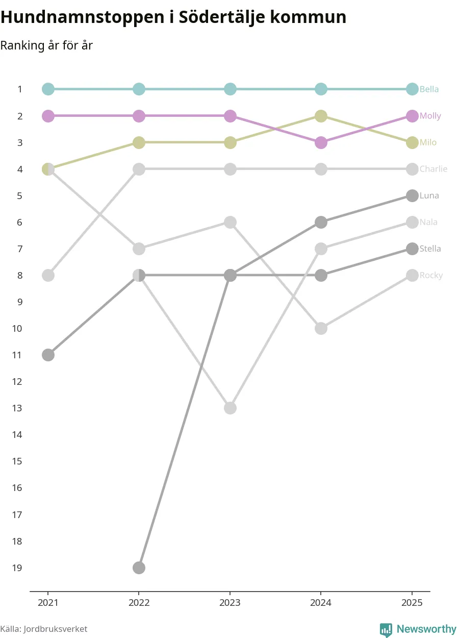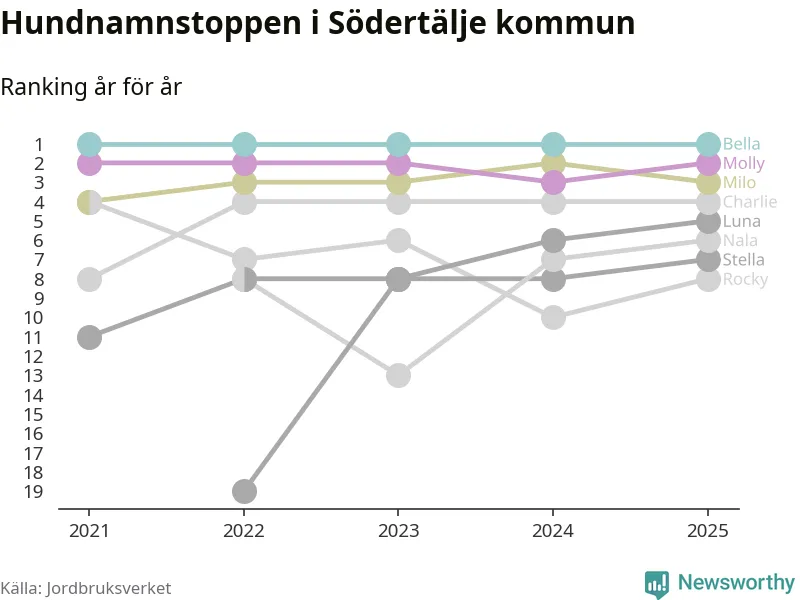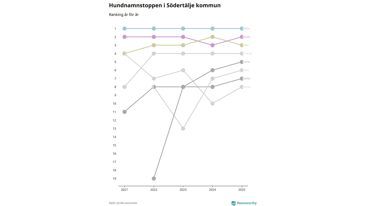 Molly är fortsatt ohotad etta bland hundnamnen i Sverige, följt av Bella och Charlie. Så har det sett ut flera år i rad, men bland Södertäljehundarna är Bella populärast.